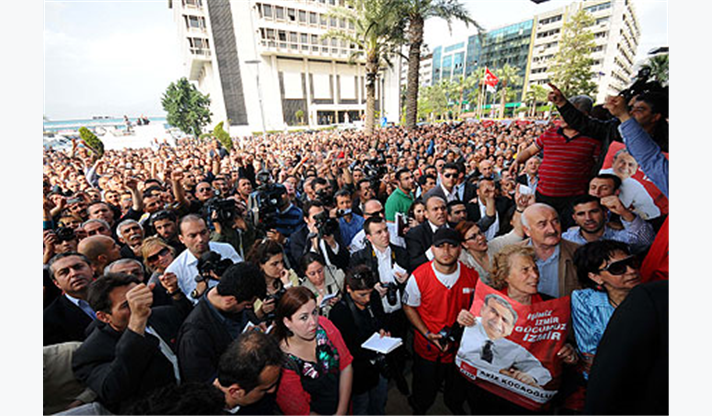 Sabah saatlerinde İzmir Emniyet Müdürlüğü’ne bağlı ekiplerin İzmir Büyükşehir Belediyesi ve birimlerine yönelik operasyonu sonrasında Belediye önünde toplanan İzmirliler, Başkan Aziz Kocaoğlu’na destek verdi.