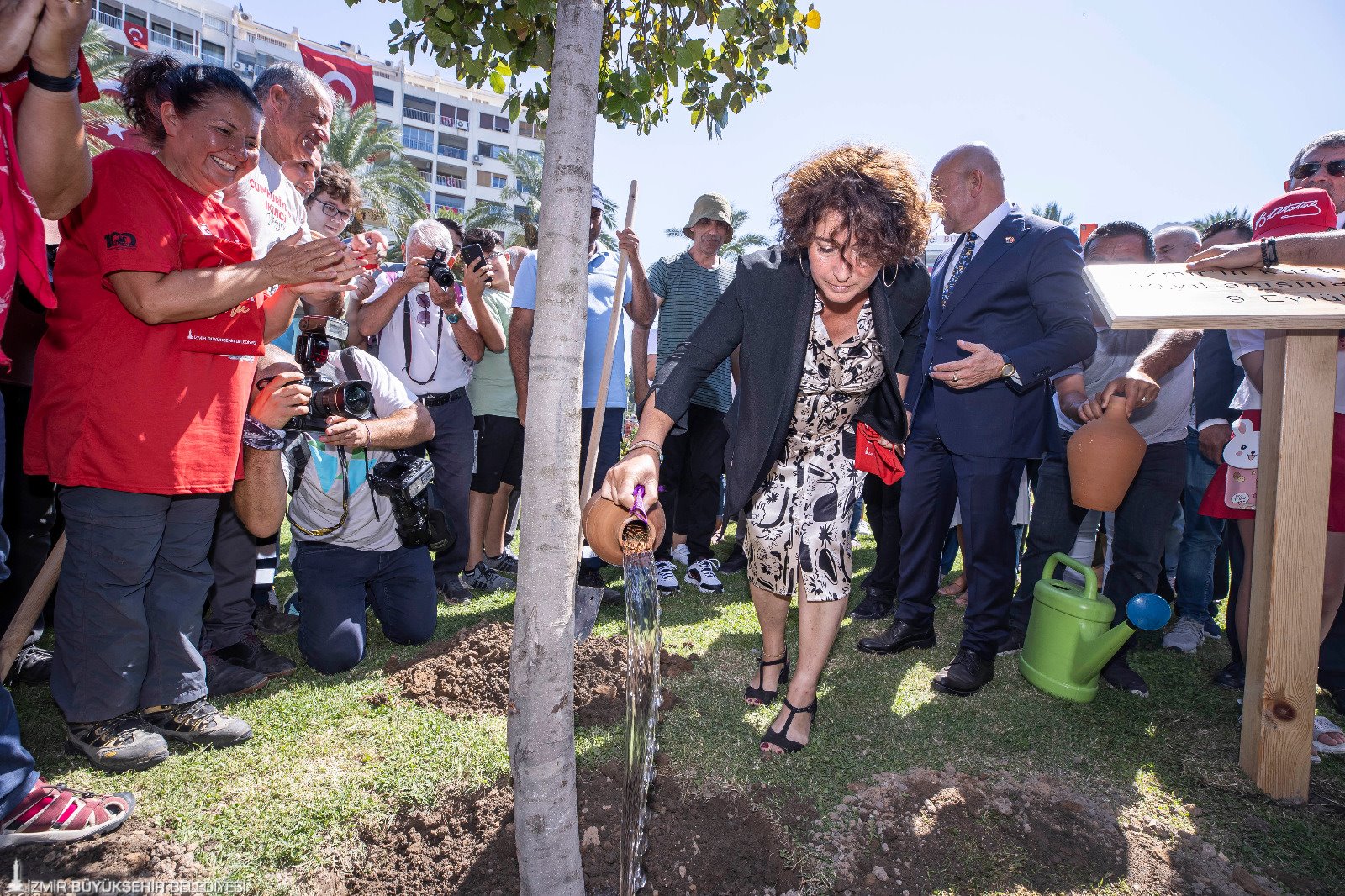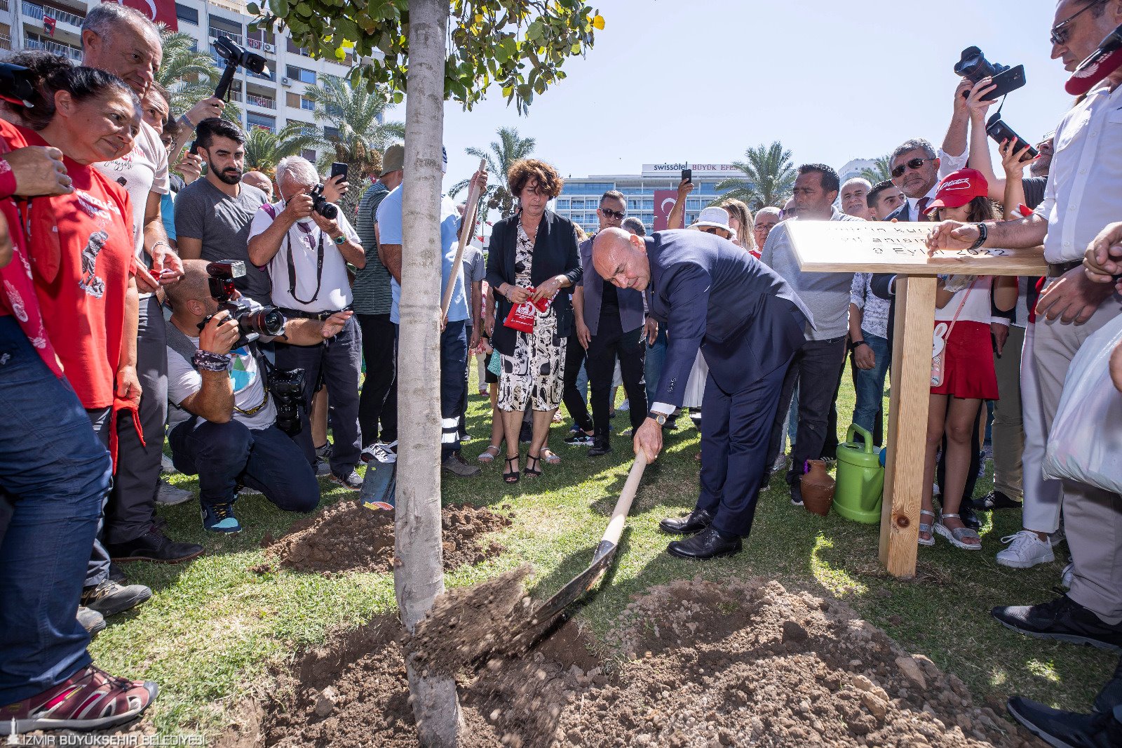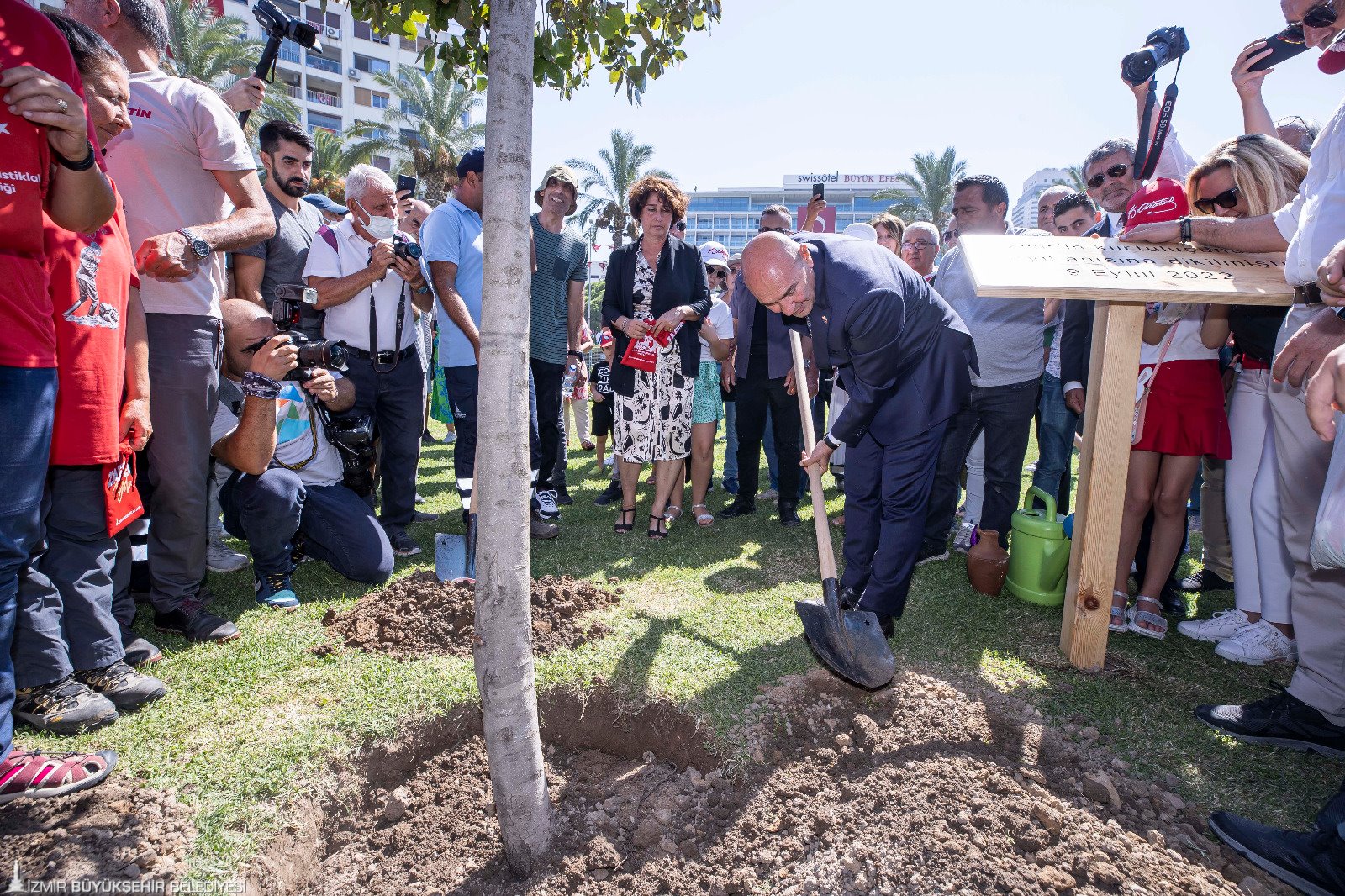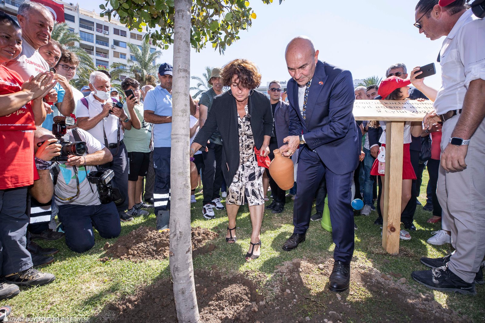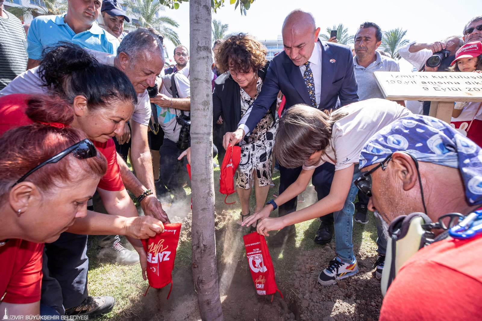 Törende Başkan Soyer ve eşi Neptün Soyer Cumhuriyet Meydanı’na İzmir’in kurtuluşunun 100’üncü yılı anısına meşe fidanı dikti. Fidan dikerken Afyon’dan İzmir’e gelen Zafer Yürüyüşü kafilesinin 400 kilometrelik güzergâhta şehitliklerden topladığı toprak, İzmir toprağıyda buluşturuldu. Törende İzmir Büyükşehir Belediyesi Dans ve Ritim Topluluğu’nun gösterileri renkli görüntülere sahne oldu.