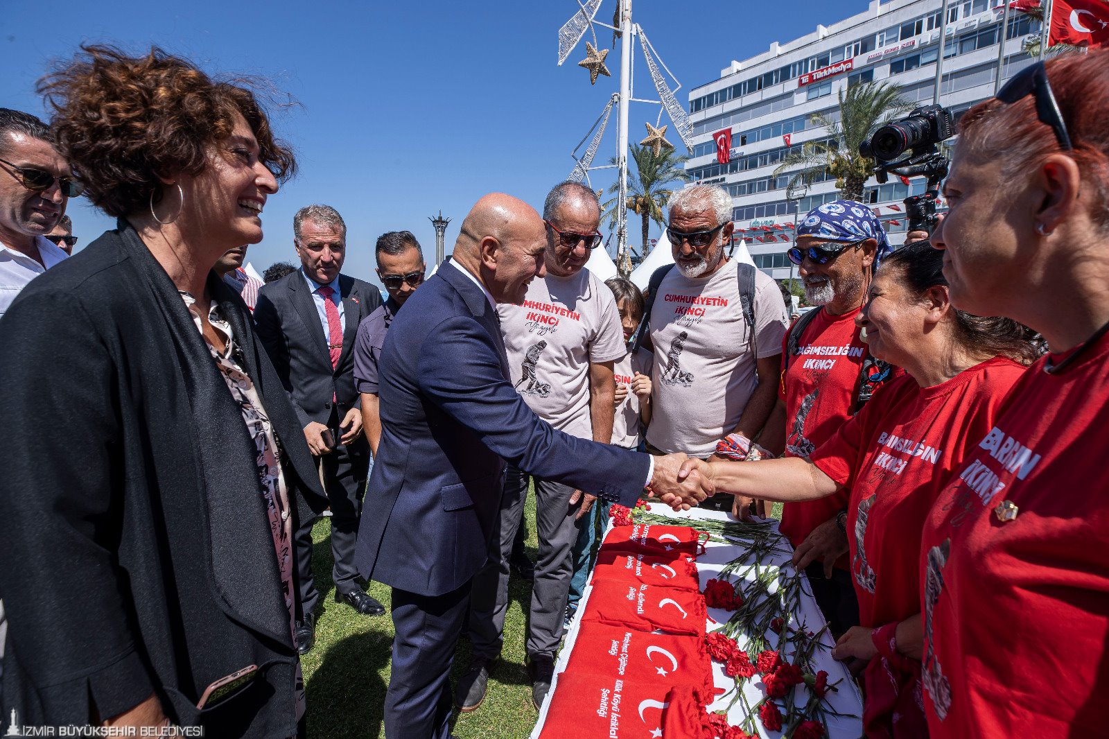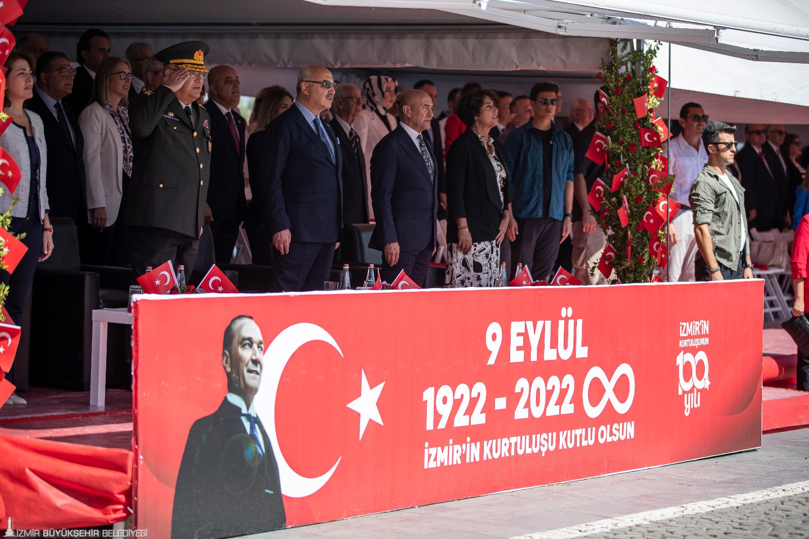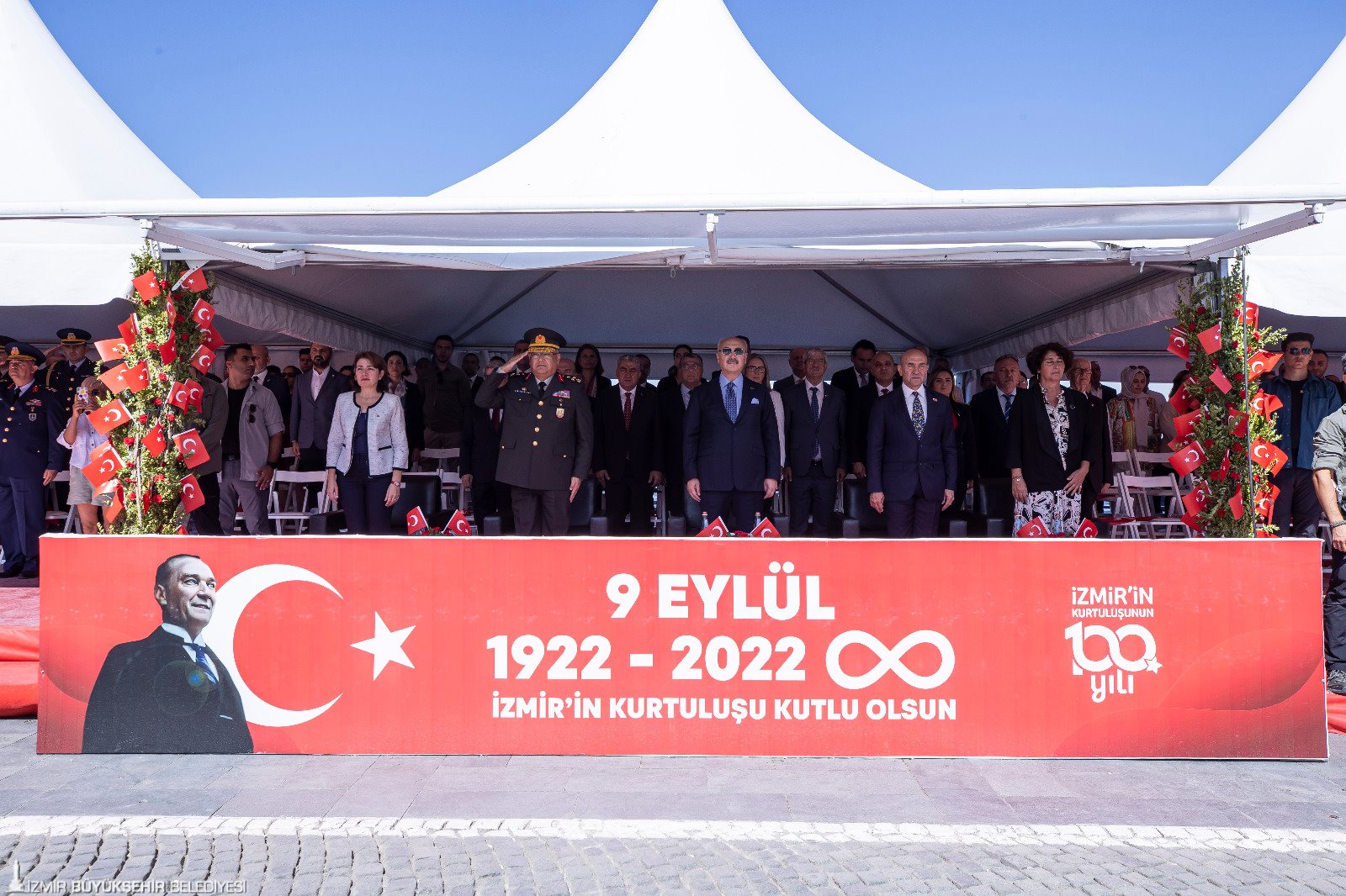 İzmir'in kurtuluşunun 100’üncü yıl kutlamaları büyük coşkuyla devam ediyor. Cumhuriyet Meydanı’nda düzenlenen törene katılan İzmir Büyükşehir Belediye Başkanı Tunç Soyer, “Her bir hücremize kadar İzmirli olmanın onurunu yaşadığımız 9 Eylül tarihi sadece bir şehrin kurtuluşu değildir. Aynı zamanda işgal edilmiş, kuşatılmış bir ülkenin hürriyetine ve bağımsızlığına kavuştuğu günün tarihidir. Bir milletin ayağa kalkışı ve Cumhuriyetimizin doğuşu, 100 yıl önce bugün gerçekleşti. Bu nedenle hep ‘İzmir, umudun yüzüdür’ diyorum” diye konuştu.