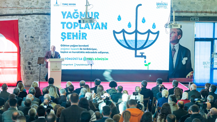 İzmir Büyükşehir Belediye Başkanı Tunç Soyer’in “Başka Bir Su Yönetimi Mümkün” vizyonuyla hayata geçirilen Sünger Kent İzmir projesinin tanıtım toplantısı Tarihi Havagazı Fabrikası Gençlik Yerleşkesi’nde yapıldı. Türkiye’de bir ilk olacak projeyle şehrin caddelerine, sokaklarına, yollarına düşen yağmur suyunun bilimsel uygulamalarla yer altında depolanmasını sağlayacak. Çatılara düşen yağmur suyunun ise hasat edilerek biriktirilmesi, temizlenmesi ve yeniden kullanılmasını mümkün kılacak proje Başkan Tunç Soyer tarafından kamuoyuna tanıtıldı.