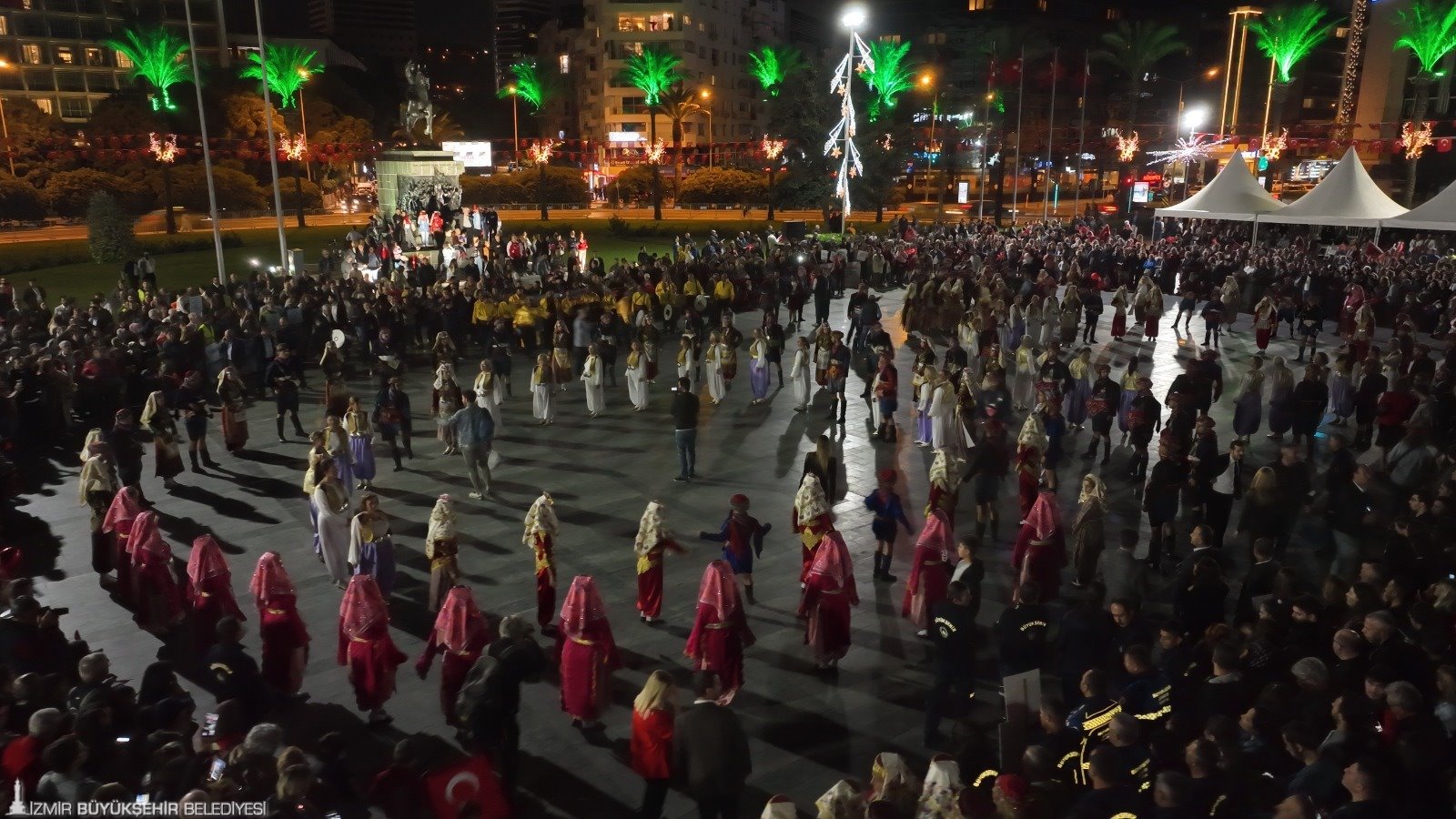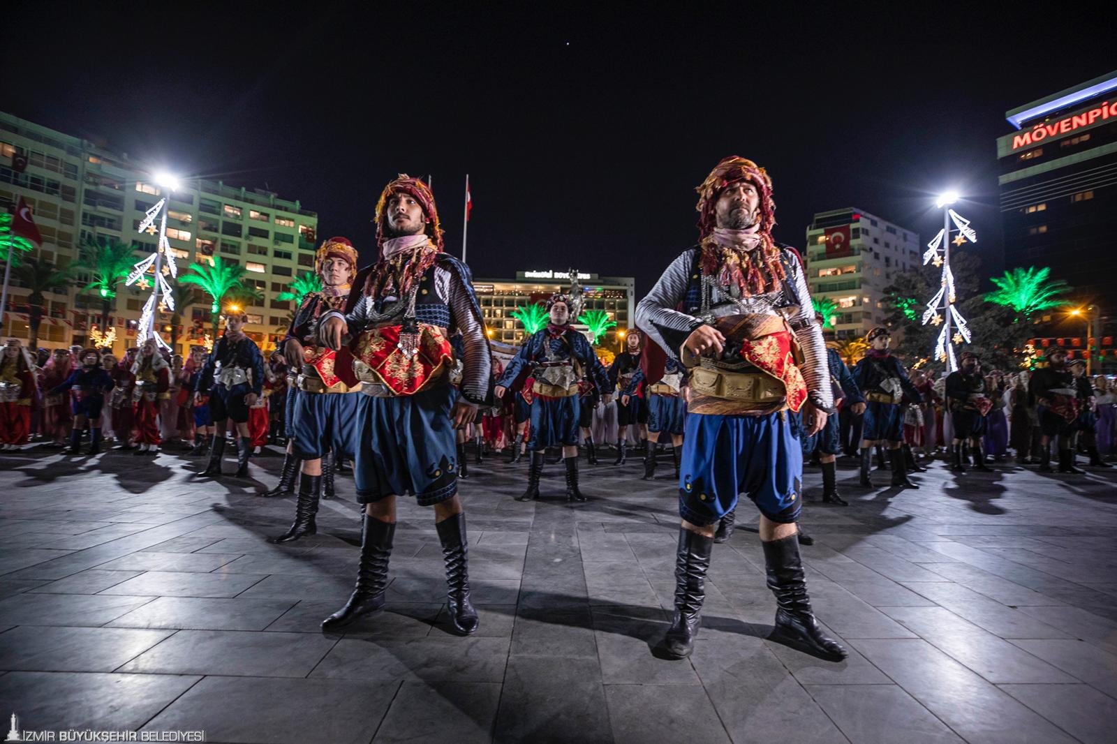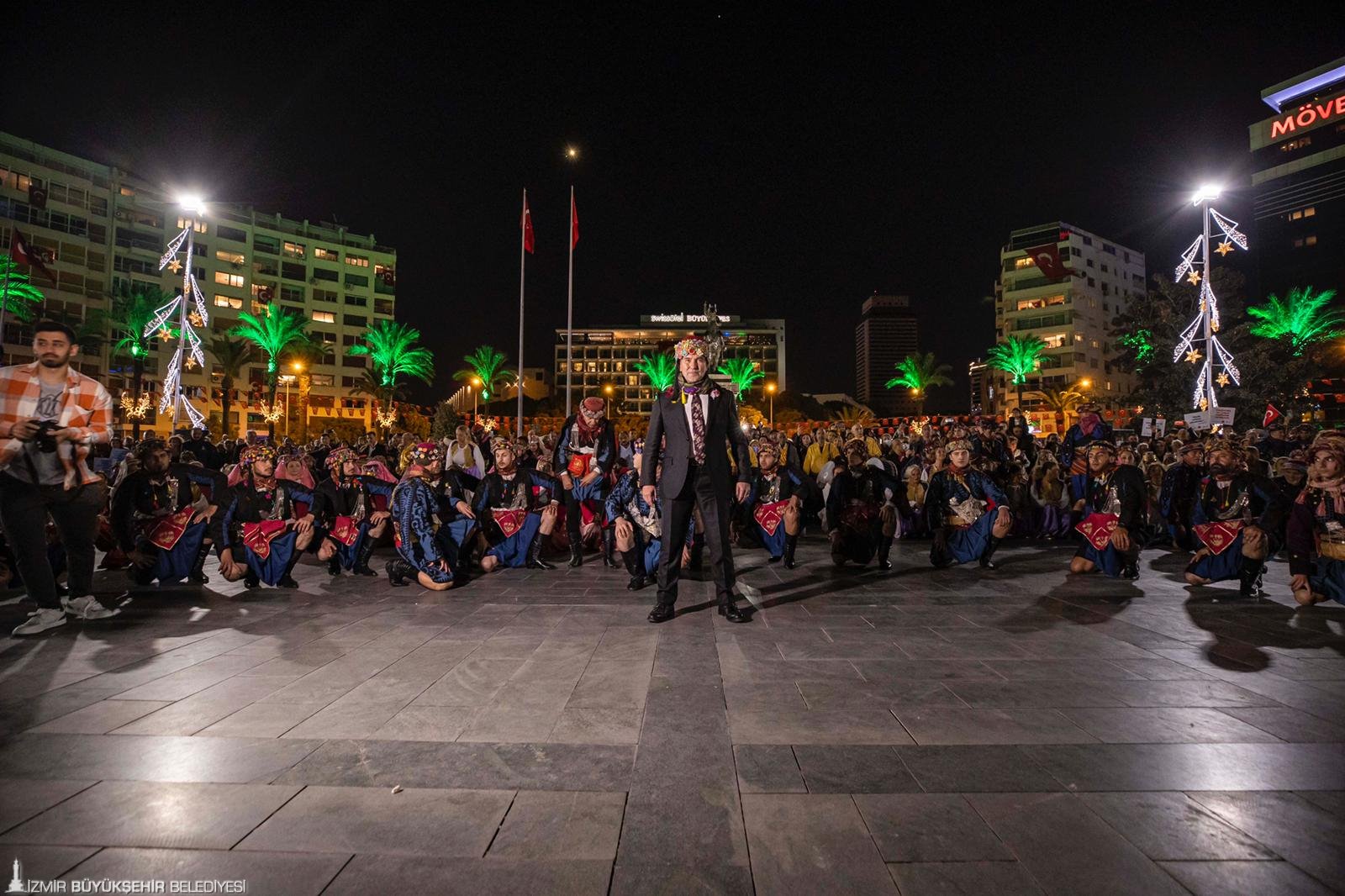 İzmir Büyükşehir Belediyesi düzenlediği etkinliklerle Cumhuriyet gururunu tüm kente yaydı. Kentteki coşku akşam saatlerinde doruğa çıktı. Cumhuriyet Meydanı’nda 9 ilçede 200 zeybek tarafından yapılan gösteriye İzmir Büyükşehir Belediye Başkanı Soyer de katıldı. Alkışlarla efeler arasındaki yerini alan Başkan Tunç Soyer, Atasının huzurunda diz vurdu.
