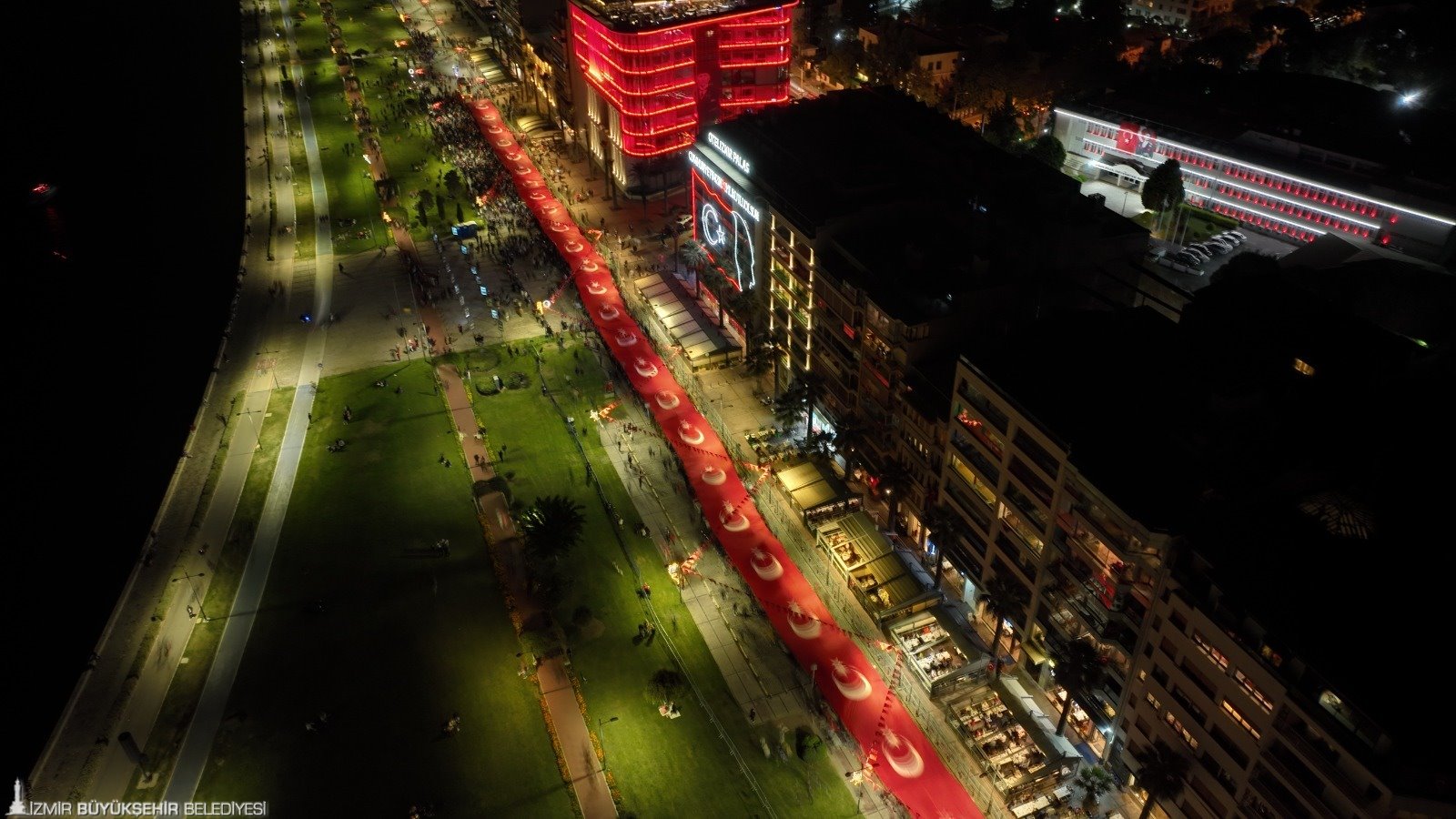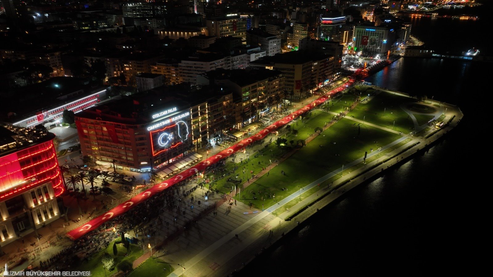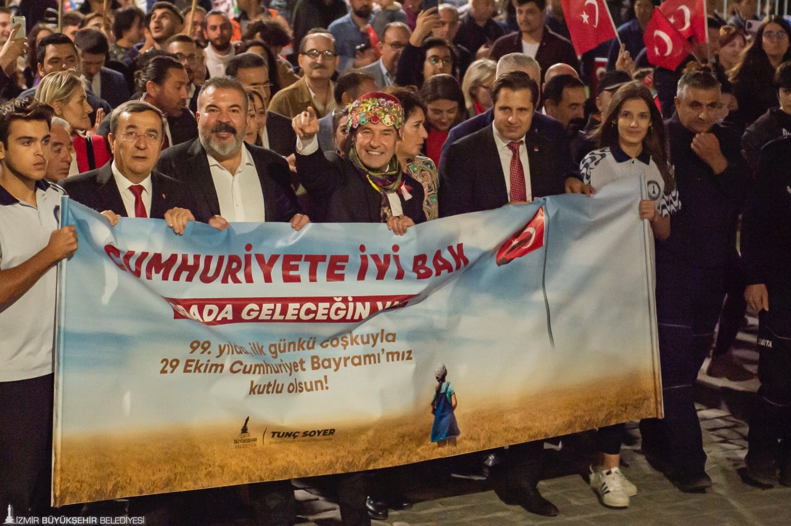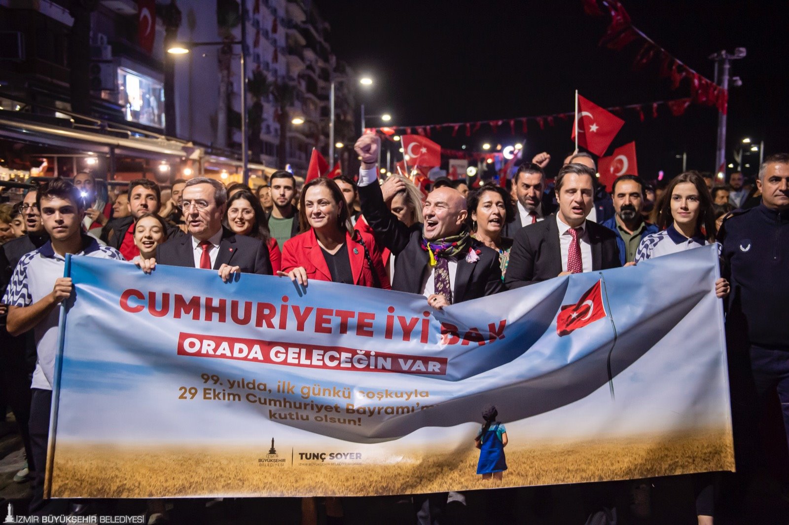 Zeybek gösterisinin ardından fener alayı oluşturuldu. 350 metrelik Türk bayrağını taşıyan kortej Gündoğdu Meydanı’na, oradan da Kültürpark’a yürüdü. Yürüyüşe İzmir Büyükşehir Belediye Başkanı Tunç Soyer, eşi Neptün Soyer, Cumhuriyet Halk Partisi (CHP) Parti Meclisi (PM) Üyesi Devrim Barış Çelik, CHP İzmir İl Başkanı Deniz Yücel, Konak Belediye Başkanı Abdül Batur, İzmir Büyükşehir Belediyesi Başkan Vekili Mustafa Özuslu, İzmir Kent Konseyi Başkanı Nilay Kökkılınç, meclis üyeleri, bürokratlar, daire başkanları, sivil toplum kuruluşları, odalar ve derneklerin temsilcileri ve yurttaşlar da eşlik etti.