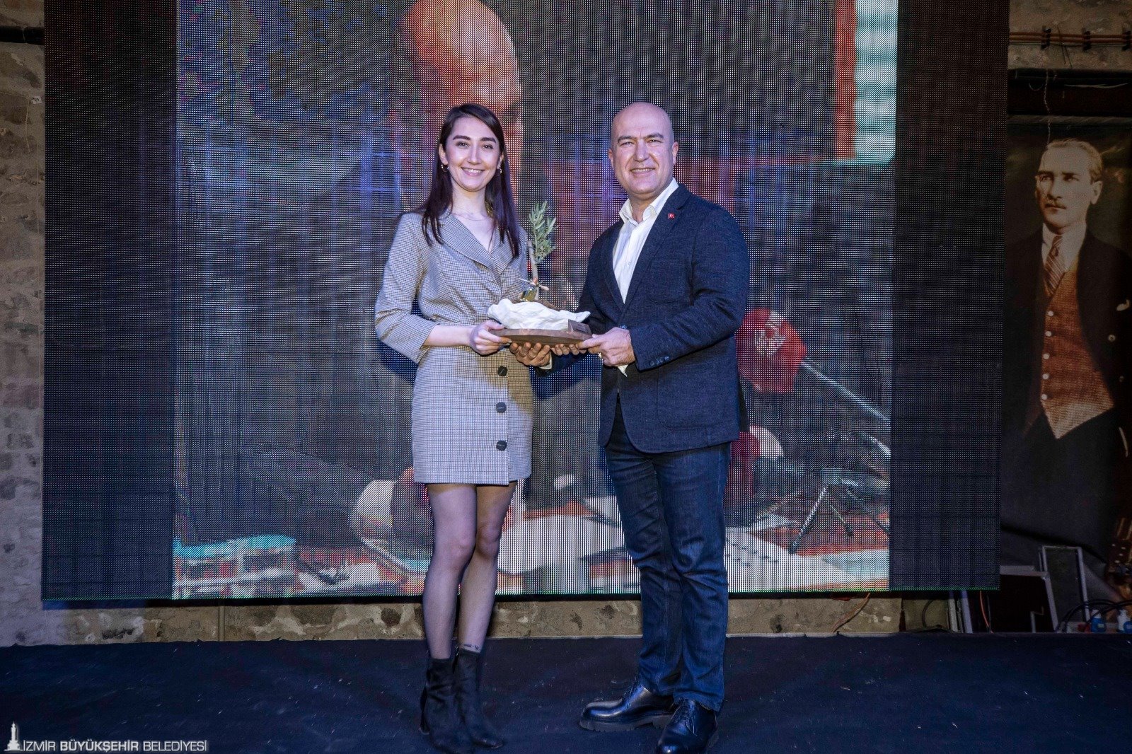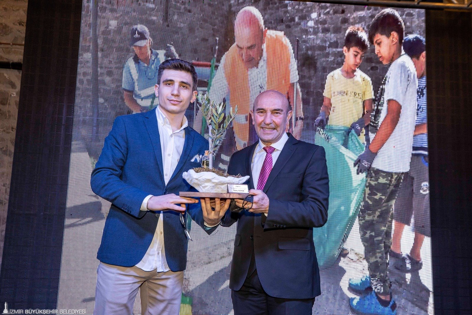 İklim değişikliğine karşı çalışmaları nedeniyle 2021 İz Bırakanlar ödülüne layık görülen Başkan Tunç Soyer, “Doğayla uyumlu bir uygarlık kurmanın insanlığın en temel meselesi haline geldiği çağda yaşıyoruz. Bu çağın sonunu biz belirleyeceğiz. Ya iklim devrimiyle doğadaki tüm canlılarla birlikte yaşamaya devam edeceğiz ya da gezegenimizin yangın yerine dönmesine seyirci kalacağız. Gezegenimiz bizim ortak kaderimiz. Burası milyarlarca aynı cümlenin aynı anda söylenip tek bir hikayeye dönüştüğü yer. Her birimizin hangi cümleler kurduğunun çok önemi var. Ortak hikayemizin mi yoksa kendi hırsımızın mı cümlelerini kuruyoruz. Gezegenimizin geleceğini belirleyecek bu. Gezegenimizin bu harap hali bize çok açık anlatıyor ki insanın doymak bilmez cümlelerini duymaya tahammülü yok. Bu nedenle biz İzmir’de başka cümleler kurarak başladık işe. Başka bir tarım mümkün diyoruz. Çünkü iklim kriziyle yüzleşen çağımızda en eksilen şey su ve biyolojik çeşitlilik. Her ikisinin de sebebi yanlış tarım politikaları” dedi.