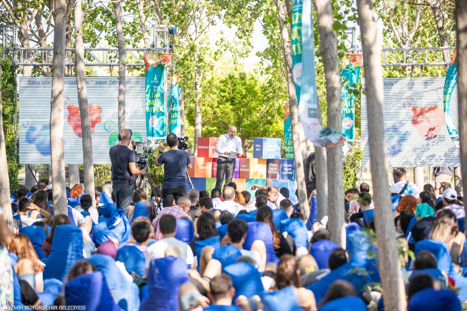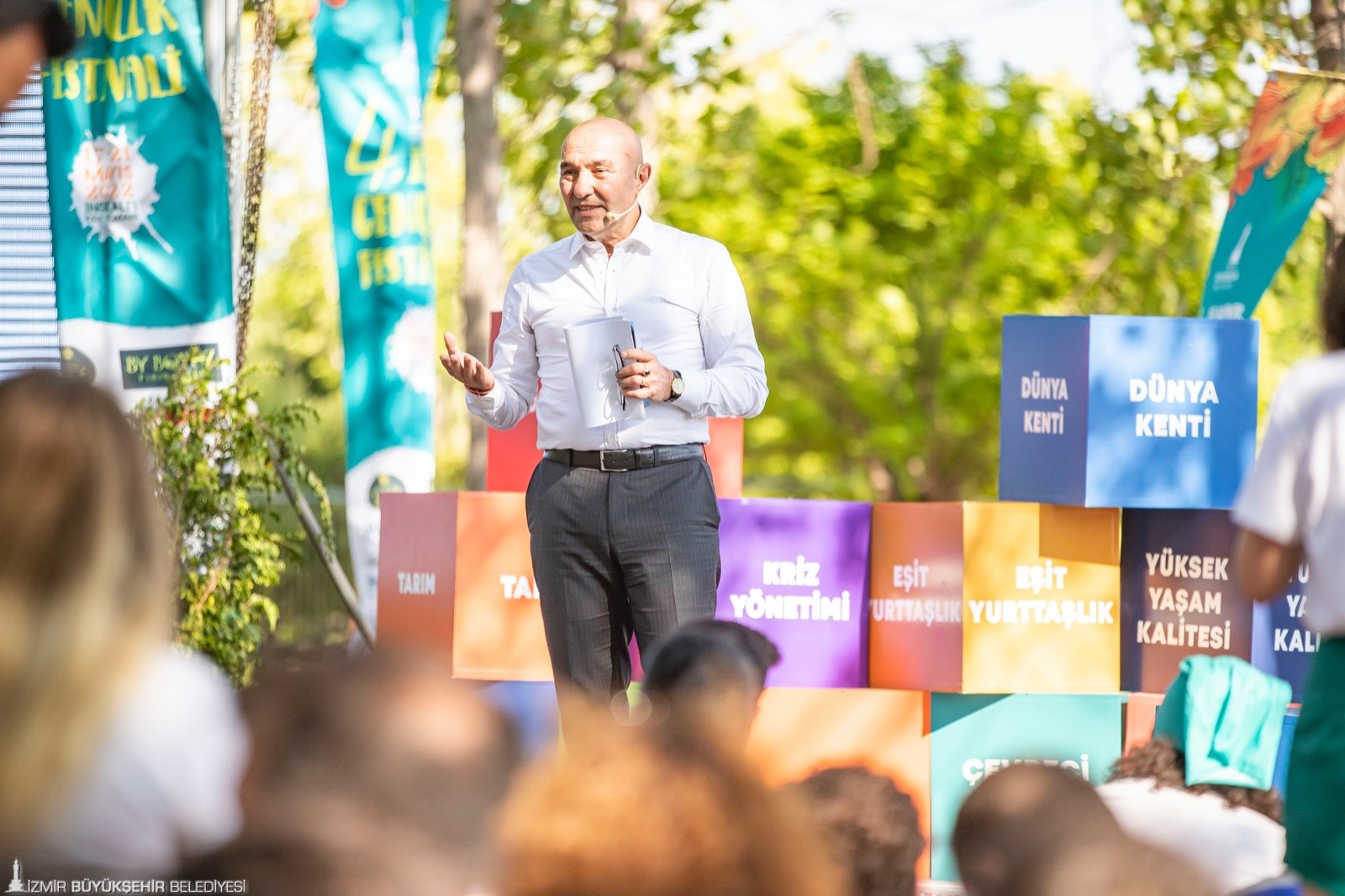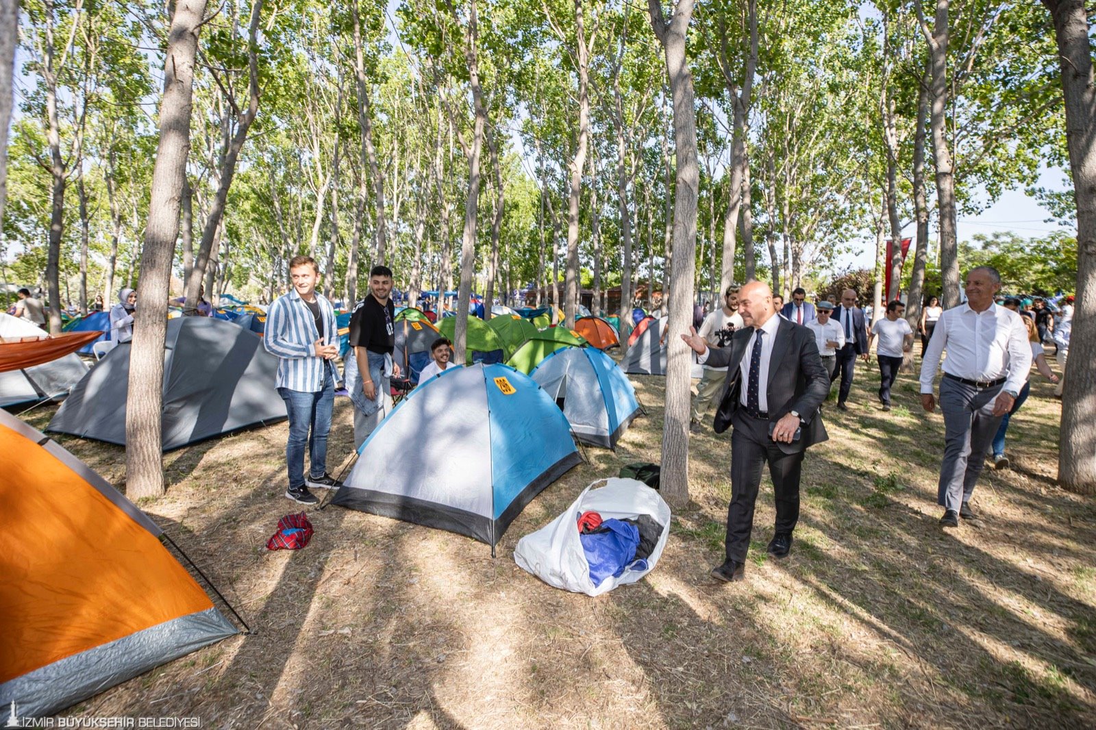 İzmir Büyükşehir Belediye Başkanı Tunç Soyer, İnciraltı Kent Ormanı’nda 17-21 Mayıs tarihleri arasında sürecek İzmir Gençlik Festivali’nin ilk gününde gençlerle ilgili yeni projelerin müjdesini verdiği bir tanıtım toplantısına ev sahipliği yaptı. Sunum öncesinde kamp alanını ziyaret eden Başkan Tunç Soyer, 46 şehir 84 üniversiteden kente gelen gençlerle sohbet etti. Başkan Soyer'in müjdeleri gençler tarafından alkışlarla karşılandı.