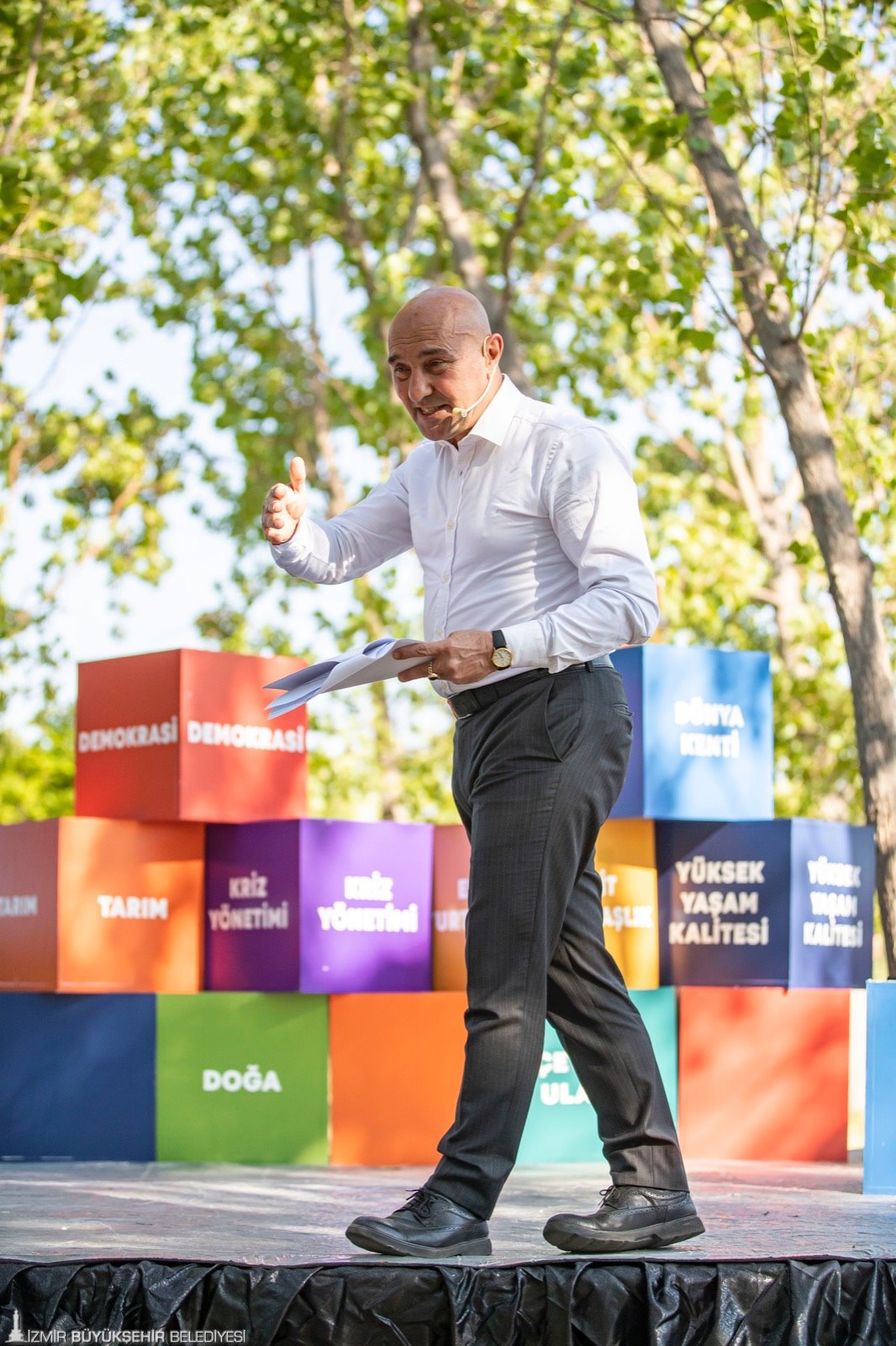 Gençler için öncelikle talep ve ihtiyaçlarını belirtebilecekleri bir altyapı sağladıklarının altını çizen Başkan Soyer “Çünkü sizin hiç kimsenin yılgın bir hoşgörüyle sizi benimsemesine ihtiyacınız yok. Bilmenizi isterim ki Büyükşehir Belediyesi sizin. O yüzden sizi duyuyor, dinliyor ve sizin taleplerinizle uyumlu bir belediyecilik yapıyoruz. Belediyemizin siz gençlerle ilgili tüm projelerini, sizlerin istekleri üzerine gerçekleştirdik. Belediyemize veya direkt bana ilettiğiniz fikirlerden, sizlerle yaptığımız anketlerden yola çıkarak hayata geçirdik. Gençlik çalışmalarımız üç temel başlıktan oluşuyor. Birincisi temel ihtiyaçlarınıza destek olmak. İkincisi sosyal yaşamınıza katkı sağlamak. Üçüncüsü hayallerinizi gerçekleştirmenizi sağlamak” ifadelerini kullandı.