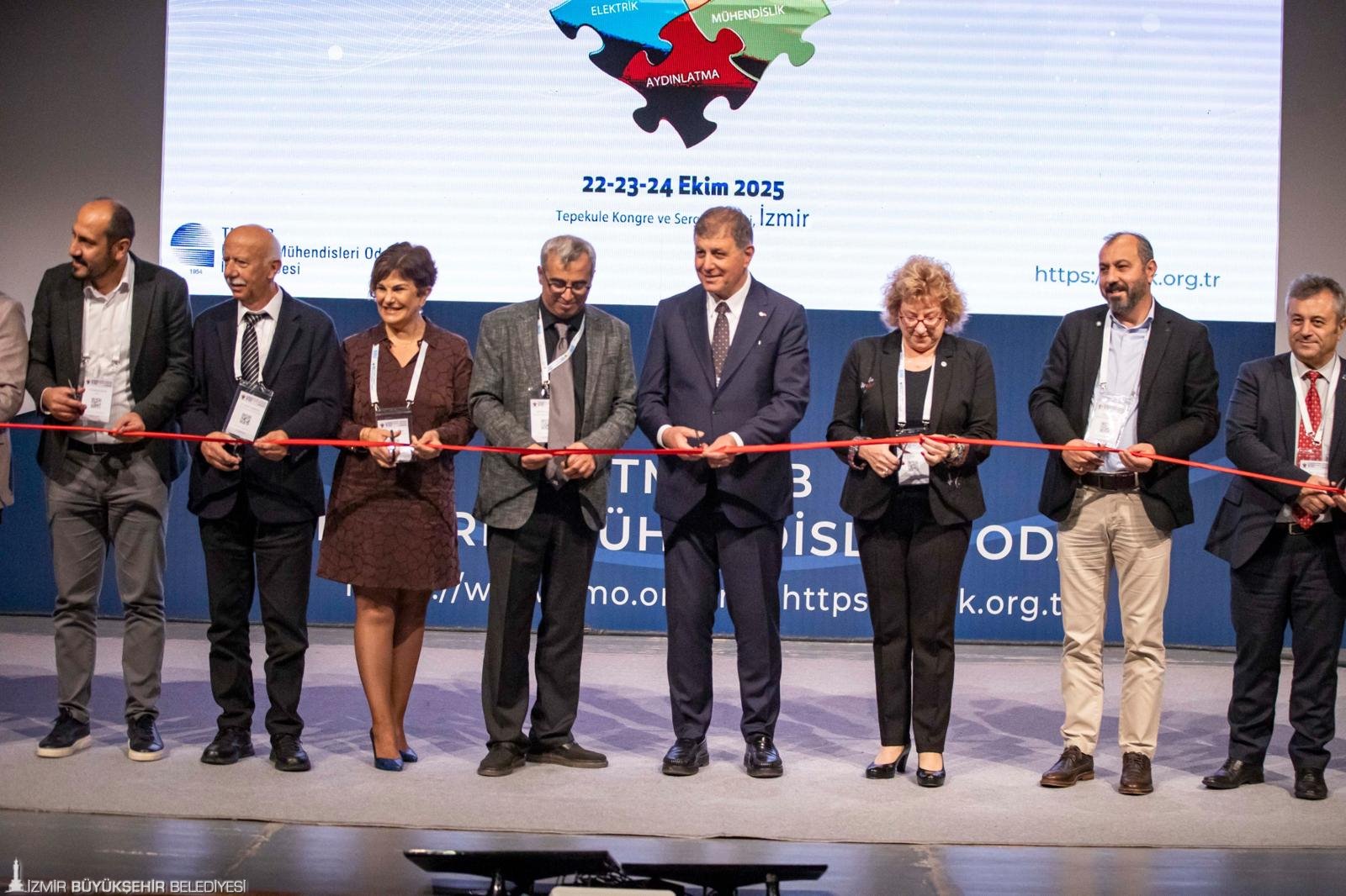 İzmir Büyükşehir Belediye Başkanı Dr. Cemil Tugay, Türk Mühendis ve Mimar Odaları Birliği (TMMOB) Elektrik Mühendisleri Odası (EMO) İzmir Şubesi tarafından bu yıl 8’inci kez organize edilen Elektrik Tesisleri Ulusal Kongre ve Sergisi’nin açılış törenine katıldı. İzmir Tepekule Kongre ve Sergi Merkezi’ndeki etkinlik 22-23-24 Ekim 2025 tarihlerinde bilim insanları, üreticiler, tasarımcılar, uygulayıcılar ile kamu ve özel sektör temsilcilerini bir araya getirecek. Kongrenin açılış törenine Başkan Dr. Cemil Tugay’ın yanı sıra TMMOB Yönetim Kurulu Üyesi Bahadır Acar, EMO Yönetim Kurulu Başkanı Mahir Ulutaş, Aydınlatma Türk Milli Komitesi Başkanı Prof. Dr. Rengin Ünver, EMO İzmir Şubesi Başkanı Gülhan Gürler, ekonomist-gazeteci Dr. Emin Çapa, akademisyenler, sivil toplum kuruluşu temsilcileri, sektör temsilcileri ve öğrenciler katıldı.