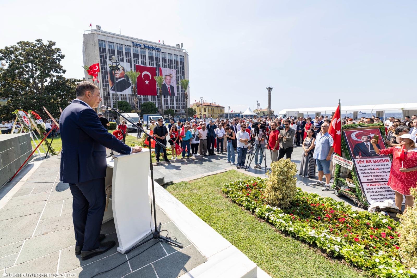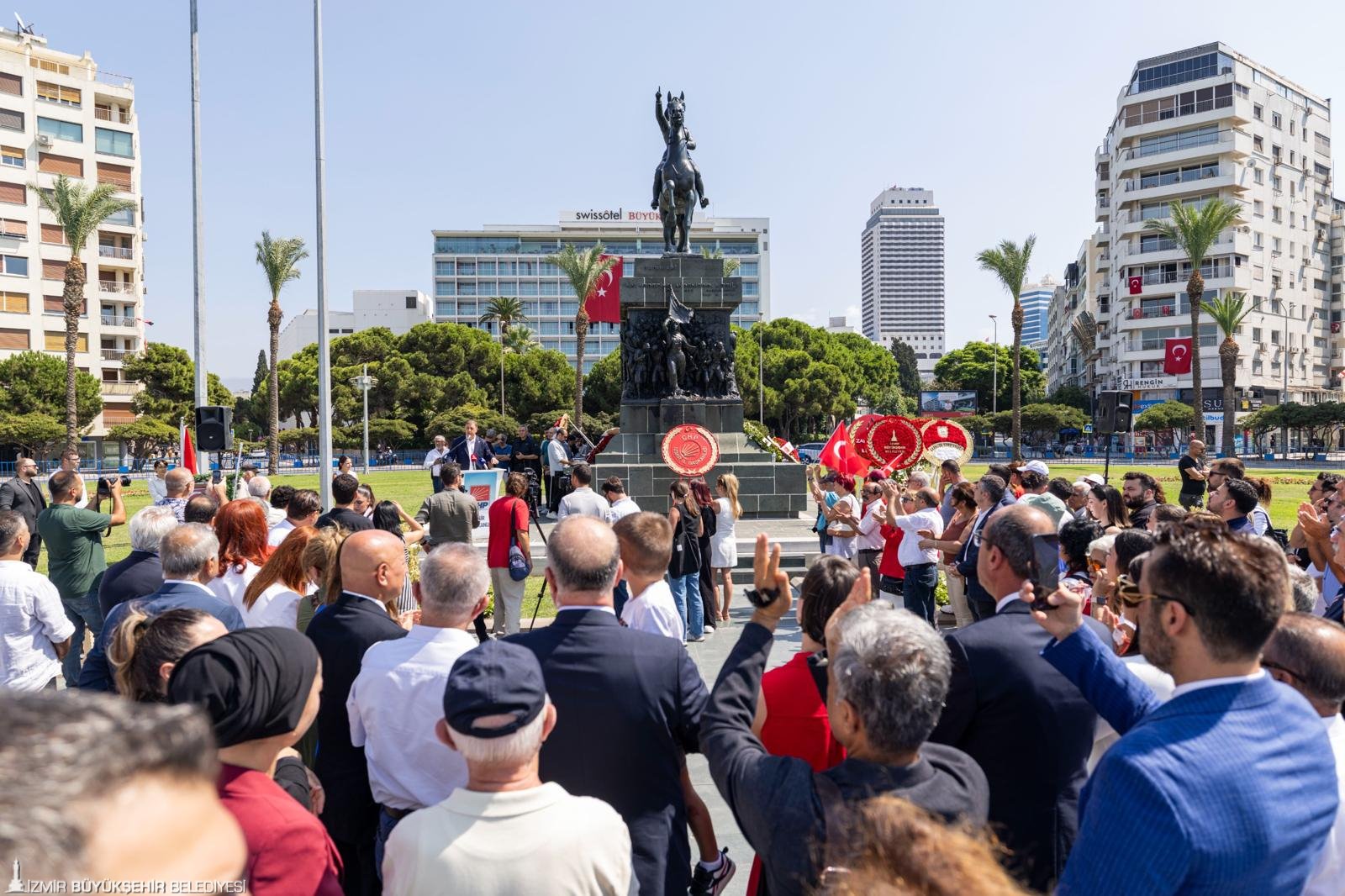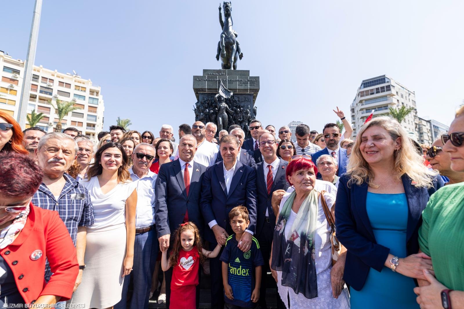 30 Ağustos Zafer Bayramı kutlamaları tüm coşkusuyla İzmir’de kutlanmaya devam ediyor. İzmir Büyükşehir Belediye Başkanı Dr. Cemil Tugay, Cumhuriyet Halk Partisi İzmir İl Başkanlığı tarafından Cumhuriyet Meydanı’nda düzenlenen çelenk törenine katıldı. Törene Başkan Dr. Cemil Tugay’ın yanı sıra CHP İzmir İl Sekreteri Tevfik Türk, geçmiş dönem CHP İzmir milletvekilleri Musa Çam ve Mustafa Moroğlu, ilçe belediye başkanları, il ve ilçe yöneticileri, meclis üyeleri ve çok sayıda partili katıldı. Törende CHP İl Sekreteri Tevfik Türk, CHP İzmir İl Kadın Kolları Başkanı Zahide Kurun, CHP İzmir İl Gençlik Kolları Başkanı Ruhsar Selis Çelik Kınacı, meydandaki Atatürk Anıtı’na çelenk bıraktı.