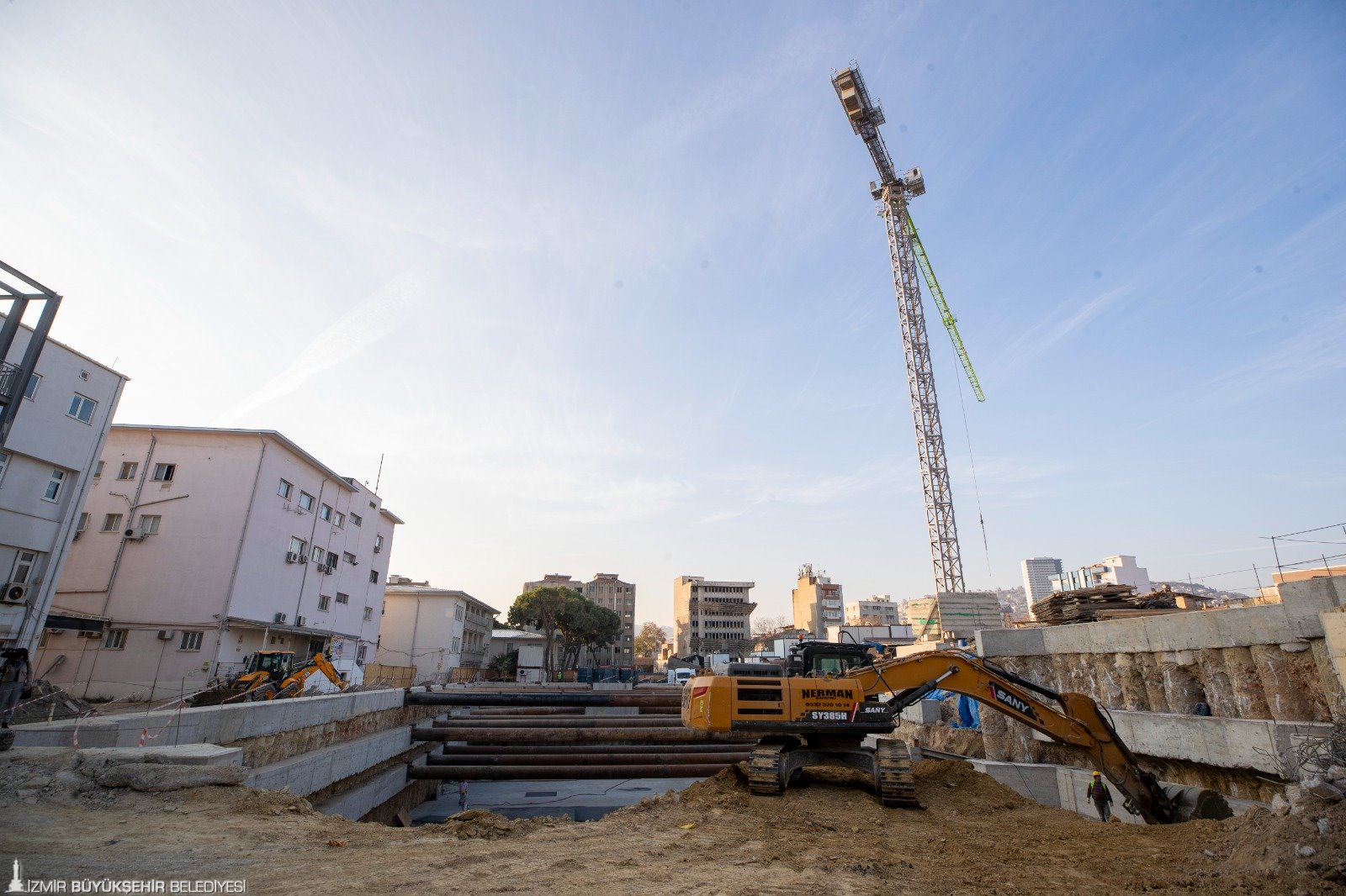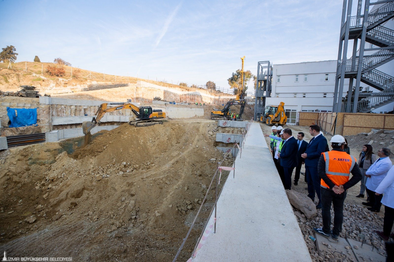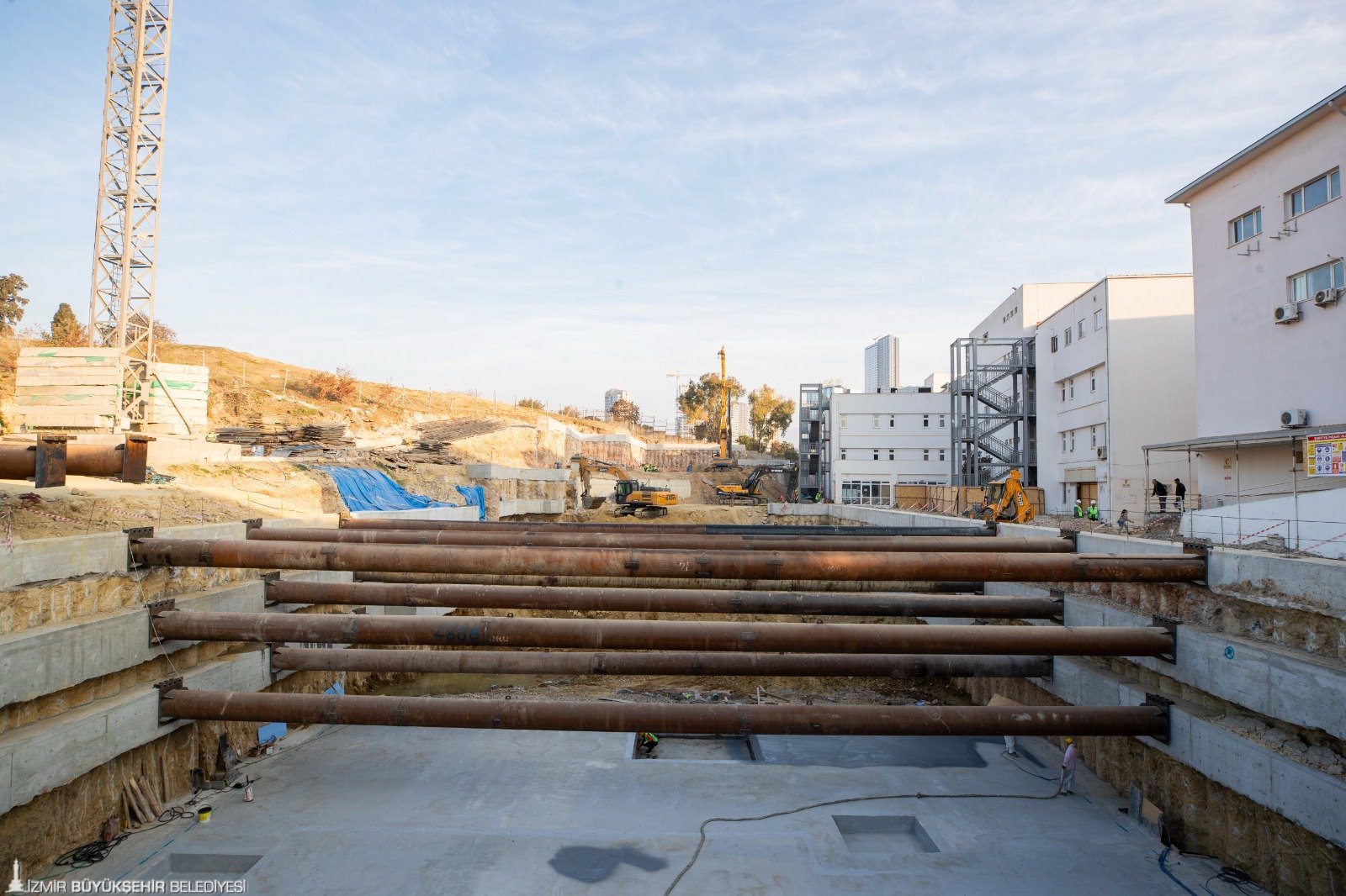 Eşrefpaşa Hastanesi ek hizmet binası inşaatında çalışmalar hızla devam ediyor. Şu ana kadar projedeki 455 fore kazığın 425’i tamamlandı. Başlık ve kuşaklama kirişleri de büyük oranda bitmek üzere. Temel kazısı güney cephesinde tamamlanırken, su yalıtımı ve koruma betonu işlemleri devam ediyor. Yeni ek binada temel donatı imalatlarına başlandı. Bu süreçte, 2 bin 600 metreküp beton dökülerek temel çalışmaları tamamlanacak.
