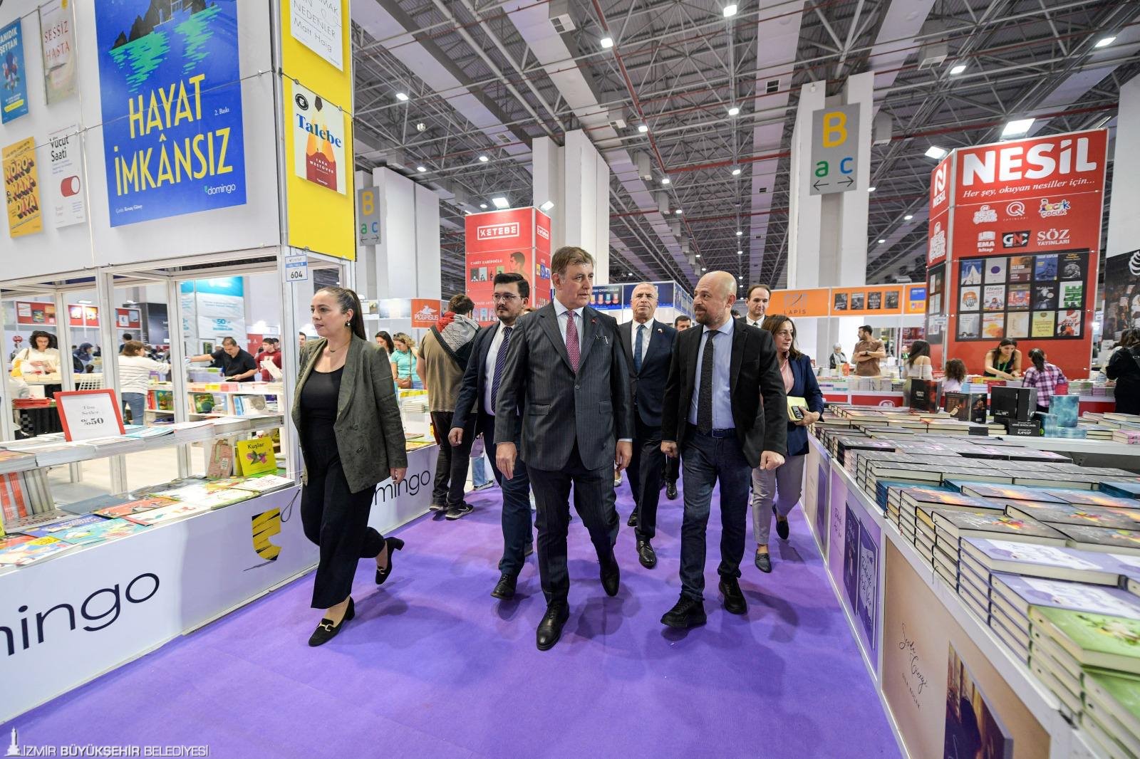 İzmir Büyükşehir Belediyesi'nin ev sahipliğinde, İZFAŞ ve TACT Fuarcılık iş birliği ile düzenlenen İZKİTAP – 4. İzmir Kitap Fuarı, Fuar İzmir’de açıldı. “Sinema ve Edebiyat” temasıyla 3 Kasım’a kadar devam edecek fuarın açılışına İzmir Büyükşehir Belediye Başkanı Dr. Cemil Tugay, fuarın onur konuğu yazarı Hakan Günday ve çok sayıda yazar katıldı. Açılış töreninde konuşan Başkan Tugay, “Ülkemizi değişik nedenlerle rahatsız eden, huzurunu kaçıran, insanlarımızı umutsuz hale getiren bir sürü şey yaşadığımız bir dönemdeyiz ama bilmek lazım; mücadele eden insanlar var. Söylemek lazım; herkesin bu mücadeleye katılması gerekiyor. Nazım’ı hatırlamak lazım; ‘Yok öyle umutları yitirip karanlıkta savrulmak. Unutma; aynı gökyüzü altında bir direniştir yaşamak’ ve Ahmed Arif’in ‘Dayan kitap ile dayan iş ile. Tırnak ile diş ile umut ile, sevda ile, düş ile. Dayan rüsva etme beni’ sözlerini hatırlamak lazım. Bunlar bizim bağrımızdan kopan sözler. Bir gencimizin alacağı kitap, okuyacağı bir hikâye, bir tarih bilgisi belki hayatını değiştirecek. Belki burada bir yazarımız ilk defa okurları ile buluşacak. Onlara kendini ifade etme fırsatı bulacak. Bu ihtimaller, burada verilen emeğin karşılığına değer. Dilerim fuarımız edebiyat, kültür sanat camiamıza, sanatseverlerimize, sektörün emekçilerine yeni ufuklar açar” diye konuştu.