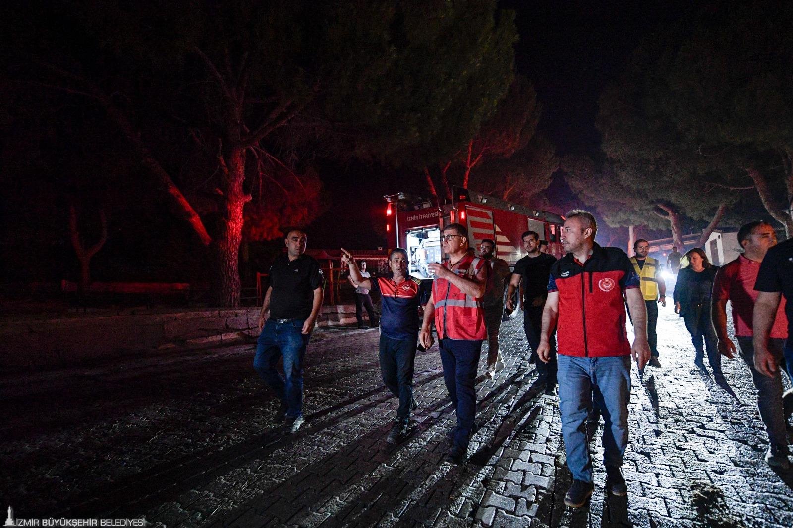 Genellikle yerleşim yerlerinin koruma altına alındığını söyleyen Başkan Tugay, “Ama sevindiğimiz şey, Payamlı Köyü, Orhanlı Köyü, Cumhuriyet Mahallesi gibi yerler ciddi tehdit altındaydı. Buraları korudu arkadaşlarımız. Neredeyse bütün itfaiye araçlarımız burada. Biz, bütün İzmir Büyükşehir Belediyesi ailesi olarak, itfaiye ile İZSU araçları ve personeli, Park ve Bahçeler, Fen İşleri gibi bütün araç gerecimiz ve personelimiz bu bölgedeydi. Denizli’den, Aydın’dan ve birkaç çevre ilden de bize yardıma geldiler. Şu an yolda olan araçlar da var. Yarın rüzgarlı hava devam edecek diye gördük, okuduk. Ondan dolayı yangına müdahalenin etkili şekilde devam etmesi ve tamamen sönene kadar çalışmanın devam etmesi gerekecek. Ama şu an için yerleşim yerlerini büyük ölçüde kontrol altına almış durumdayız. Riskli gibi görünen bir yer yok” şeklinde konuştu.
