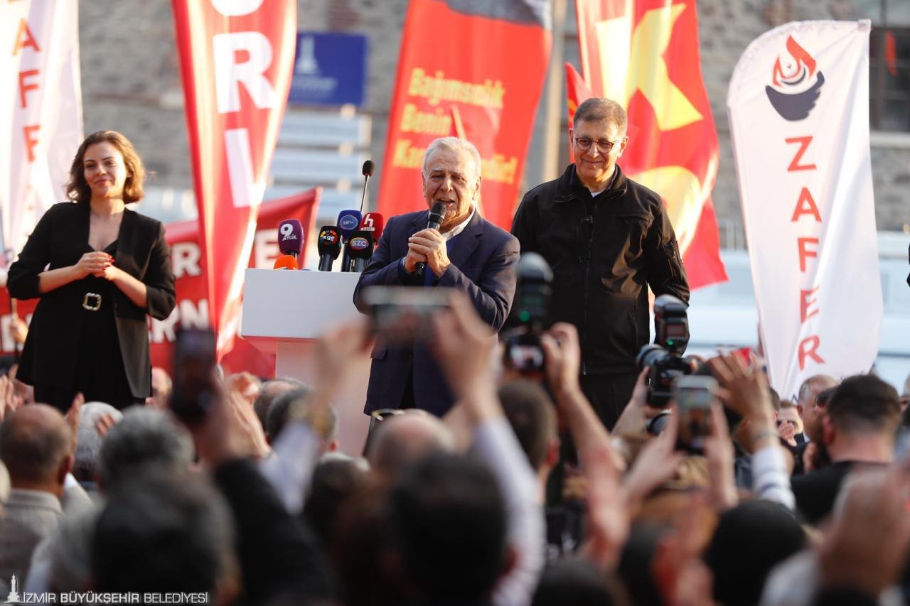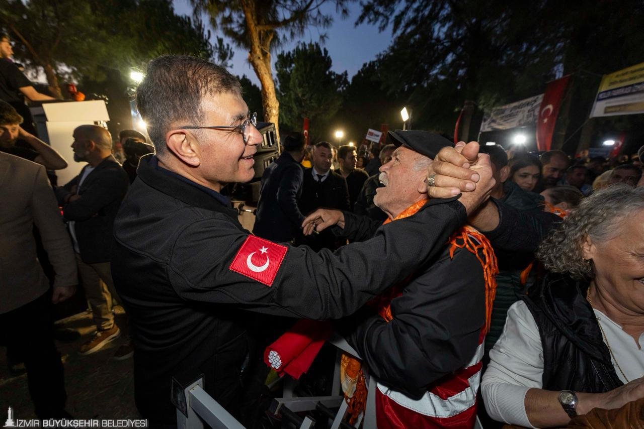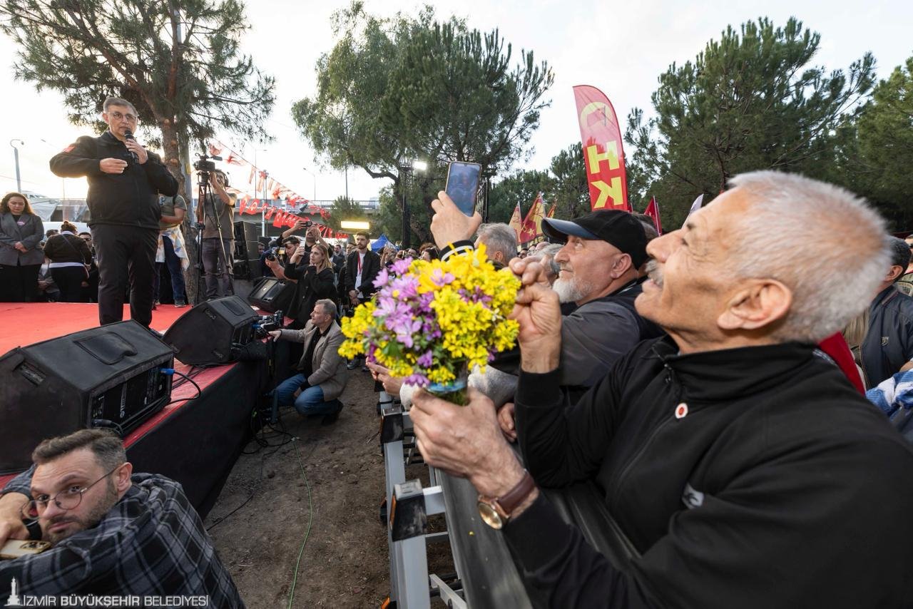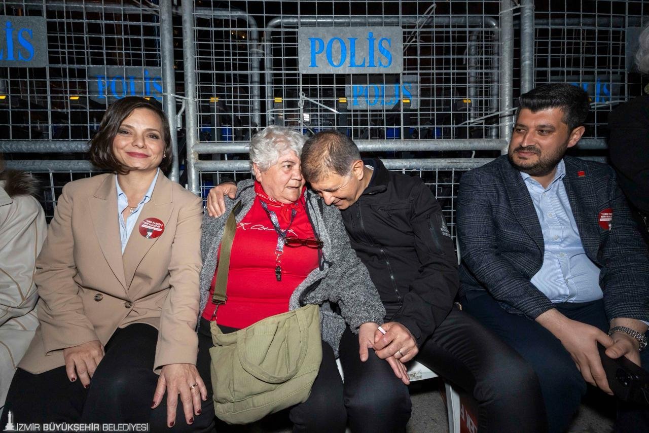 İzmir Büyükşehir Belediye Başkanı Dr. Cemil Tugay, sahneye eşi Öznur Tugay ile birlikte çıktı. Topluluğu selamlayan Başkan Tugay, “Büyük bir fedakarlıkla buraya geldiğiniz için hepinize yürekten teşekkür ediyorum. Buraya gelemeyenler sanmasınlar ki onlara selamımız yok, bizi izleyenlere selam gönderiyorum” dedi.