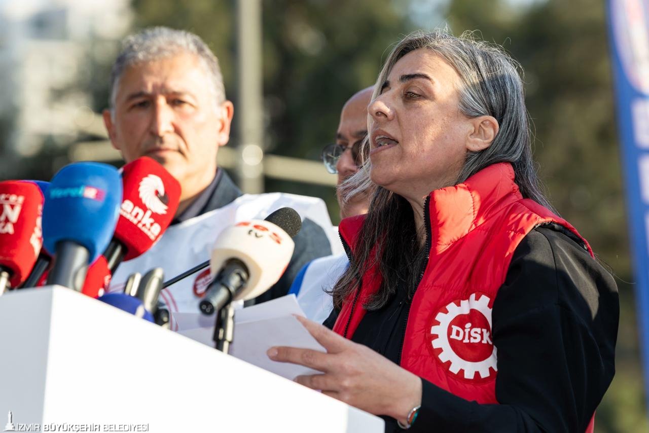 Tarihi buluşmada sivil toplum kuruluşları ve meslek örgütlerinin öncülüğünde İzmirliler adına bildiri okundu. Bildiride İzmir Emek ve Demokrasi Güçleri adına konuşan DİSK Ege Bölge Temsilcisi Deniz Şahin Gümüştekin, “Bugün yalnızca bir binayı değil bu kentin emeğini, toplumsal hafızasını ve geleceğini savunmak için bir aradayız. Meslek Fabrikası, İzmir’de yıllardır başta kadınlar ve gençler olmak üzere yüz binden fazla yurttaşa eğitim vermiş, 2 binden fazla insanın meslek sahibi olmasını sağlayarak istihdama doğrudan katkı sunmuş kamusal yarar üreten önemli bir toplumsal hizmet merkezidir. Aynı zamanda örnek bir sosyal belediyecilik modelidir. Tam da böyle tabloda Meslek Fabrikası’na el konuldu. Üstelik bu el koyma, kamu yararı için faaliyet yürüten bir kamu kurumuna yine kamu kurumu eliyle yapıldı. Halkın vergileriyle kurulan, halkın ihtiyaçları için kullanılan bir yapının kamu gücü kullanılarak halktan kopartılması kabul edilemez. Bu tesadüf değil. Kamusal olanı ortadan kaldırma politikasının bir sonucudur. Emeği görünmez kılma anlayışının parçasıdır, halkın ortak değerlerine doğrudan müdahaledir. Meslek Fabrikası’na bir şafak baskını ile el konulmuştur. Bu yöntem, hukukun değil siyasi baskının yöntemidir. Bu açık bir hukuksuzluktur. Biz bu hukuksuzluğa boyun eğmiyoruz” sözlerine yer verdi.