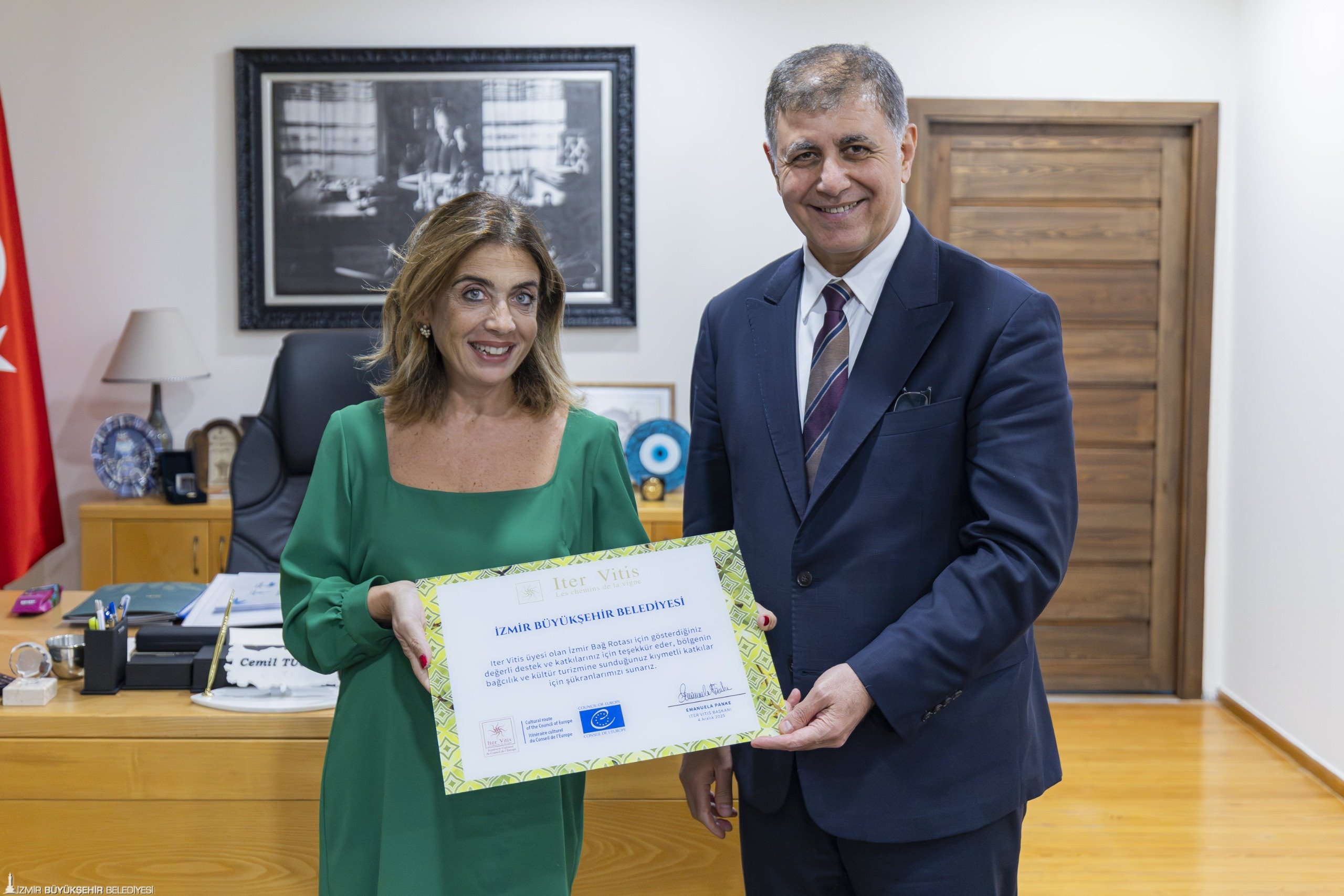Tarihiyle, zenginlikleriyle ve üzümle derin bir bağa sahip olan İzmir, Avrupa Konseyi’nin kültür rotalarından biri olarak bilinen Iter Vitis Rotaları Ağı’na üye oldu. İzmir Büyükşehir Belediye Başkanı Dr. Cemil Tugay’a üyelik sertifikasını Iter Vitis Başkanı ve Avrupa Temsilcisi Emanuela Panke sundu. Panke, Başkan Dr. Cemil Tugay’ı makamında ziyaret etti. Ziyarette Anadolu Gastro Turizm Derneği Başkan Yardımcısı Dr. Yalçın Güçer ve İzmir Büyükşehir Belediyesi bürokratları da yer aldı.