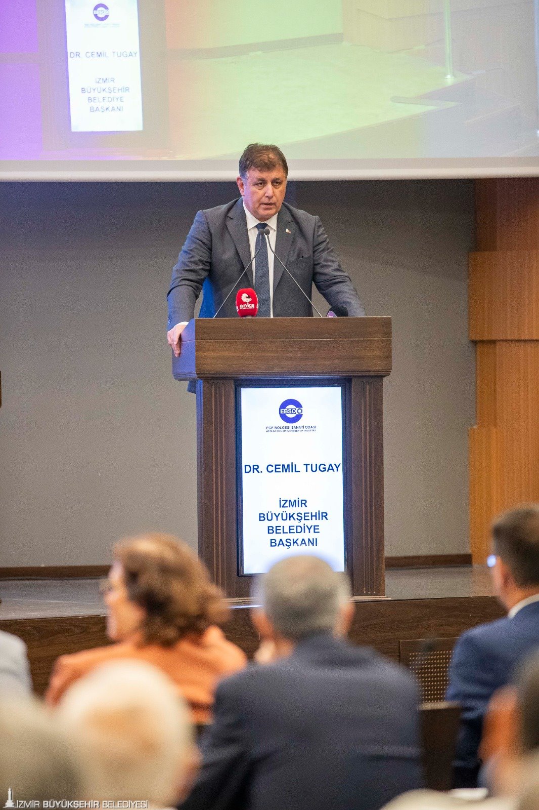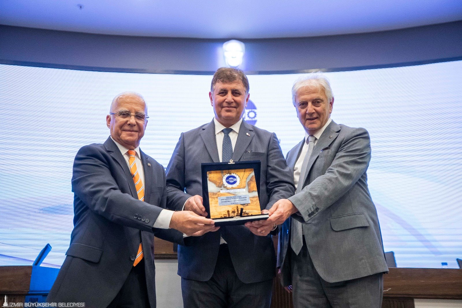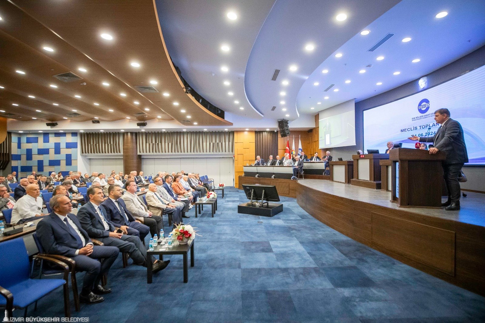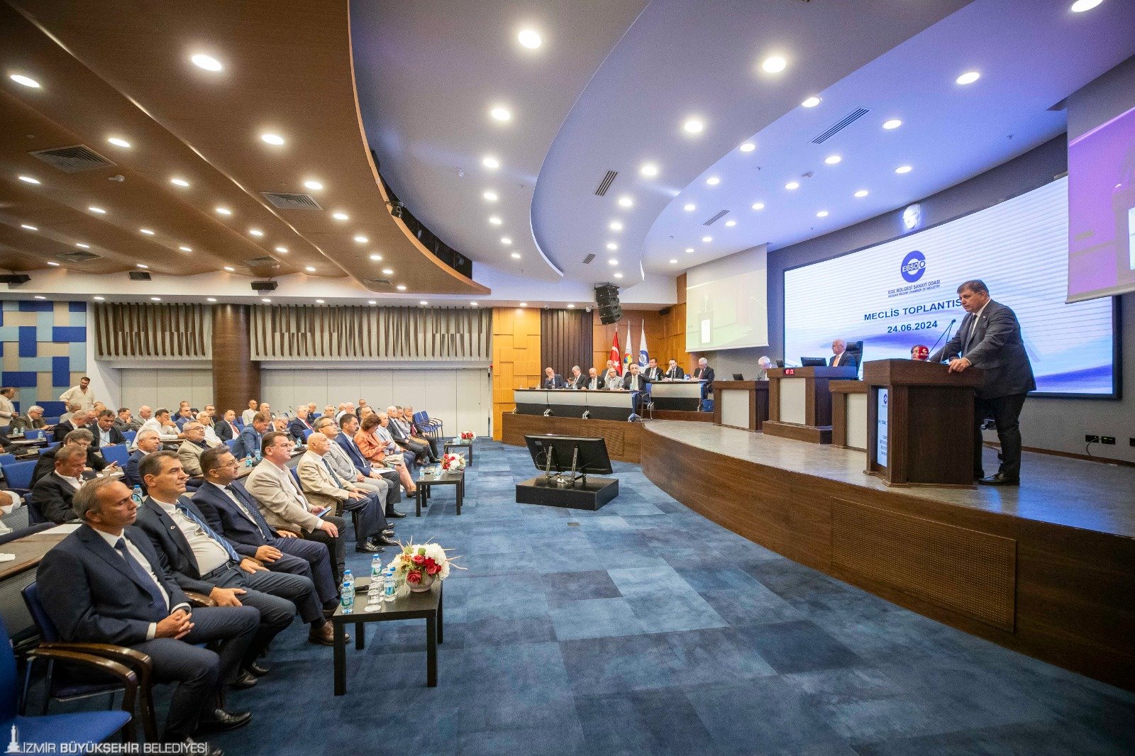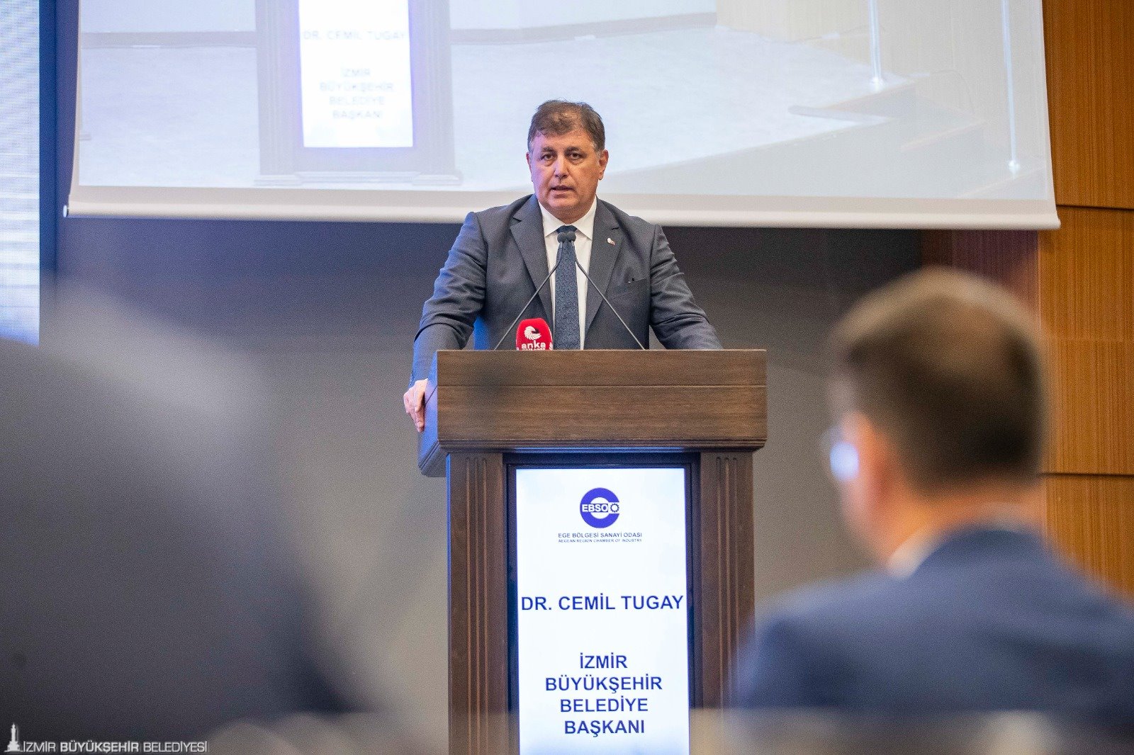 İzmir Büyükşehir Belediye Başkanı Dr. Cemil Tugay, Ege Bölgesi Sanayi Odası'nın (EBSO) Haziran ayı olağan meclis toplantısına konuk oldu. İzmir Ticaret Odası ev sahipliğinde düzenlenen meclis toplantısında Başkan Dr. Cemil Tugay’ı, EBSO Yönetim Kurulu Başkanı Ender Yorgancılar ve EBSO Meclis Başkanı İbrahim Gökçüoğlu, İzmir Ticaret Odası Yönetim Kurulu Başkanı Mahmut Özgener, Cumhuriyet Halk Partisi İzmir İl Başkanı Şenol Aslanoğlu kapıda karşıladı. Başkan Tugay, meclis oturumu kapsamında sanayicilerin sorun ve taleplerinden kent projelerine, kamuoyunda yaratılmak istenen algılardan belediyenin mevcut durumuna ve alınan kararlara kadar kente dair pek çok konuda bilgi verdi.