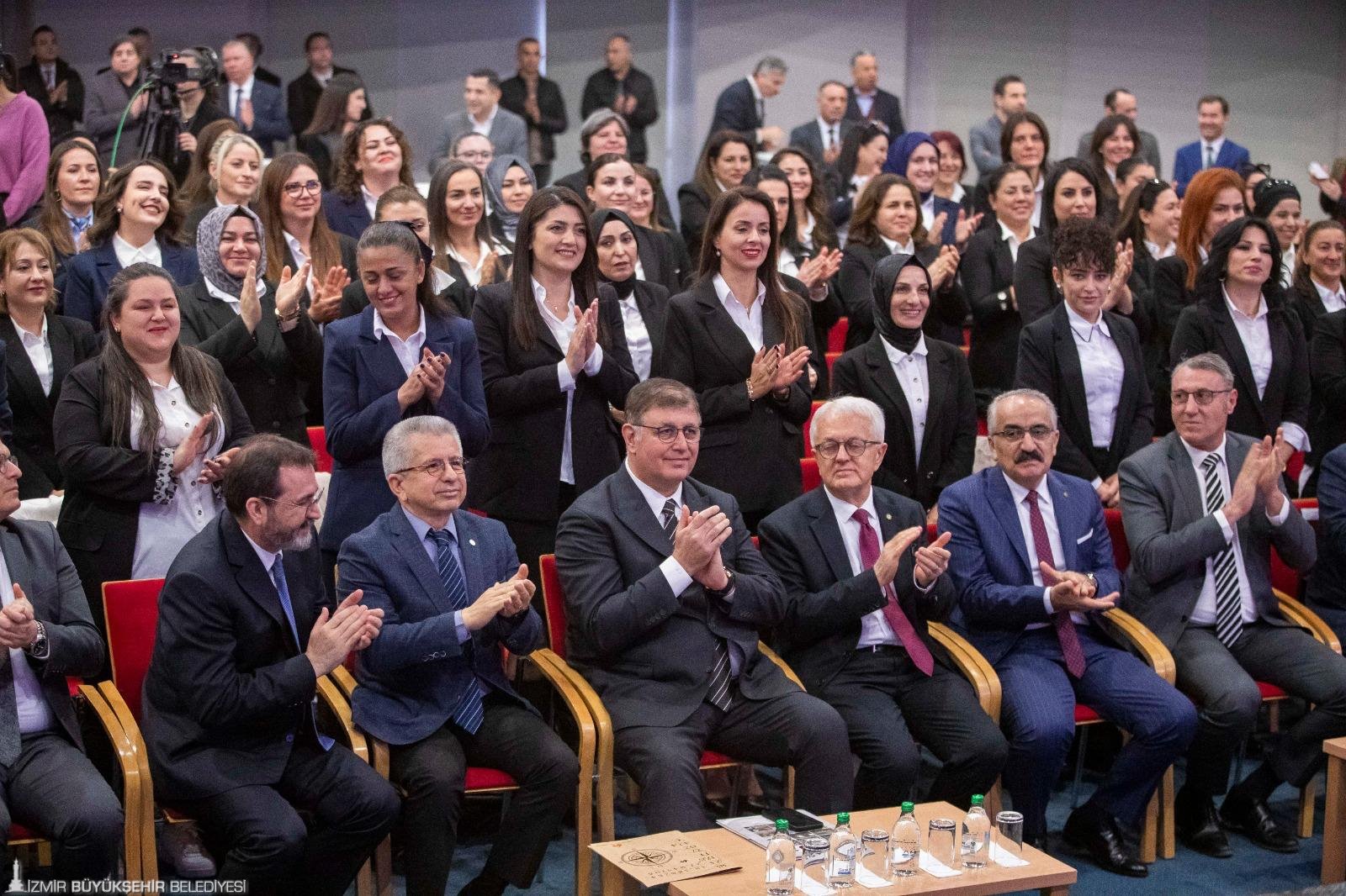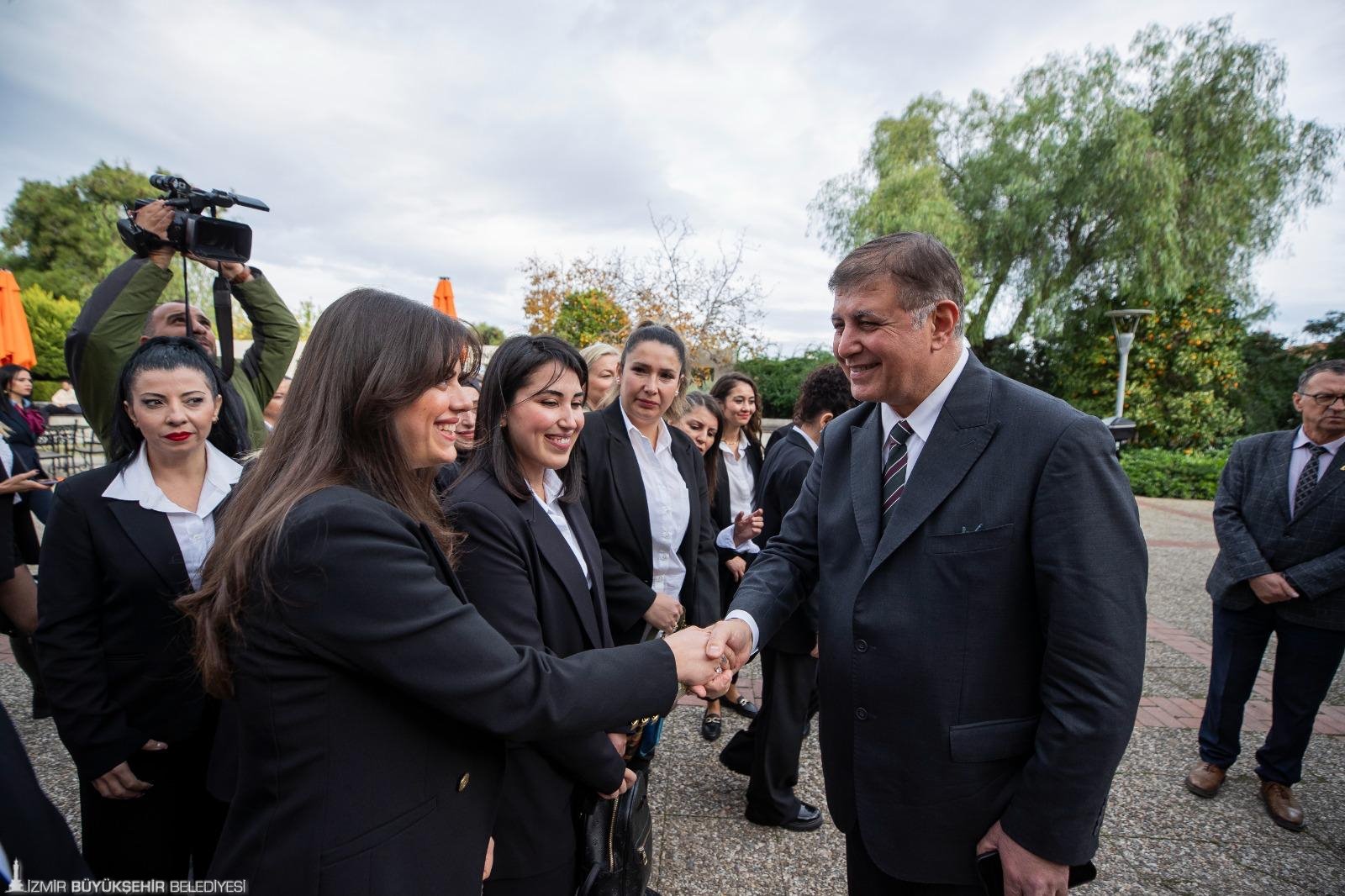 Kadın erkek eşitliği konusunda konuşan Başkan Dr. Cemil Tugay, “Kadınların erkeklere göre daha geride durmasını kabul etmiyoruz. Kadınları geride bıraktığımız zaman gelişmemiz ilerlememiz mümkün değil. Atatürk şöyle ifade ediyor; insanoğlu kadın ve erkekten mürekkep bir topluluktur. Bunlar birbirine ayrılmaz bağlarla bağlıdır. Bir toplumu ilerletmek istediğinizde yarısına sen burada kal, erkeklere gidecek derseniz erkekler de ilerleyemez. Yarısı toprağa zincirlerle bağlıyken, diğer yarısını yükseltemezsiniz. O yüzden kadınları da o eşitlikle ilgili tüm hakları tanımak, onların yeteneklerini göstermelerini, becerilerini ülkemizin yararına kullanmalarının önünü açmamız lazım. Görev verildiği zaman kadınlar her türlü yükün altından gerçekten başarıyla kalkıyorlar. İzmir'imizin, Türkiye'mizin tüm kadınlarına minnettarım” diye konuştu.