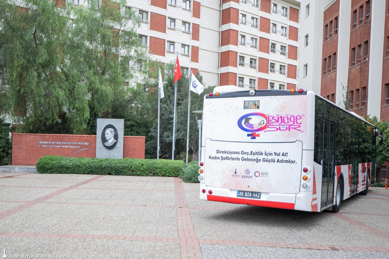 ESHOT Genel Müdürlüğü’nün geliştirdiği ve Fransız Kalkınma Ajansı’ndan 100 bin Euro’luk hibe desteği sağlayacak Eşitliğe Sür projesinde farkındalık eğitimleri, İzmir Büyükşehir Belediye Başkanı Dr. Cemil Tugay’ın da katıldığı törenle başladı. Toplu ulaşım hizmetlerinde kadın şoför istihdamını artırmak ve toplumsal cinsiyet eşitliği bilincini güçlendirmek amacıyla hazırlanan proje kapsamında İzmir Büyükşehir Belediyesi’ne iş başvurusunda bulunan 120 kadın şoför adayı, proje kapsamında iş birliği protokolü yapılan İzmir Ekonomi Üniversitesi’nde (İEÜ) Farkındalık Eğitimleri’ne alındı. Törene, Başkan Dr. Cemil Tugay’ın yanı sıra; İzmir Ticaret Odası Meclis Başkanı Selami Özpoyraz, İEÜ Rektörü Rektör Prof. Dr. Yusuf Hakan Abacıoğlu, İzmir Büyükşehir Belediyesi Genel Sekreteri Ramazan Tezcan, ESHOT Genel Müdürü Övünç Özgen, İEÜ öğretim üyeleri, ESHOT bürokratları ve kadın şoför adayları katıldı. Fransız Kalkınma Ajansı Türkiye Direktörü Tanguy Denieul de online olarak bağlandı ve programı takip etti.