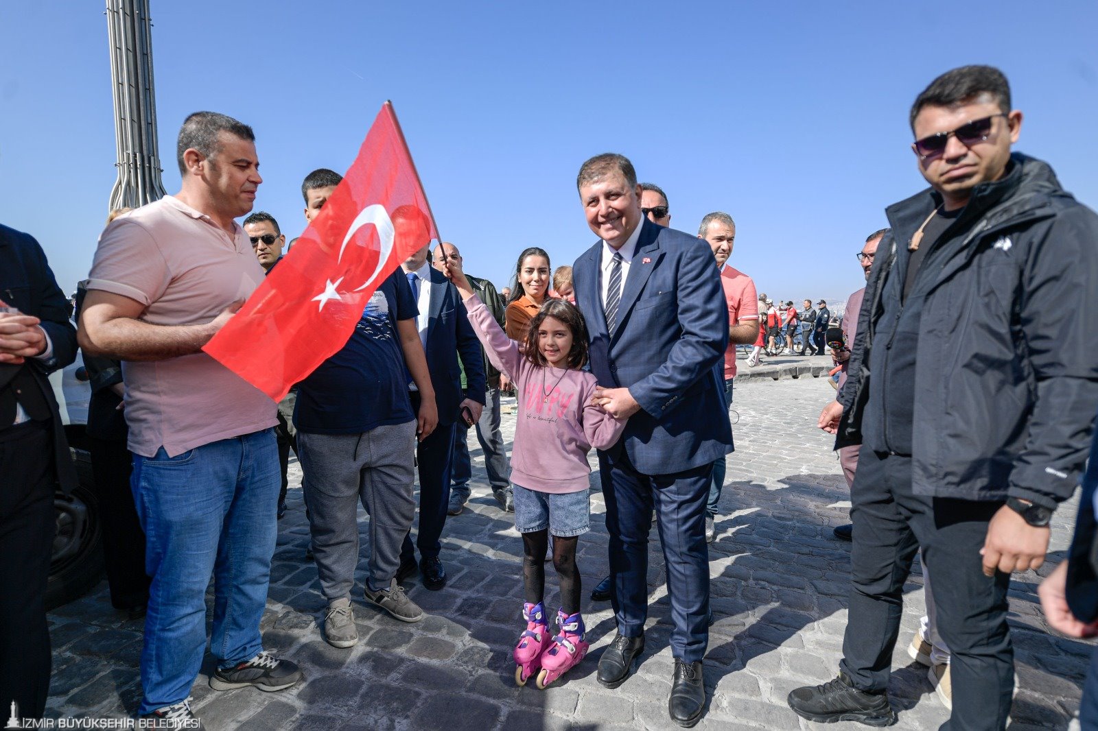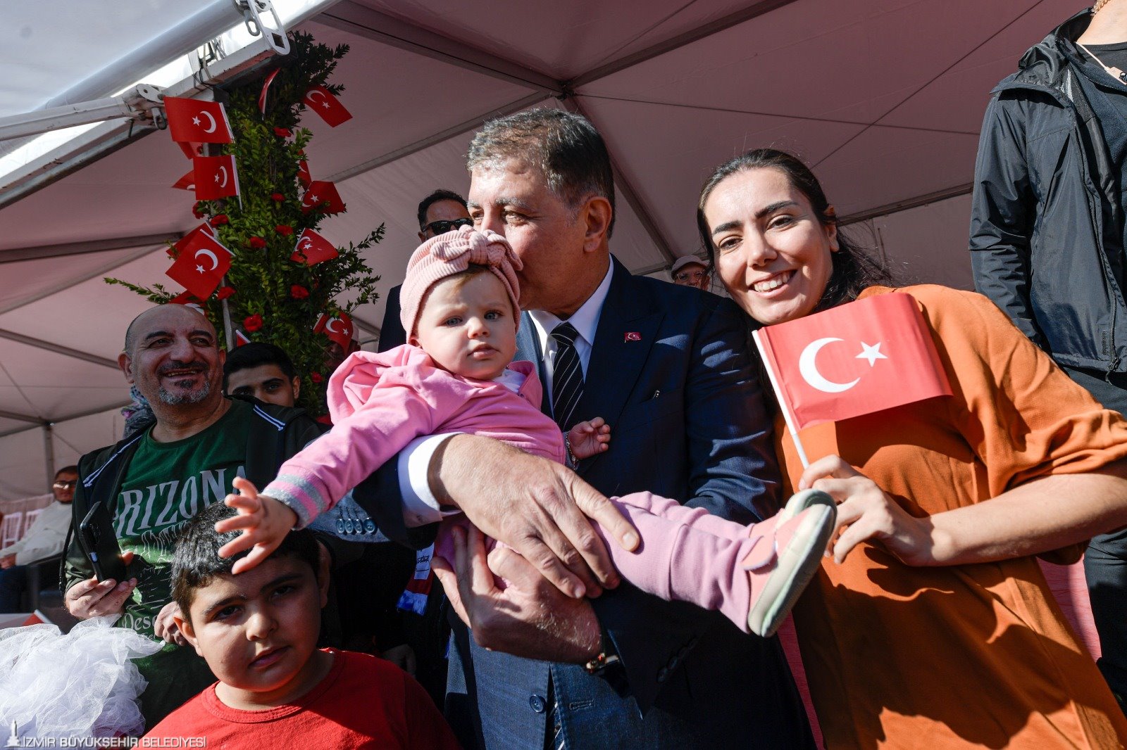 Kutlamalarda 9 aylık Pera bebekten gazilere kadar İzmirlilerle hatıra fotoğrafı çektiren Başkan Dr. Cemil Tugay, tüm ulusun bayramını kutladı. Başkan Tugay, “Vatandaşlarımızın, sivil toplum kuruluşlarımızın, kamu kurumlarımızın iştirakiyle kutladığımız Cumhuriyet Bayramı’mız, her bayram olduğu gibi bizlere bir kez daha çok büyük bir gurur verdi. Ben çocuklarımızı, gençlerimizi, sporcularımızı, sivil toplum kuruluşlarımızı, askerlerimizi izlerken bir kere daha düşündüm; çok güzel bir mirası bizlere bıraktılar. Hepimize düşen görev, bu mirası onurla taşımak, Cumhuriyeti daha ileriye götürmektir. Bu anlamda hem kıvanç duydum hem sorumluluğumuzu bir kere daha hissettim. İnanıyorum ki Türkiye Cumhuriyeti bütün zorlukları bir kere daha aşacak, bu güzel çocuklara, güzel gençlere çok güzel bir gelecek bırakacak. Bunun için ben de son nefesime kadar mücadele edeceğim” diye konuştu.
