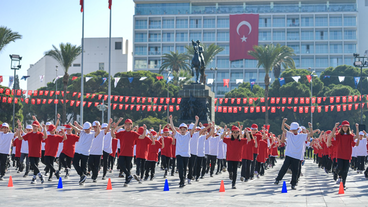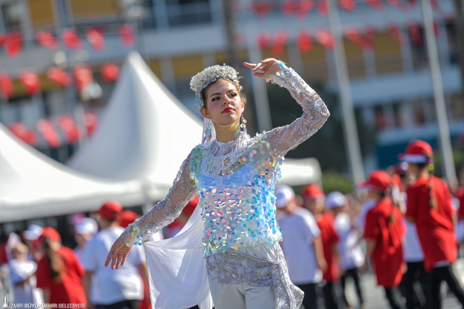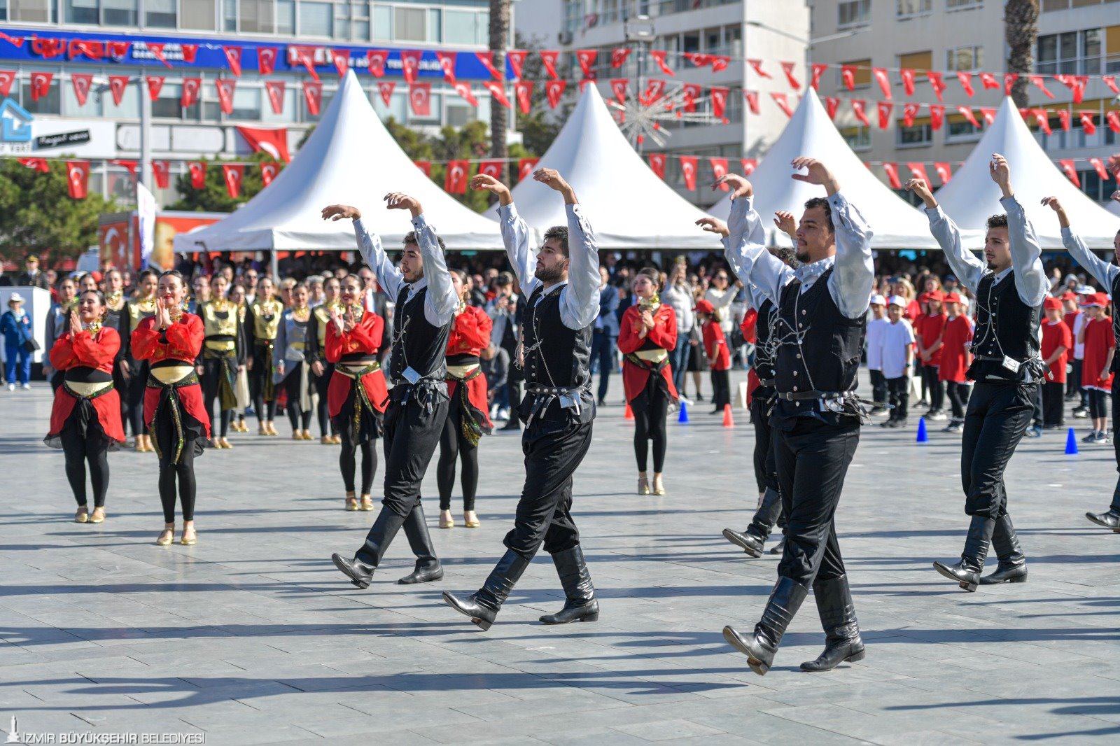 Kutlamalar kapsamında Cumhuriyet Meydanı’nda büyük şölen yaşandı. Türk Silahlı Kuvvetleri Bandosu’nun İstiklal Marşı ve saygı duruşuyla başlayan coşku, okul ve üniversitelerin halk dansları gösterileriyle devam etti. Ege Üniversitesi Halk Dansları Topluluğu, İzmir Yüksek Teknoloji Enstitüsü Dans Topluluğu’nun performanslarının ardından İzmir İl Milli Eğitim Müdürlüğü’ne bağlı okullardan 500 ilköğretim öğrencisi, çeşitli yörelerden ve modern dansların bir arada yer aldığı koreografiyi gerçekleştirdi. Marşlara ve türkülere hep birlikte eşlik eden İzmirliler, gönüllerince bayramı kutladı.