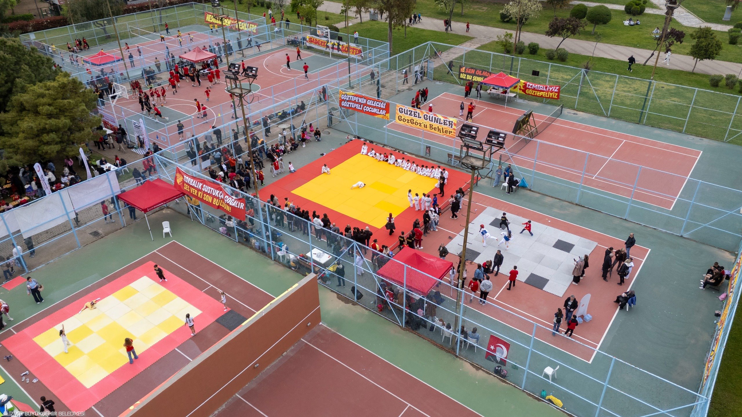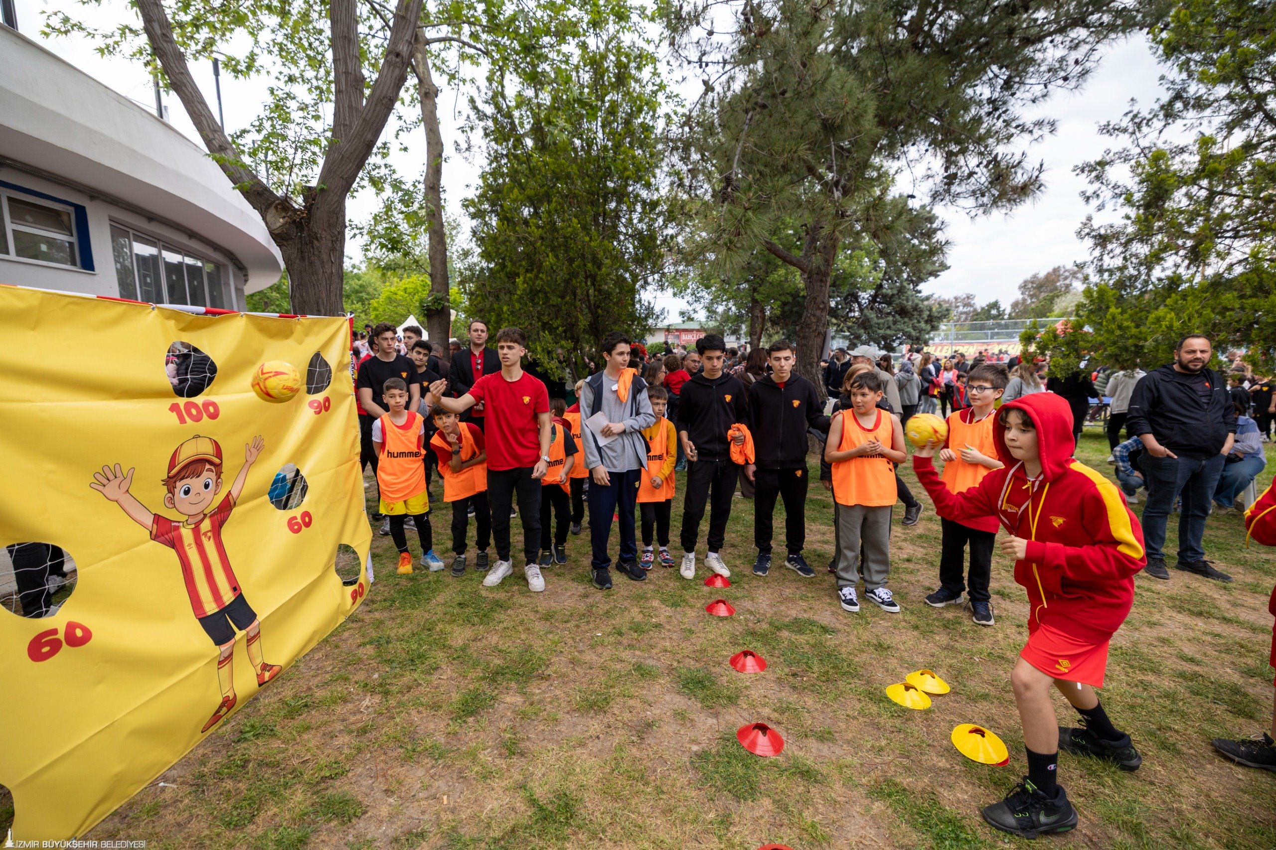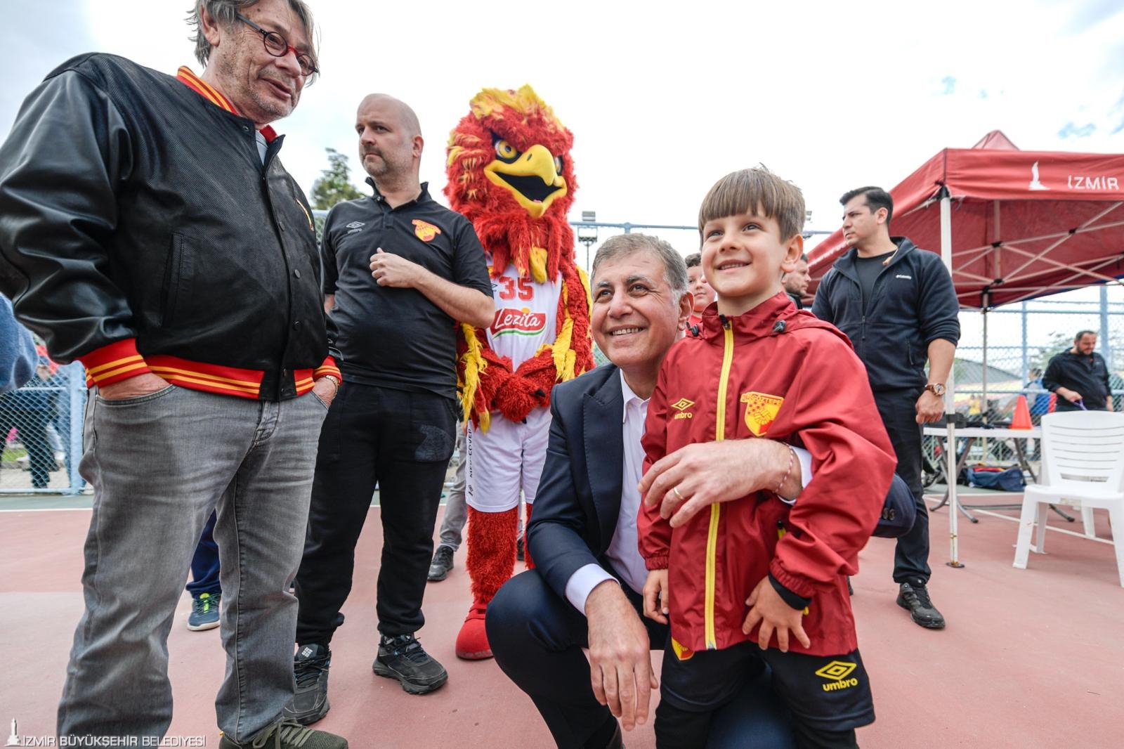 23 Nisan Ulusal Egemenlik ve Çocuk Bayramı, İzmir’de kentin dört bir yanında kutlandı. İzmirli çocukların spora teşvik edilmesine yönelik çalışmalara destek veren İzmir Büyükşehir Belediye Başkanı Dr. Cemil Tugay, İzmir Büyükşehir Belediyesi ile Göztepe Spor ve Eğitim Vakfı iş birliğiyle İnciraltı’nda düzenlenen 23 Nisan Çocuk Şenliği’ne katıldı. Göztepe Spor Kulübü Onursal Başkanı Mehmet Sepil tarafından karşılanan Başkan Tugay, şenlikteki sporcu çocuklar ve aileleri ile Göztepe’nin maskotu K’ANKA ile bir araya gelerek hatıra fotoğrafı çektirdi. Başkan Tugay, Göztepe Spor Kulübü bünyesinde okçuluk, tekvando, bale, jimnastik, voleybol, futbol ve basketbol gibi farklı branşlarda eğitim alan çocukların antrenman ve gösterilerini izledi. Olimpik Branşlar Sportif Direktörü Deniz Durmaz’dan branşlara ilişkin bilgi alan Başkan Tugay, çocuklarla satranç oynadı, futbol sahasında şut çekti ve okçuluk antrenmanına katılarak ok attı. Çocukların yoğun ilgisiyle karşılanan Tugay’a “Cemil Başkan” tezahüratları yapıldı. Şenlikteki çocuklar ve aileler ise spora verdiği destek nedeniyle Başkan Tugay’a teşekkür etti.
