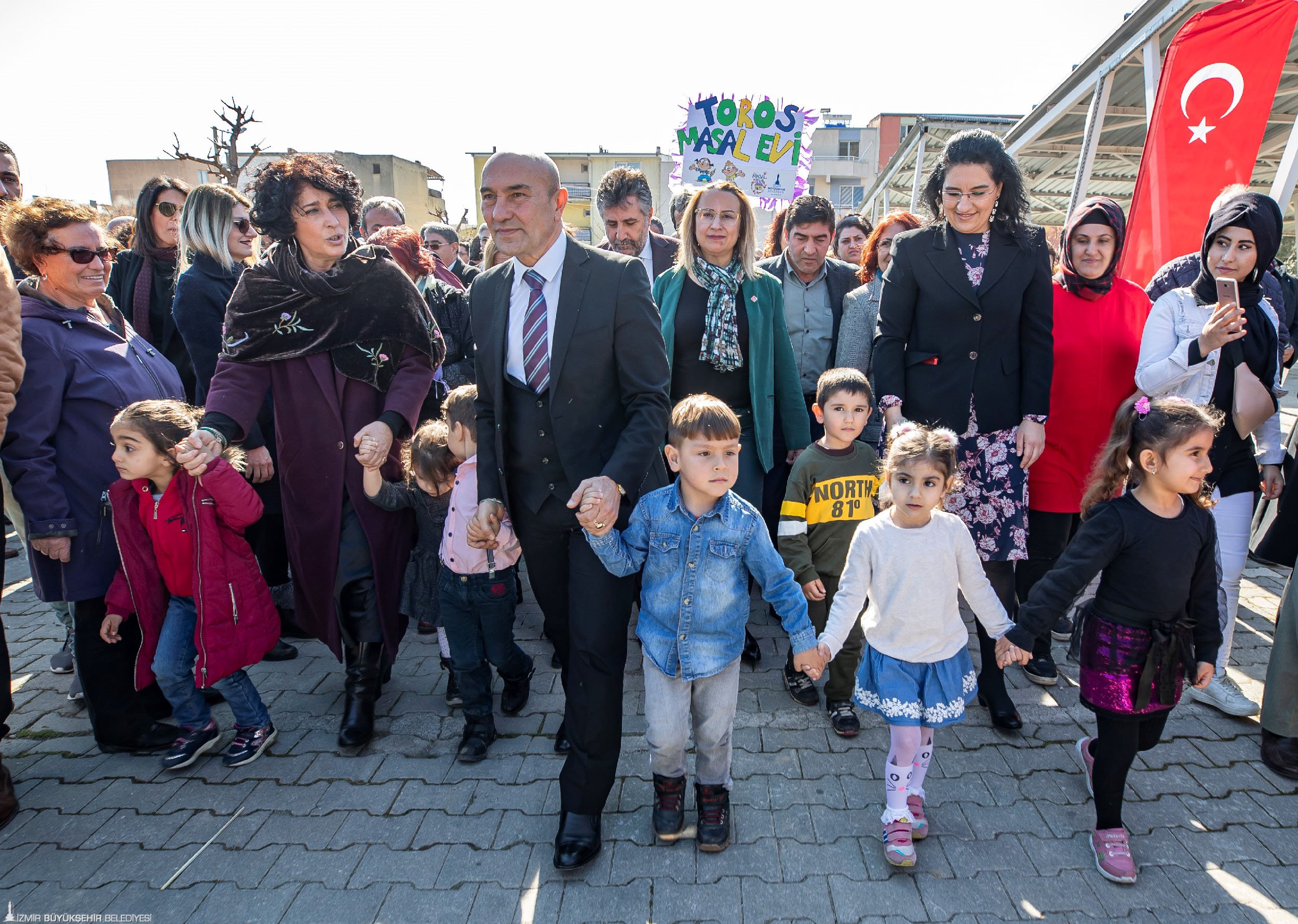 Törene İzmir Büyükşehir Belediye Başkanı Tunç Soyer ve eşi Neptün Soyer, Bayraklı Belediye Başkanı Serdar Sandal, CHP İlçe Başkanı Pınar Susmuş, İzmir Büyükşehir Belediyesi Genel Sekreteri Dr. Buğra Gökçe, İzmir Büyükşehir Belediyesi Genel Sekreter yardımcıları Aysel Özkan, Yıldız Devran, Suphi Şahin, Barış Karcı, sanatçı Işıl Yücesoy, muhtarlar, yurttaşlar ve Toros Masal Evi öğrencileri katıldı.
