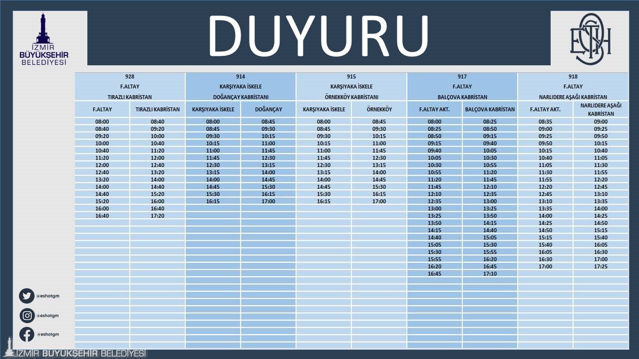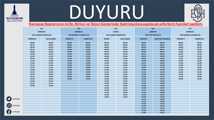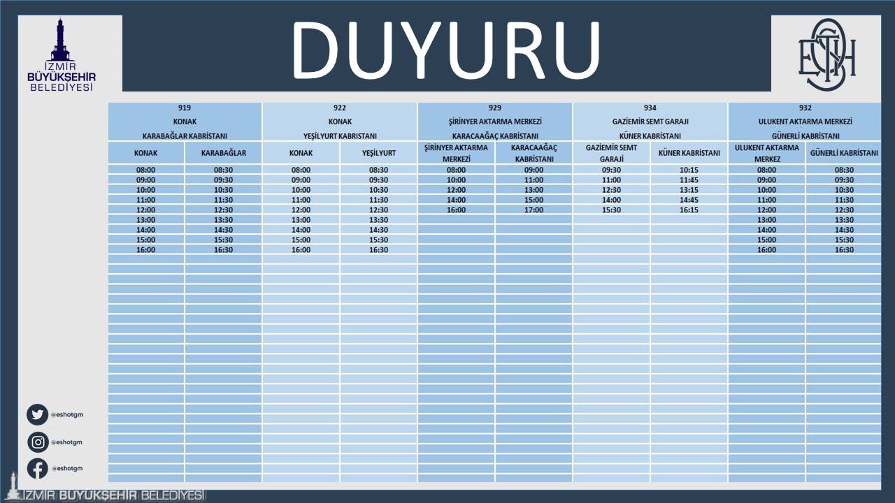 ESHOT otobüs seferleri, bayram süresince pazar günü çalışma programına göre yapılacak. Orman köyü hatları da çalışacak. ESHOT Genel Müdürlüğü, arife günü ile bayramın ilk iki günü mezarlıklara, özel seferler de yapacak. Önceki bayramlarda 12 olan mezarlık hatlarına, üç yeni hat daha eklendi. Programa ilişkin ayrıntılı bilgilere, www.eshot.gov.tr internet adresinden ulaşılabilir.