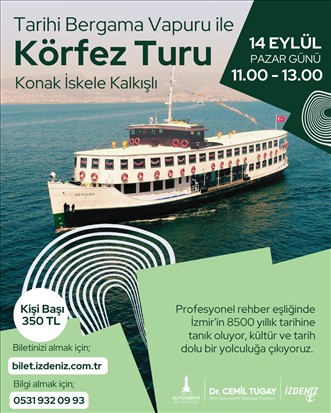 İzmir Büyükşehir Belediyesi İZDENİZ AŞ’nin Körfez’in emektarı Bergama Vapuru’yla yapılan Körfez Turları yaz molasının ardından 14 Eylül Pazar günü başlıyor. 11.00 ile 13.00 saatleri arasında düzenlenen tura katılan İzmirliler, profesyonel rehberler eşliğinde hem Körfez’in maviliklerinde keyifli anlar yaşayacak hem de kentin 8 bin 500 yıllık tarihini keşfetme imkanı bulacak. Konak İskelesi’nden hareketle başlayan 2 saatlik turda rehberler İzmir'in kıyı şeridinden görülebilen tarihi yapılar, efsaneler ve kentin tarihi ile ilgili bilinmeyen detayları misafirlere aktaracak. Fotoğraf tutkunları da turda eşsiz kareleri yakalama fırsatı bulacak. Tur sonunda ziyaretçiler yine Konak İskelesi’ne bırakılacak.