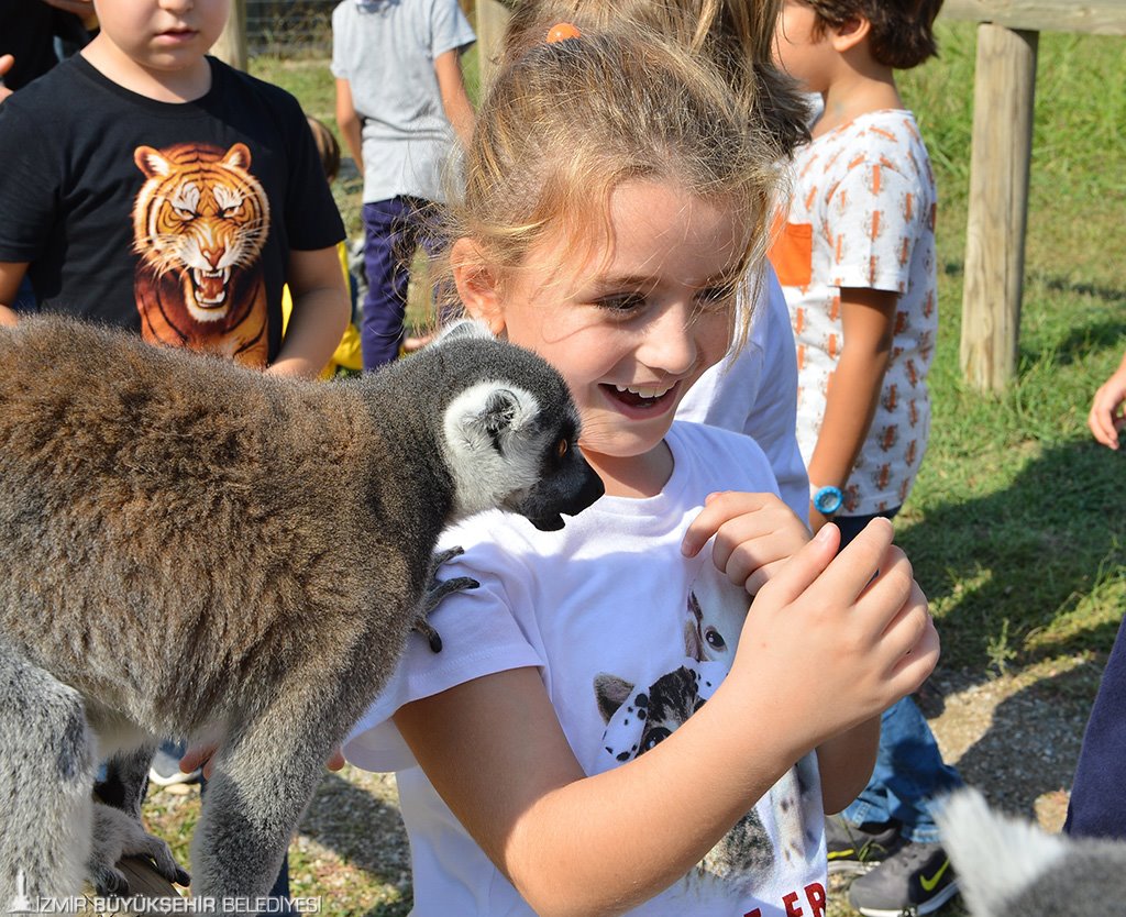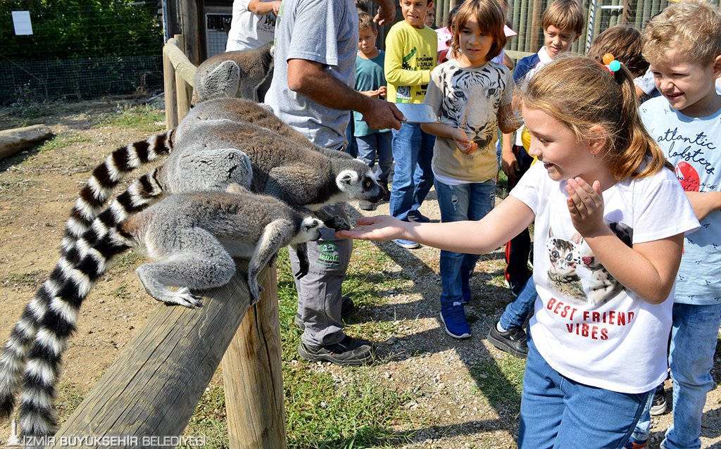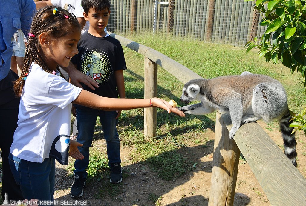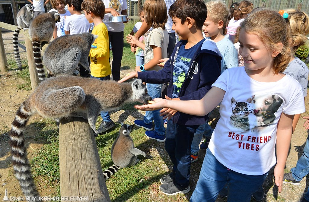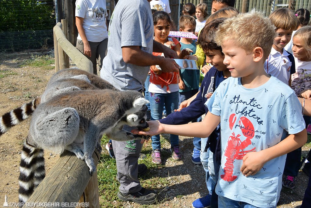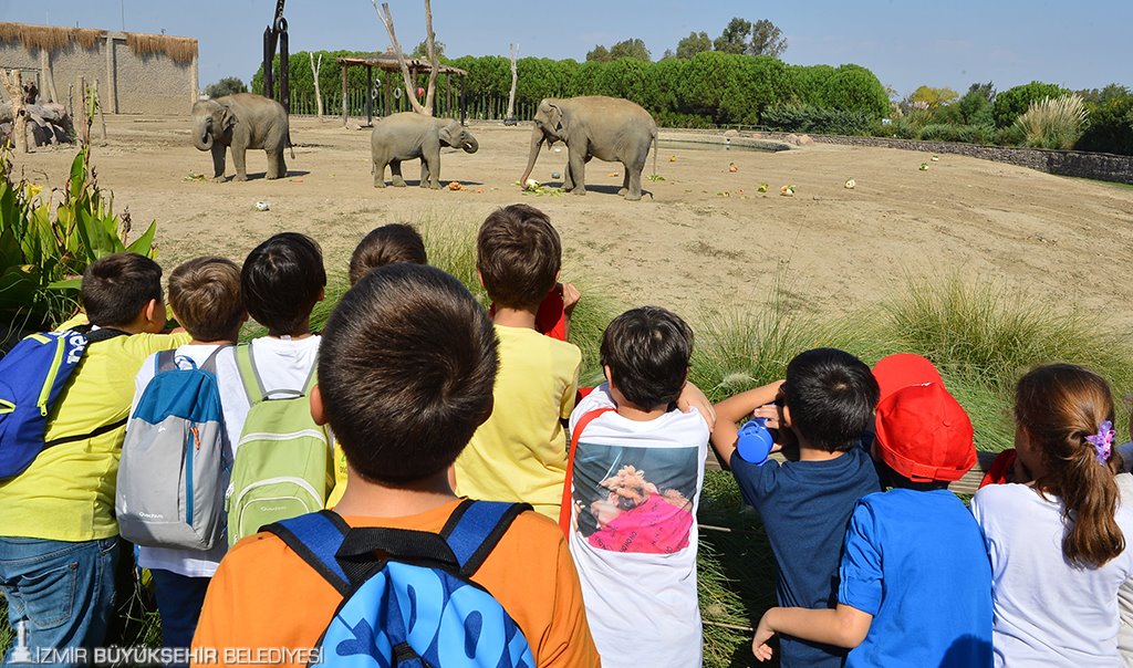 Aslandan zürafaya, fillerden ayıya kadar pek çok türü yakından tanıma fırsatı bulan çocuklar, hayvan figürlü tişörtleriyle dikkat çekti. Kendi elleriyle hazırladıkları bal kabaklı özel menüyle hem lemurları hem de fil ailesini besleme olanağı bulan minik öğrenciler, hayvanların beslenmeleri sırasında da çok keyifli anlar yaşadı. Çocuklar, fillerin barınağına önceden girip hazırladıkları yemekleri alana bıraktı; sonra da fil ailesinin nasıl yemek yediğini gördü. "İzmir" isimli fili sloganlarla karşılayan çocuklar, lemurları elleriyle beslerken de hem heyecanlandı hem de çok eğlendi.