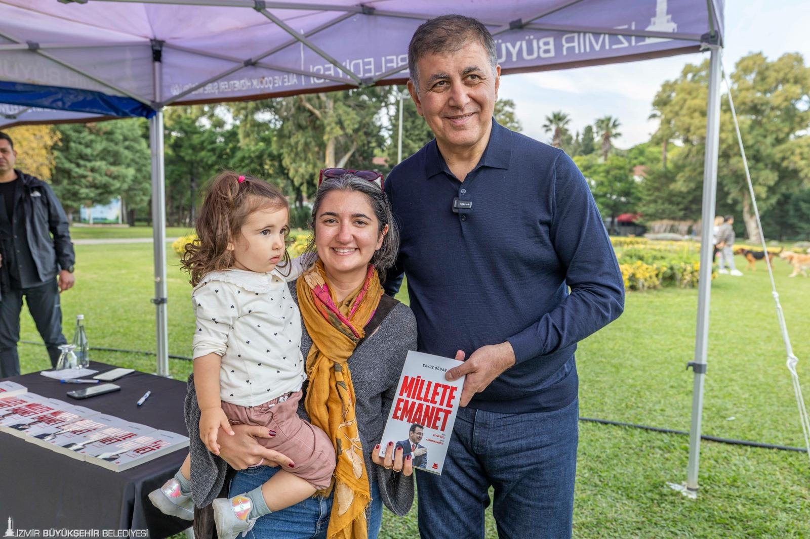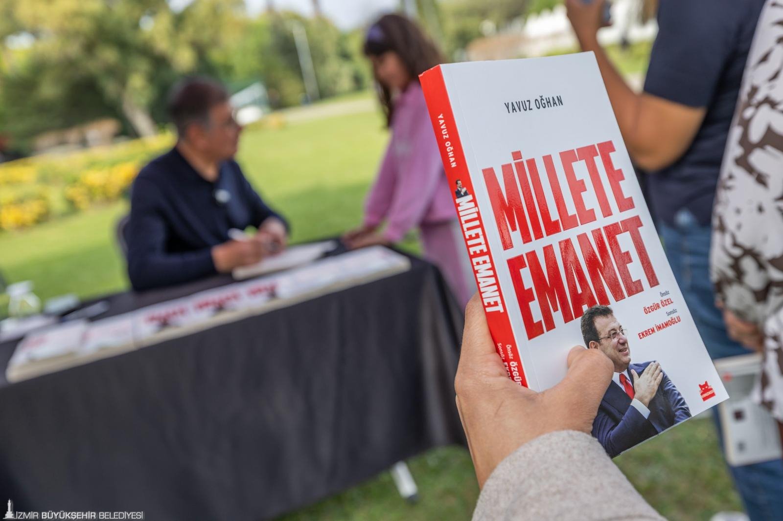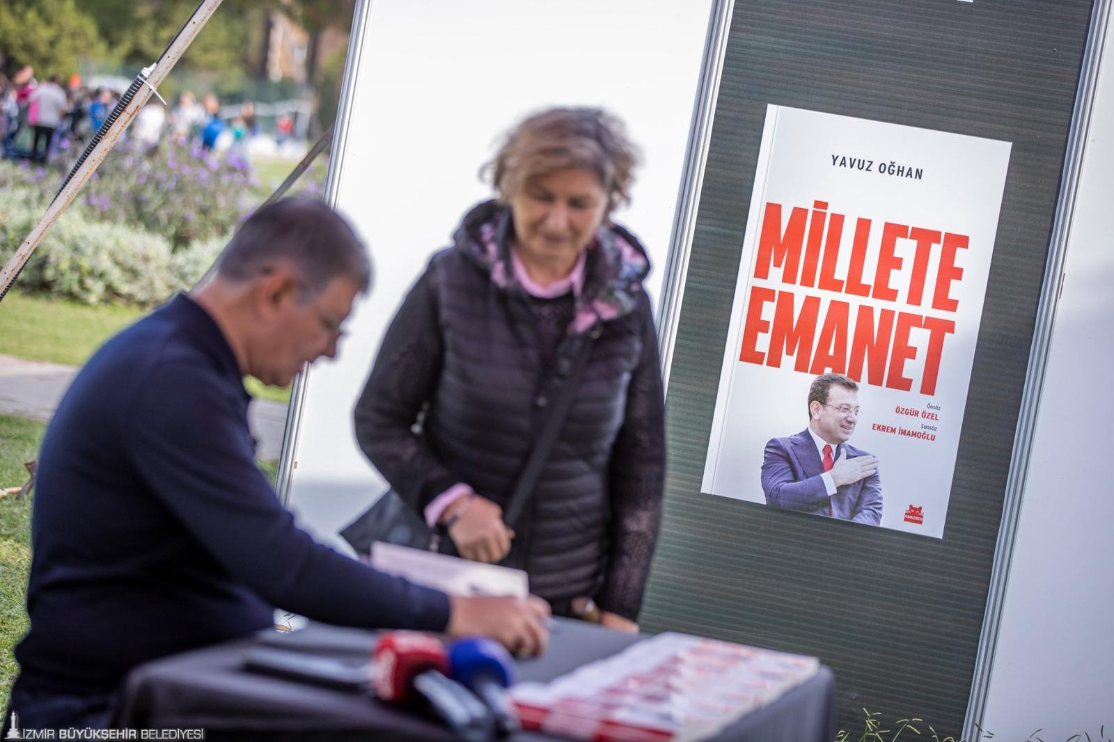 İzmir Büyükşehir Belediye Başkanı Dr. Cemil Tugay, Kültürpark’ta kapılarını açan İZKİTAPFEST - 6. İzmir Kitap Fuarı kapsamında, tutuklu İstanbul Büyükşehir Belediye Başkanı Ekrem İmamoğlu adına gazeteci Yavuz Oğhan’ın kaleme aldığı “Millete Emanet” kitabını İzmirliler için imzaladı. Ekrem İmamoğlu’nun yaşamını, mücadelesini ve ortaya koyduğu çalışmaları anlatan kitabın imza günü, İZKİTAPFEST’in ikinci gününde, Pakistan Pavyonu yanındaki imza alanında gerçekleştirildi. İmza öncesi Kültürpark’a gelen kitapseverlerle kucaklaşan Başkan Tugay, ardından İzmirlilerin kitaplarını imzaladı. Uzun kuyrukların oluştuğu imza etkinliği yaklaşık iki saat sürdü.