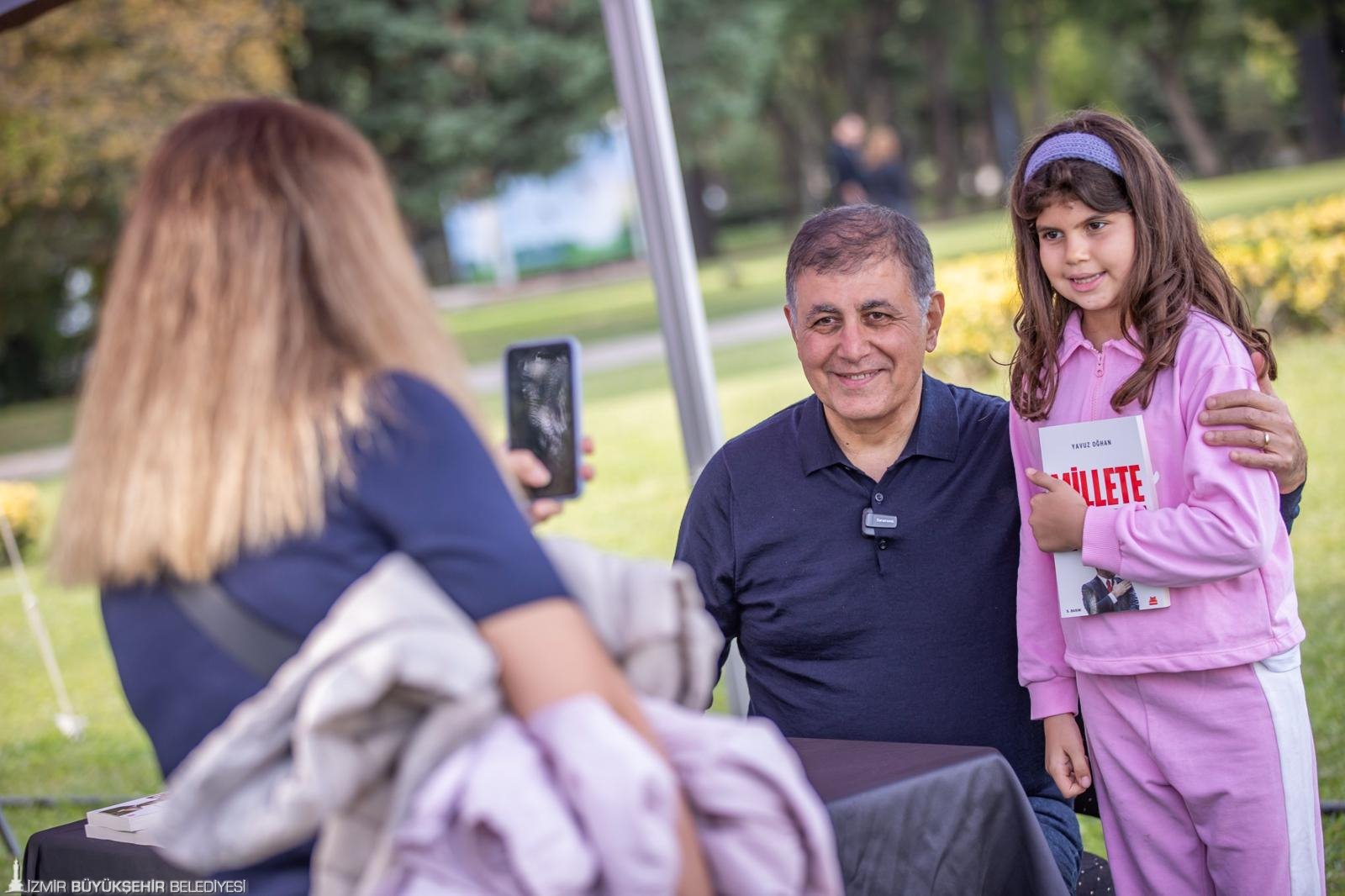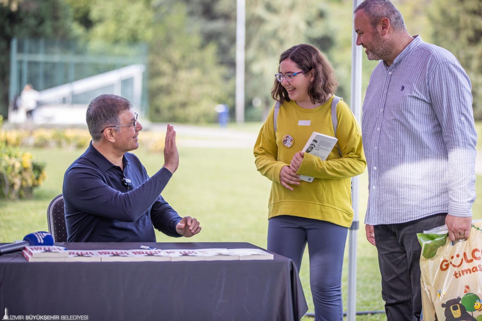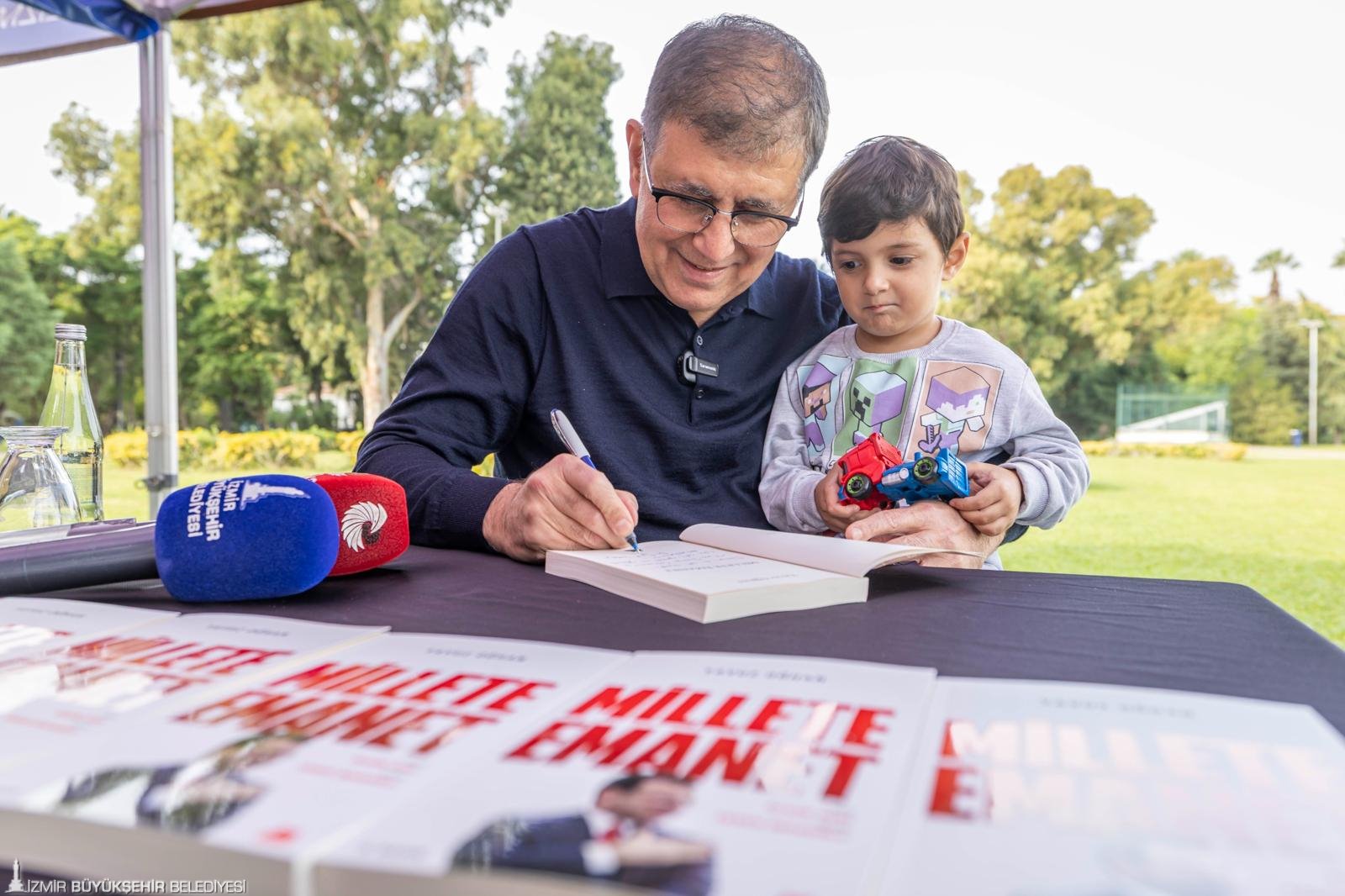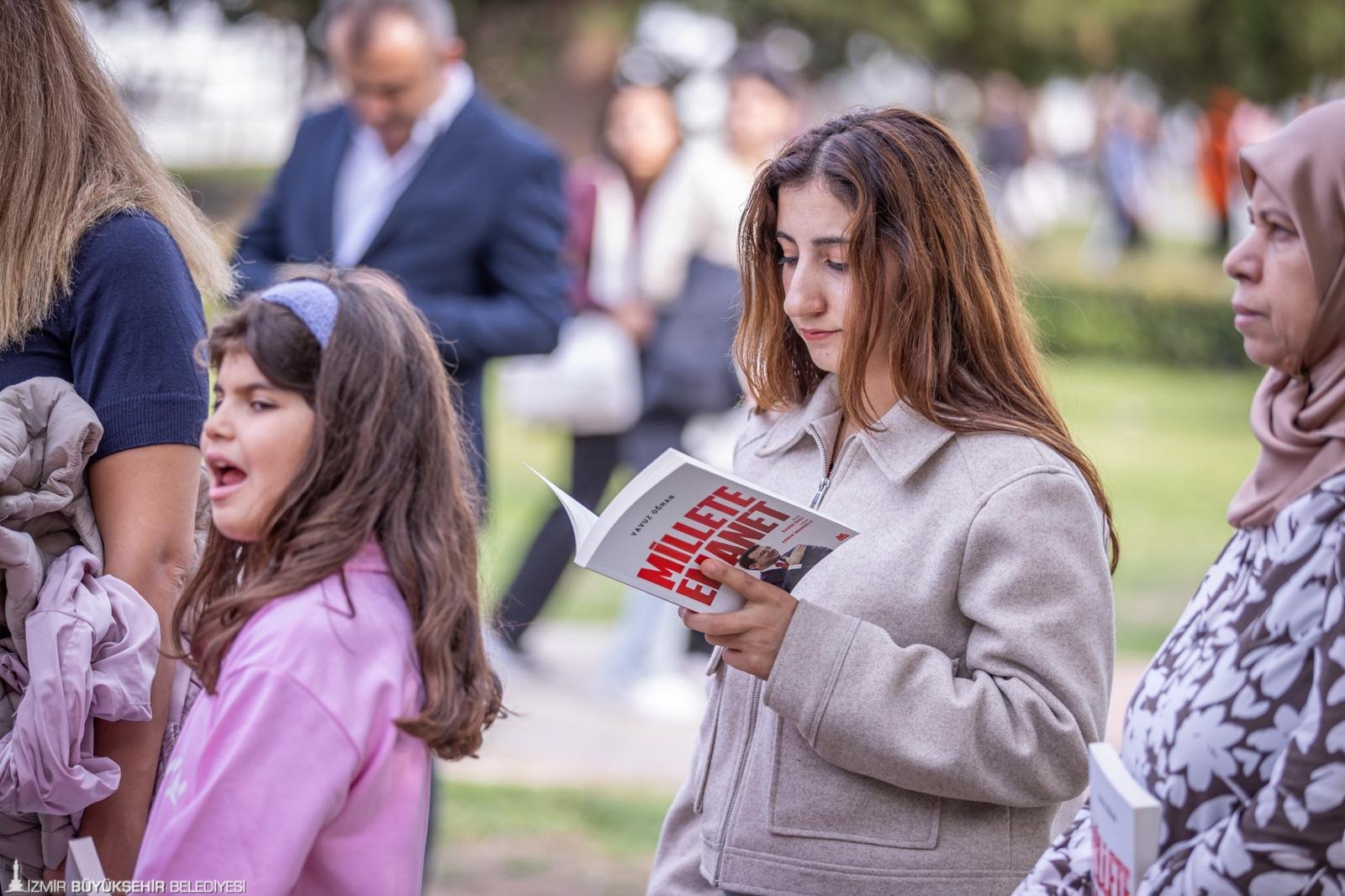 İzmir Büyükşehir Belediye Başkanı Dr. Cemil Tugay, Kültürpark’ta kapılarını açan İZKİTAPFEST - 6. İzmir Kitap Fuarı kapsamında, tutuklu İstanbul Büyükşehir Belediye Başkanı Ekrem İmamoğlu adına gazeteci Yavuz Oğhan’ın kaleme aldığı “Millete Emanet” kitabını İzmirliler için imzaladı. Ekrem İmamoğlu’nun yaşamını, mücadelesini ve ortaya koyduğu çalışmaları anlatan kitabın imza günü, İZKİTAPFEST’in ikinci gününde, Pakistan Pavyonu yanındaki imza alanında gerçekleştirildi. İmza öncesi Kültürpark’a gelen kitapseverlerle kucaklaşan Başkan Tugay, ardından İzmirlilerin kitaplarını imzaladı. Uzun kuyrukların oluştuğu imza etkinliği yaklaşık iki saat sürdü.