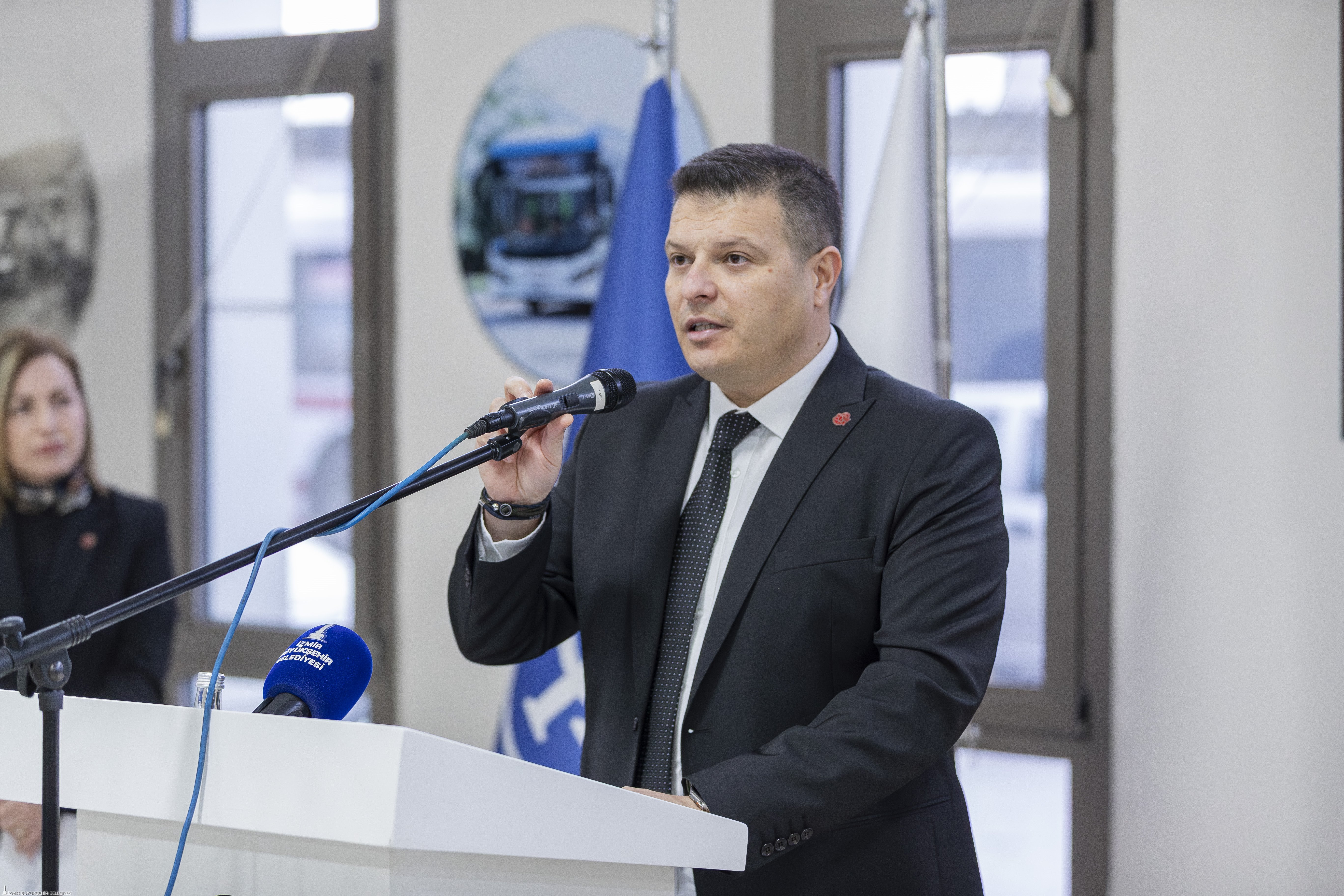 ESHOT Genel Müdürü Övünç Özgen, Başkan Dr. Cemil Tugay’a atölyede piston ve el anahtarından yapılan hediyeyi takdim etti. Özgen, “Arkadaşlarımızın atölyelerdeki hurda malzemelerden ürettiği bir piston ve anahtar var. Bu çalışma iki temel unsuru bir araya getiriyor. Piston motorun içinde gücü harekete dönüştürüyor, bu da üretimi ve sahadaki emeği temsil ediyor. El anahtarı ise, düzeni ve sorumluluğu ifade ediyor. ESHOT’un gücü işçi arkadaşlarımızın alın terinden gelir” dedi.