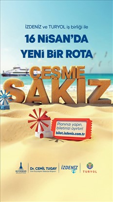 Ege’nin iki yakası arasında dostluğu, sosyal, kültürel ve ekonomik bağları güçlendirmek amacıyla İzmir Büyükşehir Belediyesi’ne bağlı İZDENİZ (İzmir Deniz İşletmeciliği AŞ) tarafından yapılan İzmir- Midilli seferlerine bu yıl Çeşme-Sakız seferleri de eklendi. TURYOL iş birliğiyle 16 Nisan’da başlayacak Çeşme - Sakız seferleri için bilet satışları başladı. Çeşme Ulusoy Limanı’ndan hareketle konforlu gemilerle yaz boyunca her gün yapılacak seferler hava şartlarına bağlı olarak yarım saat sürecek.