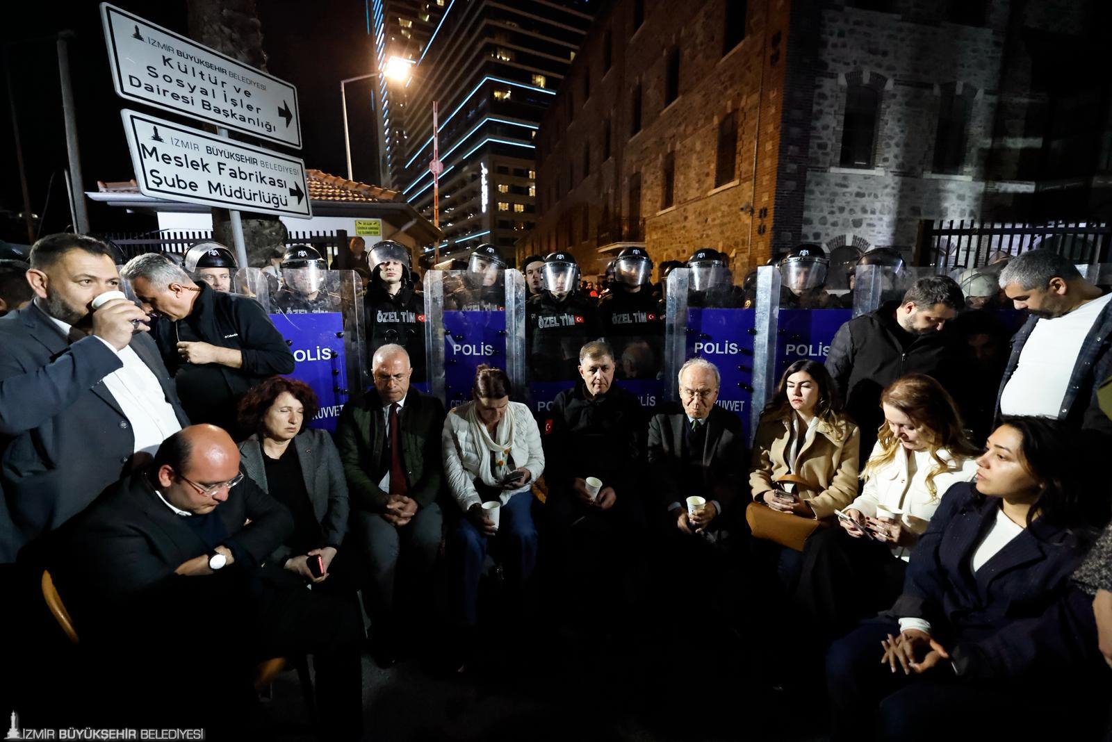 Açıklamanın ardından Başkan Cemil Tugay Meslek Fabrikası’ndaki polis barikatının önünde oturarak nöbet başlattı. Belediye başkanları, milletvekilleri, meclis üyeleri ve siyaset dünyasının bir çok önemli ismiyle birlikte vatandaşlar Başkan Tugay’ı yalnız bırakmadı.