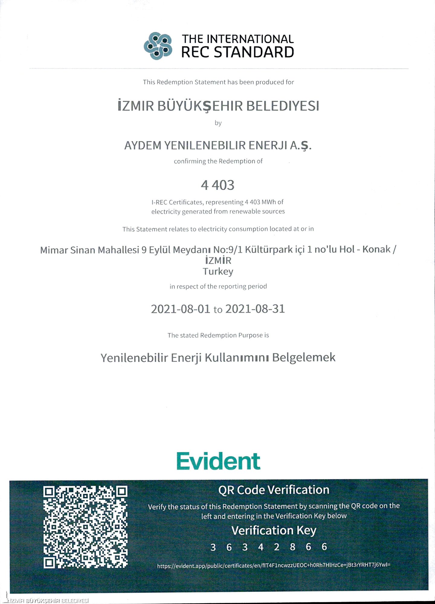 Yerel yönetimlere örnek olacak uygulama Haziran ayında başladı. İzmir Büyükşehir Belediyesi Yapı İşleri Dairesi Başkanlığı tarafından yenilenebilir enerji kaynaklarından üretilen elektrik enerjisi temini için yapılan ihaleyi AYDEM Enerji A.Ş kazandı. İzmir Büyükşehir Belediyesi belediyenin binalarında elektrik tüketiminin yenilenebilir enerji kaynaklarından kullandığını uluslararası geçerlik sahibi sertifikayla da taçlandırdı. Haziran ile Eylül ayları arasında 13 bin 965 megavat saat elektrik enerjisi yenilenebilir enerji kaynaklarından temin edildi. İzmir Büyükşehir Belediyesi, yenilenebilir enerji kaynaklarının kullanımı ile birlikte dört aylık sürede elektrik harcamalarında 3 milyon 200 bin TL’lik tasarruf yaptı.