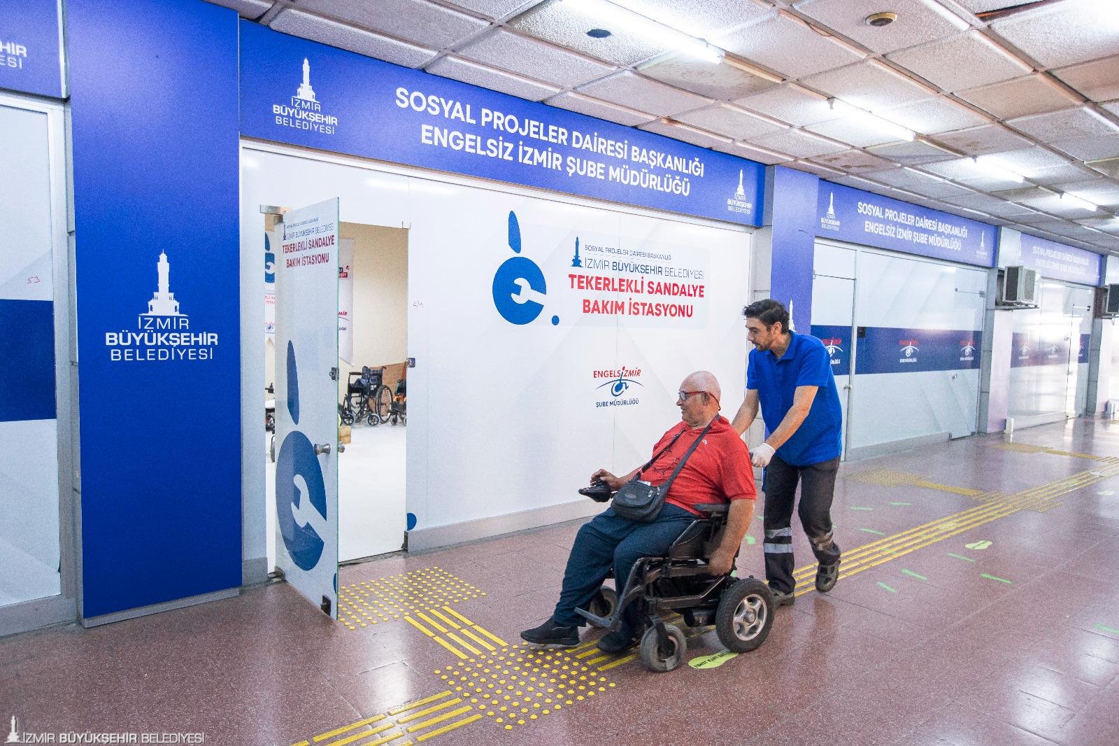 Engelli Çalışmaları Şube Müdürlüğü’nün Konak’ta bulunan Engelli Hizmet Merkezi’nde yer alan Tekerlekli Sandalye Bakım Onarım İstasyonu ise engelli bireylerin arızalanan tekerlekli sandalyelerine tıpkı bir hastane gibi tamir ve bakım hizmeti veriyor. Engelli yurttaşların hayatla en önemli bağlantısı olan tekerlekli sandalyeleri kısa süre içinde tamir edip sahibine teslim eden istasyon, bu hizmetten hiçbir ücret talep etmiyor. Merkezde ayrıca akülü tekerlekli sandalye kullanıcıları için şarj istasyonu hizmeti de sağlanıyor.