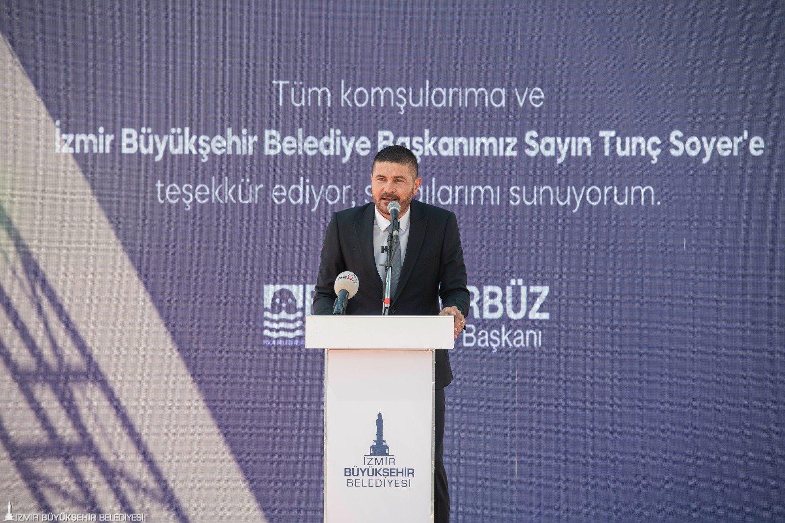 İzmir Büyükşehir Belediye Başkanı Tunç Soyer’e teşekkürlerini sunan Foça Belediye Başkanı Fatih Gürbüz, “Elini Foça’nın üzerinden çekmeyen İzmir Büyükşehir Belediye Başkanımıza sonsuz teşekkürler ediyorum. Başkanımız pandemi döneminde hepimizi topladı ve ‘Artık farklı bir belediyecilik yapacağız. Kaldırım, kanalizasyon yapılır ama insan hayatı her şeyden önemli’ dedi. Biz de onun önderliğinde vatandaşa dokunarak, yanlarında olarak hizmet etmeye çalıştık. Bugün baktığımızda çocuklarımız, kadınlarımız, dezavantajlı vatandaşlarımız için devletimizin yapması gerekenleri yerel yönetimler yapıyor. Başkanımız herkese kapılarını açıyor. Biz de ilçe belediye başkanları olarak onunla çalışmaktan onur duyuyoruz” diye konuştu.