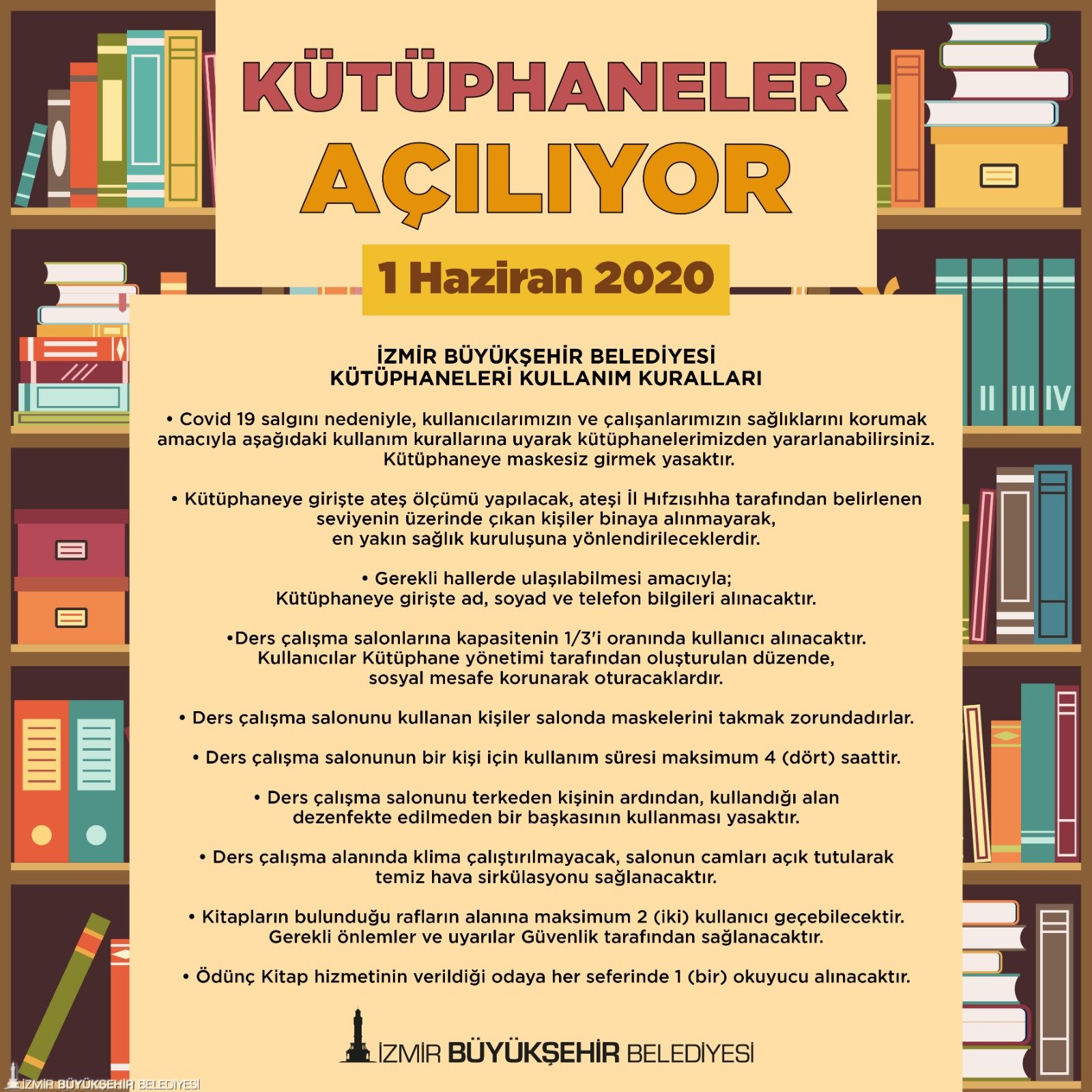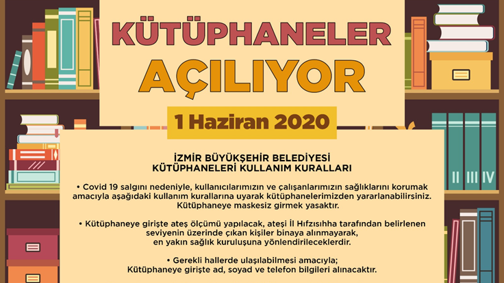 Koronavirüs salgını nedeniyle kullanıma kapatılan kütüphaneler, 1 Haziran Pazartesi başlayacak normalleşme süreci kapsamında yeniden hizmete açılıyor. İzmir Büyükşehir Belediyesi normalleşme sürecinde kütüphanelerin kurallarını açıkladı.
