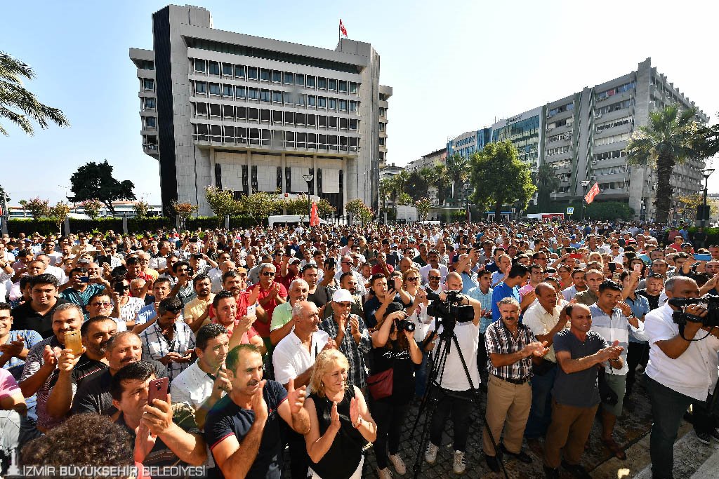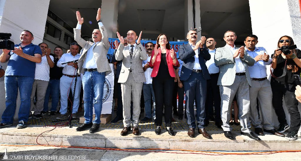 Kanun Hükmünde Kararname ile kadroya alınan ancak toplu sözleşme dışında kalan 800 taşeron işçiye ilişkin de bir açıklama yapan Başkan Soyer, şunları söyledi: “Ağustos ayında alacağımız Meclis kararı ile bu arkadaşlarımızın mağduriyetini gidereceğiz. Birleşe birleşe sadece biz kazanmayacağız. İzmir kazanacak. Türkiye kazanacak. Sizin yüzün gülmüyorsa bizim yüzümüz gülmez. Bundan emin olabilirsiniz. ‘Kurtuluş yok tek başına ya hep beraber ya hiçbirimiz’ sloganını aklımıza, ruhumuza kazımamız lazım. Emeğin, özgürlüğün, demokrasinin yeşerdiği bir Türkiye, aydınlık bir gelecek bizi bekliyor. Ancak bu bize altın tepsilerde sunulmayacak. Biz bunu alın terimizle, emeğimizle, bileğimizin hakkıyla söke söke alacağız. Bundan sonra önümüze bakacağız. Bugünden itibaren ne sizlerin ne bizim mazeretimiz yok. El birliği ile aydınlık bir ülke için üzerimize düşeni yapacağız. Eğer süpürge yapıyorsak yerde tek izmarit bırakmayana kadar süpüreceğiz. Şoförsek yolcularımızı kazasız ulaştırıp, güler yüzle hizmet edeceğiz. Kim nerede ne iş yapıyorsa en iyisini yapmaya çalışacak. İşçi arkadaşım en iyi işçi, başkan arkadaşımız en iyi başkan olacak. Türkiye’nin yükünü, Türkiye’nin geleceğini omuzlarınızda hissedin”.