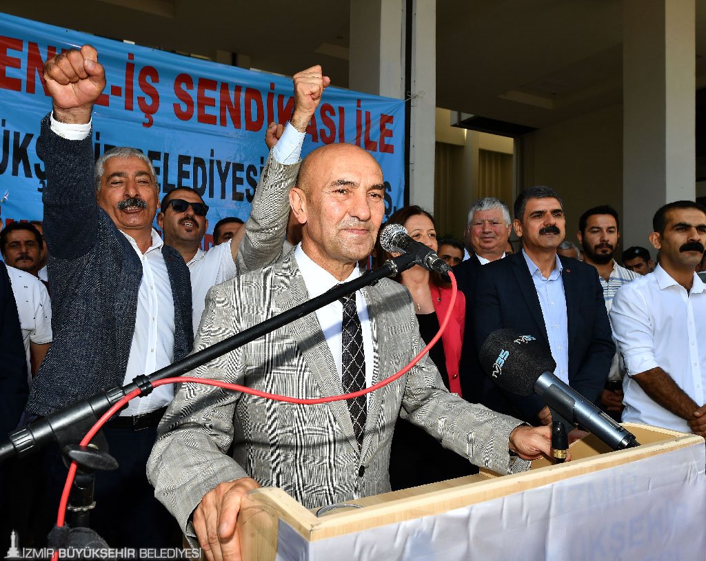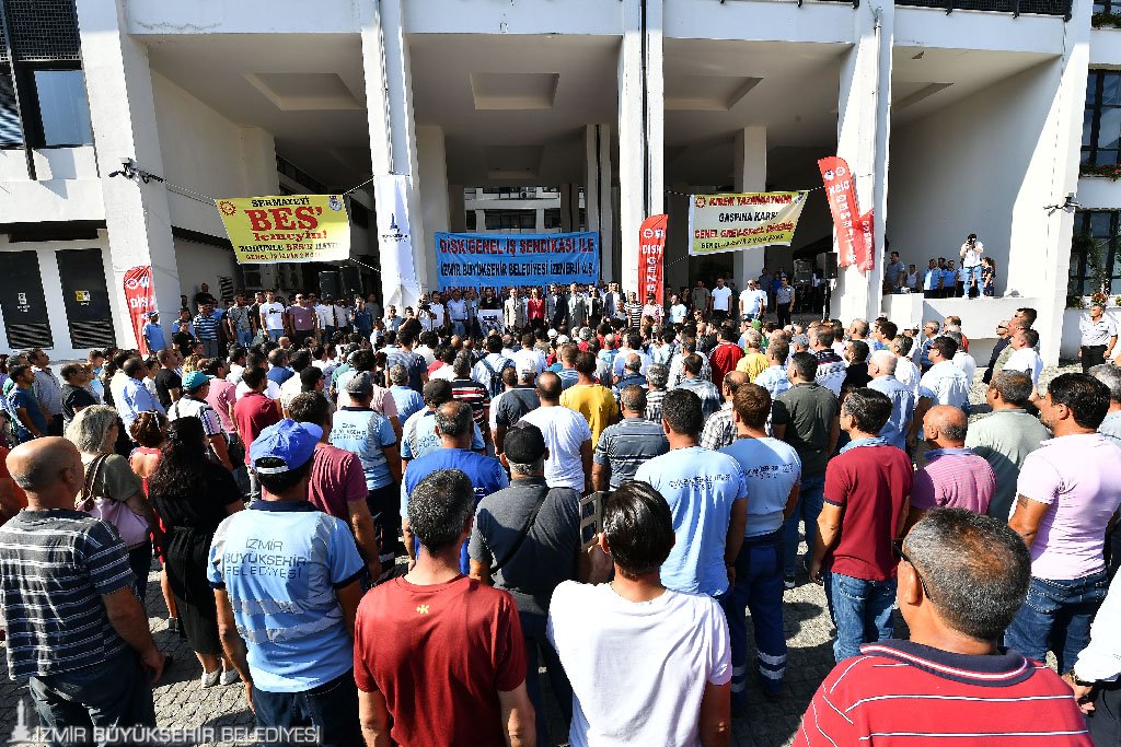 DİSK Genel Başkanı Arzu Çerkezoğlu, KHK ile kadroya alınan ancak topu iş sözleşmesinden yararlandırılmayan mağdur işçilere destek olan İzmir Büyükşehir Belediye Başkanı Tunç Soyer’e ve belediye yönetimine bu onurlu davranışları nedeniyle teşekkür etti. Çerkezoğlu, imzalan toplu iş sözleşmesinin, yan yana gelişlerin ülkenin içinde bulunduğu dönemde demokrasi kalesi olması açısından da çok önemli olduğunu söyledi. Genel -İş Genel Başkanı Remzi Çalışkan, Genel- İş Örgütlenme Daire Başkanı Taner Şanlı, Genel -İş İzmir 2 No'lu Şube Başkanı Arif Yıldız da kısa birer konuşma yaparak emek dostu İzmir Büyükşehir Belediye Başkanı Tunç Soyer'e ve belediye bürokratlarına teşekkür etti.