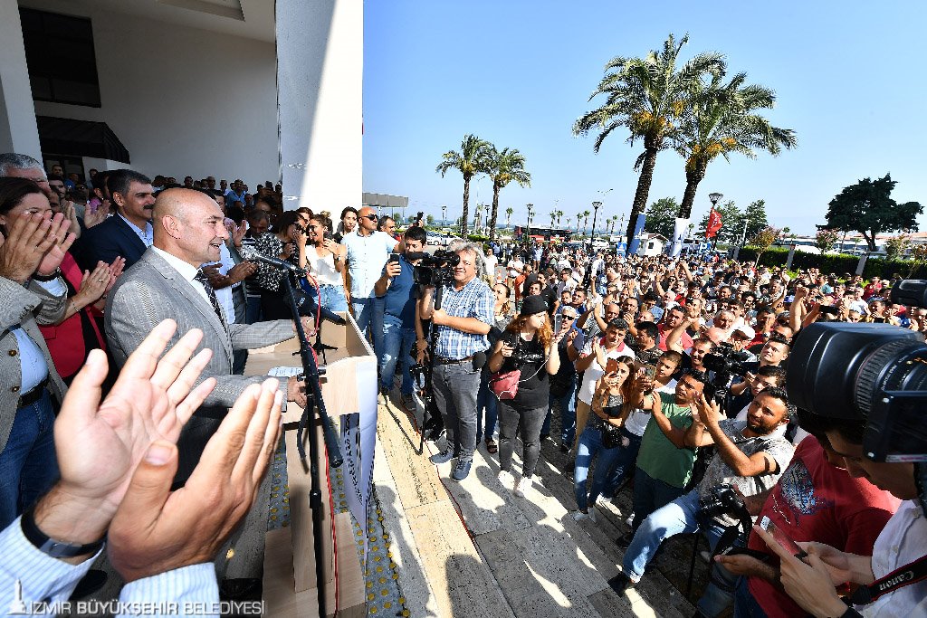 İşçilerin alkışları eşliğinde belediye önüne gelen İzmir Büyükşehir Belediye Başkanı Tunç Soyer, 31 Mart’tan bu yana Türkiye’de değişim rüzgarı estiğini, kibrin, ötekileştirmenin geride kaldığı, mütevazi, samimi, haktan yana, şeffaf, hesap verilebilir, yönetime katılma isteğine dayanan bir dip dalgasının giderek büyüyeceğini söyledi. Değişimin öncülüğünü İzmir’in yapacağını ve İzmirlilerle gurur duyduğunu söyleyen Başkan Soyer, İZENERJİ ile yapılan toplu sözleşmede eşit işe eşit ücret hedefine ulaşma yolunda önemli bir aşama kaydettiklerini, birkaç sene içinde bu hedefe ulaşacaklarını dile getirdi.