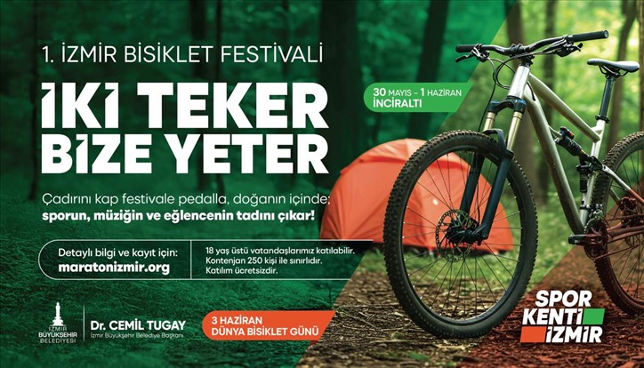İzmir’de 3 Haziran Dünya Bisiklet günü festivalle kutlanacak. İzmir Büyükşehir Belediyesi’nin kentte bisiklet kullanımını artırmak ve sağlıklı yaşamı kente yaymak amacıyla bu yıl ilkini düzenlediği festival “İki Teker Bize Yeter” sloganı ile 30 Mayıs ile 1 Haziran tarihleri arasında İnciraltı Spor Tesisleri’nde olacak. 18 yaş üstü katılımcılar, yanlarında getirdikleri çadırlarla festival alanında kamp kuracak, atölyelere katılacak ve kent içinde bisiklet sürüşleri yapacak. Festivale dâhil olmak isteyenler, maratonizmir.org web adresinden kayıt yaptırabilecek. Program 250 kişi ile sınırlı olacak.