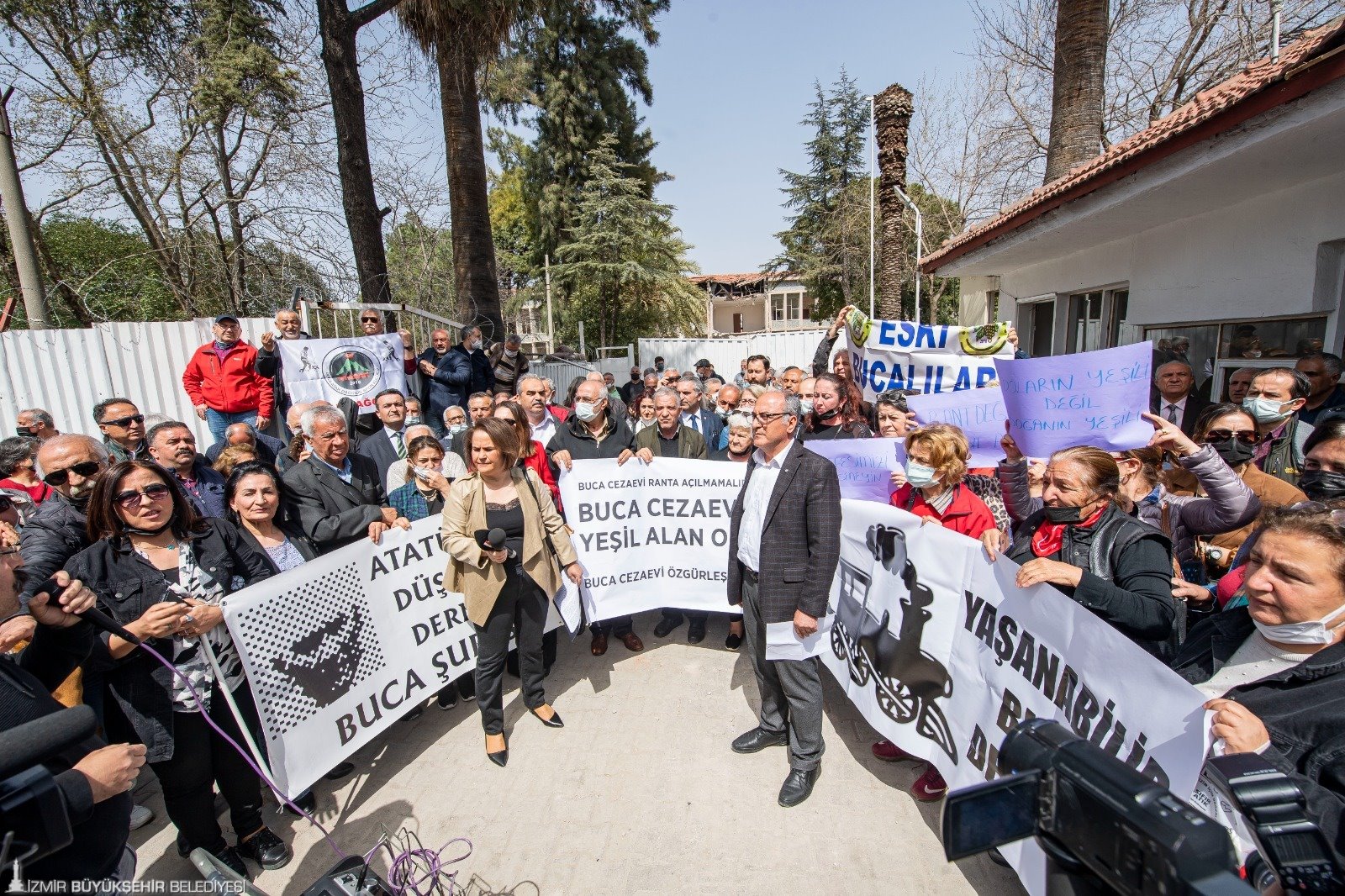 Yıkım çalışmaları devam eden Buca Cezaevi’nin arazisini konut yapılaşmasına açacak plan değişikliğine karşı 50’ye yakın kuruluştan oluşan Buca Cezaevi Özgürleşirken Platformu cezaevinin önünde basın açıklaması yaptı. “Doların yeşili değil, doğanın yeşili”, “Nefesimizi kesmeyin”, “Rant değil, yeşil alan” pankartları açan platform üyeleri, “Söz, yetki, karar Buca halkının”, “Bu alan Buca’nın, sermayeye verilmez”, “Cezaevi alanı ranta teslim edilemez” sloganları attı.