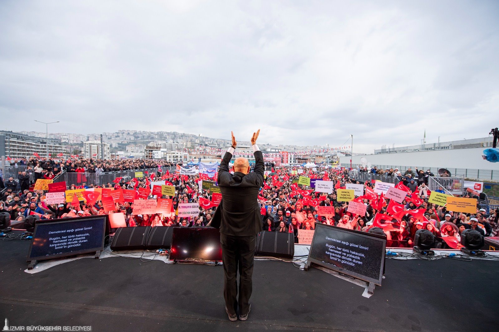 “Cumhuriyetimizin 100’üncü yılına nakşettiğimiz bu eser, Çiğli Tramvayımız, toplamda 14 duraktan ve 12 kilometreden oluşuyor. Karşıyaka’daki mevcut tramvay hattıyla bağladığımız Çiğli Tramvayı ile günde 100 bin İzmirliyi güvenle seyahat ettireceğiz. Metromuzun 19 Şubat’a kadar devam edecek olan deneme seferleri, tüm yolcularımıza ücretsiz hizmet verecek. Biz 5 yılda kimsenin cebinden 1 kuruş çıkmadan, tek bir lira kamu kaynağını israf etmeden, İzmir tarihinin en büyük yatırımlarını İzmir'e getirdik. İzmir’in tarihinde bir dönüm noktası olan raylı sistem devrimlerimizi, görev sürem içinde tamamlamanın büyük gururunu yaşıyorum. Bu tarihi günde, huzurunuzda bir kez daha söz veriyorum. Sizlerin takdirleriyle, son nefesime kadar İzmir aşkıyla, bu güzel şehre hizmet etmeye devam edeceğim. İzmir’in hakkını çalmak isteyen yolsuzlara, İzmir’i ganimet olarak gören haramilere, bu şehrin kendi karakterini ve cumhuriyete olan sadakatini hor gören dalkavuklara asla geçit vermedim. Vermeyeceğim. İzmir, bir kere daha halkın cebini boşaltıp, kendi kesesini doldurmaya çalışan haramilerin hayallerini süslüyor. Ben, bu güne kadar olduğu gibi bundan sonra da onların hepsiyle göğüs göğse mücadele etmeye hazırım! Benimle birlikte direnmeye var mısınız? İzmir’i bu ülkenin, demokrasi, refah, kardeşlik ve barış neferi olarak daha da güçlendirmeye hazır mısınız? Birlikte daha da umutlu ve coşkulu bir yürüyüşe hazır mısınız? Çiğli Tramvayı, buradaki kararlılığımızın en güzel eserlerinden biridir. İzmir’in en yeni raylı sistem hattı, Çiğli Tramvayımız, 4 buçuk milyon İzmirliye, bütün İzmir’e hayırlı uğurlu armağan olsun. Daima demokrasi. Daima Cumhuriyet. Daima İzmir”.