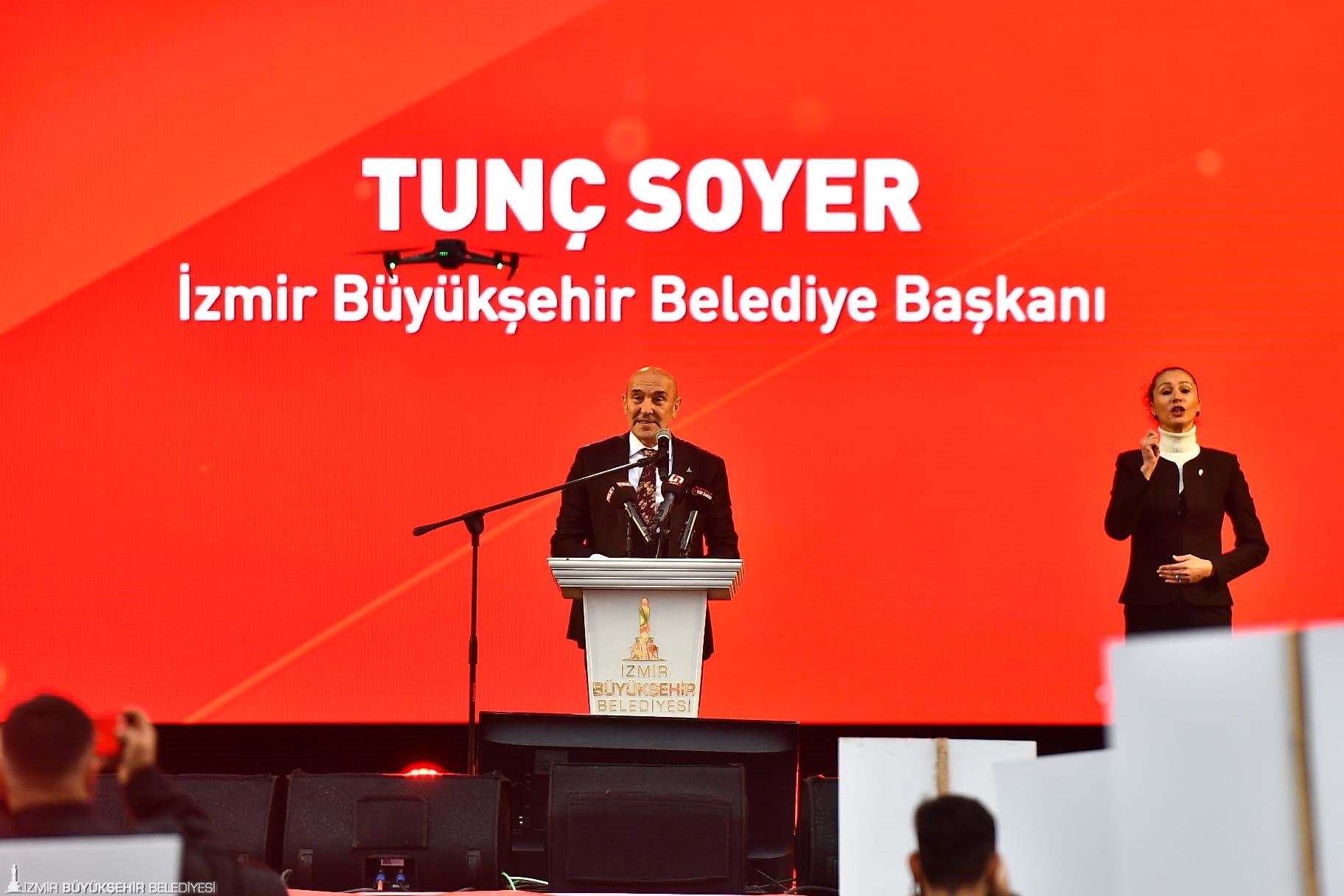 Başkan Soyer, “Daha dün gibi hatırlıyorum. 5 yıl önce, İzmir’i demir ağlarla öreceğiz dediğimizde bize inanmayanlar oldu. Birileri, bunlar hayal satıyor, bundan öncekiler yapamadı. Bunlar da yapamaz dediler. Yaptık. ‘Bunlar parayı bulamaz’ dediler, bulduk. ‘Bunlar kendi söküğünü dahi dikemez, İzmir’i bize verin dediler’, ama her zaman yaptıkları gibi unuttular. Bizler, Mustafa Kemal’in evlatlarıyız kardeşim. Güzel İzmirliler, bizim bu şehre duyduğumuz bağlılığın aşamayacağı hiçbir engel yoktur. Bizi gömmeye çalıştılar, tohum olduğumuzu unuttular. Her daim çoğaldık. Onların bizi yıkıldık sandığı yerden, her daim şahlanıp kalktık ayağa. Biz, bu topraklar için canını veren Kuvayi Milliyeyiz. Yörük Ali Efe’yiz, Börklüce Mustafa’yız, Hasan Tahsin’iz” diye konuştu.