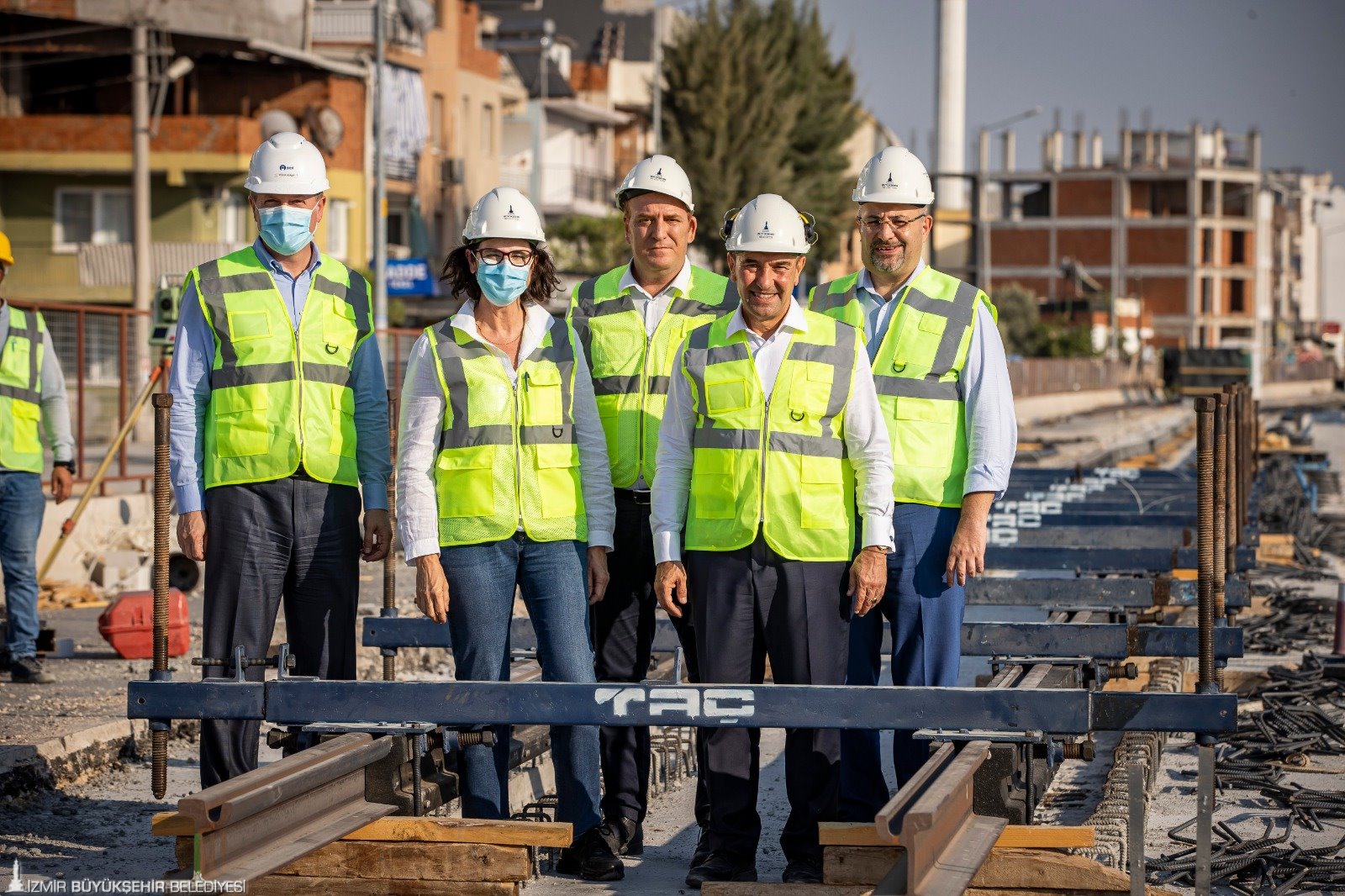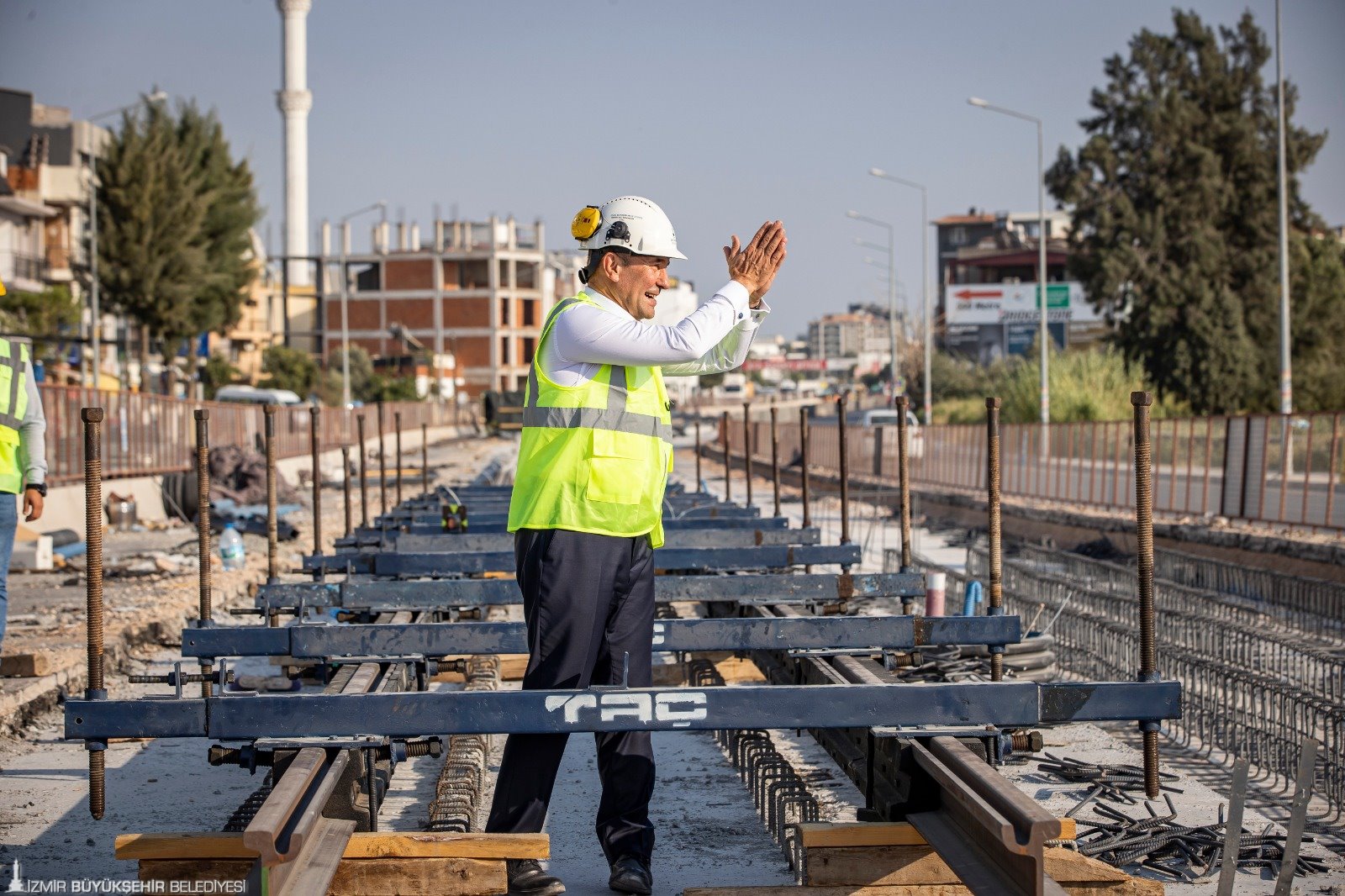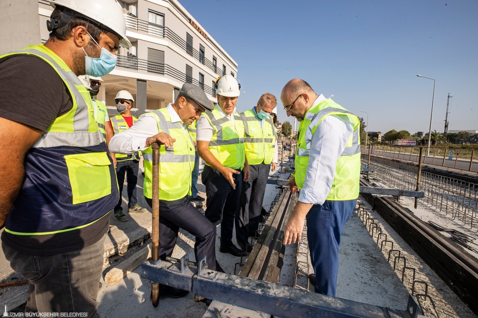 İzmir Büyükşehir Belediye Başkanı Tunç Soyer Çiğli Tramvayı inşaatındaki çalışmaları inceledi. Evka-5 kavşağında süren imalatlar ile ilgili İzmir Büyükşehir Belediyesi Raylı Sistem Dairesi Başkanı Mehmet Ergenekon'dan bilgi alan Başkan Tunç Soyer, bölgedeki çalışmalar kapsamında tramvayın ilk raylarının döşendiğini müjdeledi. “İzmir'i demir ağlarla örüyoruz” vizyonuyla yola çıktıklarını belirten Soyer, “Bugün o demir rayları montajı başlamış olarak görmek, yüreğimize su serpiyor. Pandemiye rağmen, sıcak havaya rağmen arkadaşlarım hiç aksatmadan çalışmalarını sürdürüyor. Bundan büyük gurur duyuyorum” dedi.