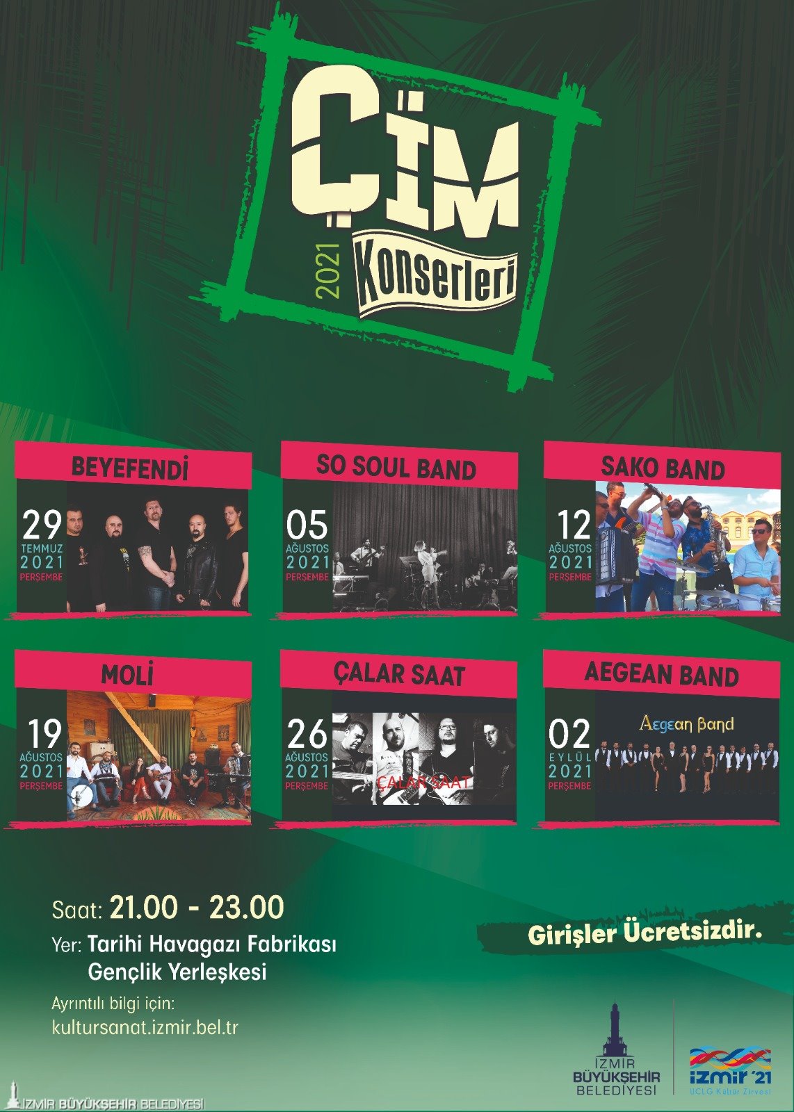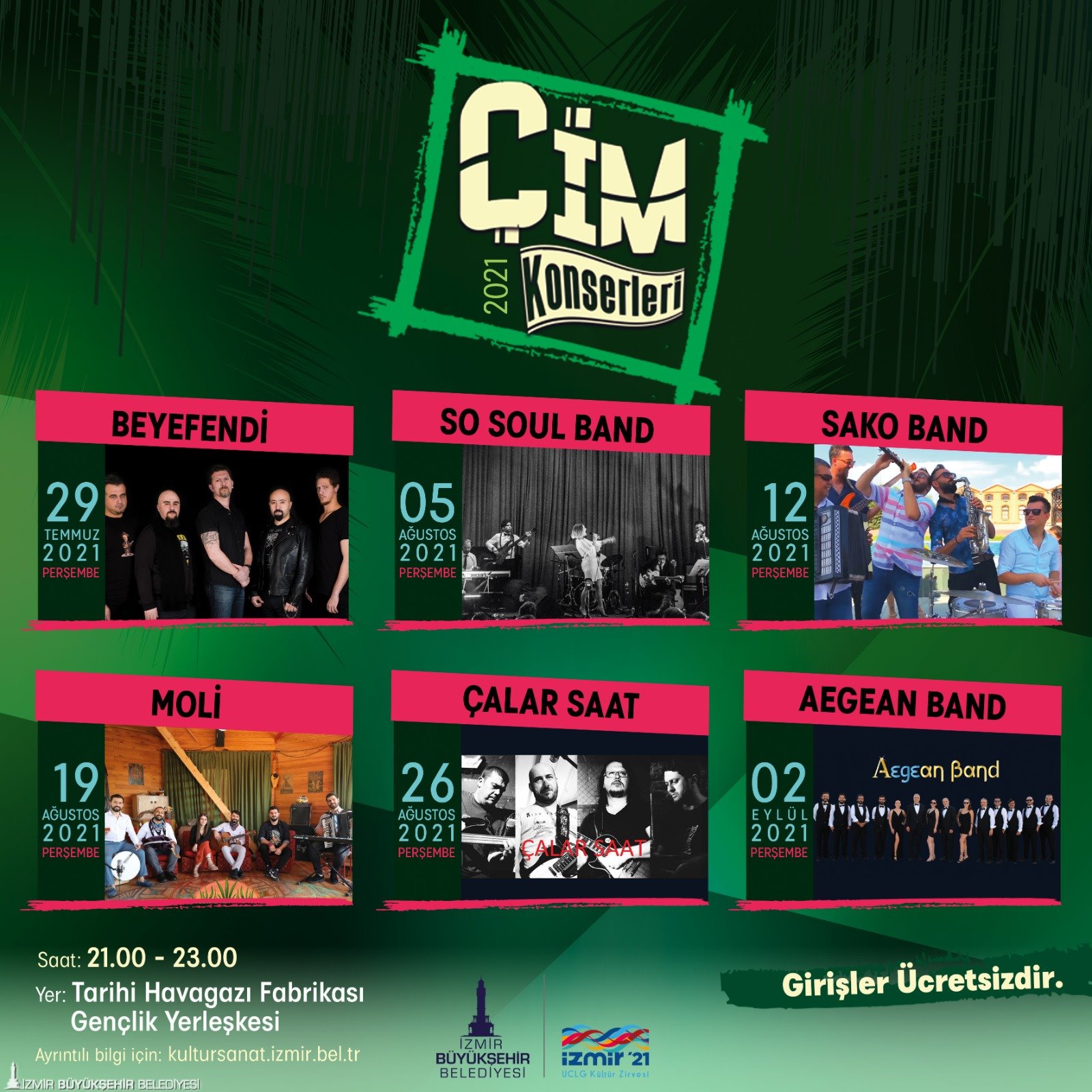 İzmir Büyükşehir Belediyesi tarafından 2009’dan bu yana düzenlenen “Çim Konserleri” bu sene İzmirli grupları ağırlayacak. Tarihi Havagazı Fabrikası Gençlik Yerleşkesi’nde Perşembe gecelerine renk katacak konser serisi 29 Temmuz’da Beyefendi grubuyla başlayacak. Ücretsiz konserler 2 Eylül’e kadar devam edecek.