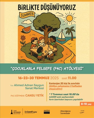Düzenlediği atölyelerle hem çocuklara hem de yetişkinlere farklı deneyimler sunan İzmir Büyükşehir Belediyesi Ahmed Adnan Saygun Sanat Merkezi, bu kez 8-10 yaş arası çocuklara yönelik “Birlikte Düşünüyoruz Çocuklarla Felsefe (P4C) Atölyesi”ni hayata geçirecek. Eğitmen Cansu Yetik eşliğinde haftada bir gün olmak üzere üç hafta sürecek bu özel atölye, çocukların eleştirel, yaratıcı, iş birlikçi ve özenli düşünme becerilerini geliştirmeyi amaçlıyor. 16, 23, 30 Temmuz tarihlerinde saat 11.00’de gerçekleştirilecek ücretsiz atölyenin kontenjanı 20 kişiyle sınırlı tutuluyor. Veliler, https://www.aassm.org.tr/ adresindeki form üzerinden atölyeye kayıt yaptırabiliyor.