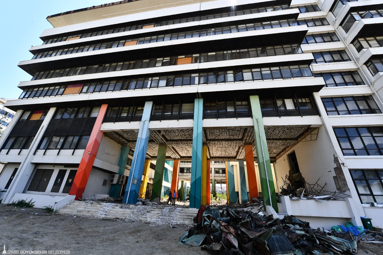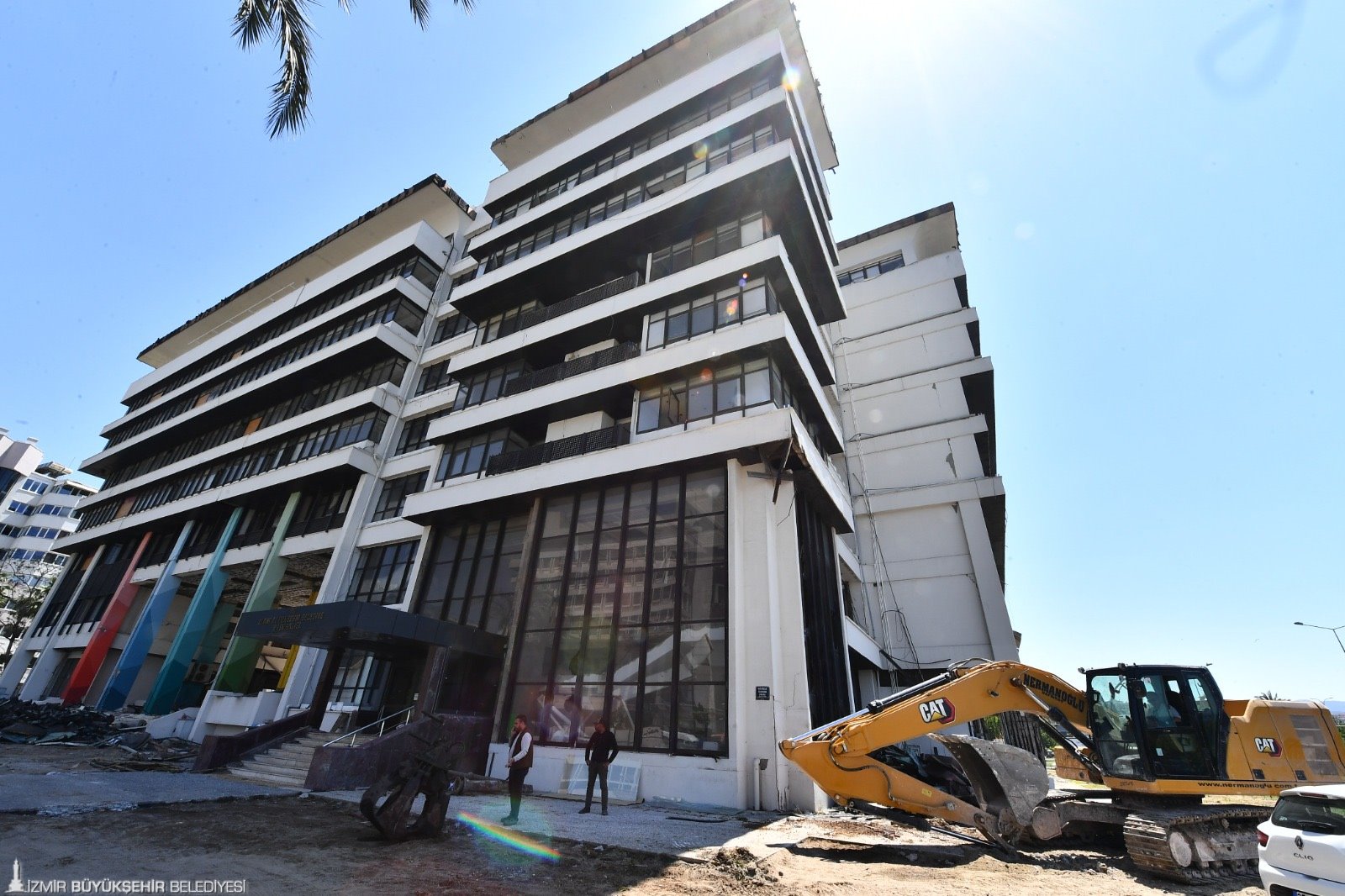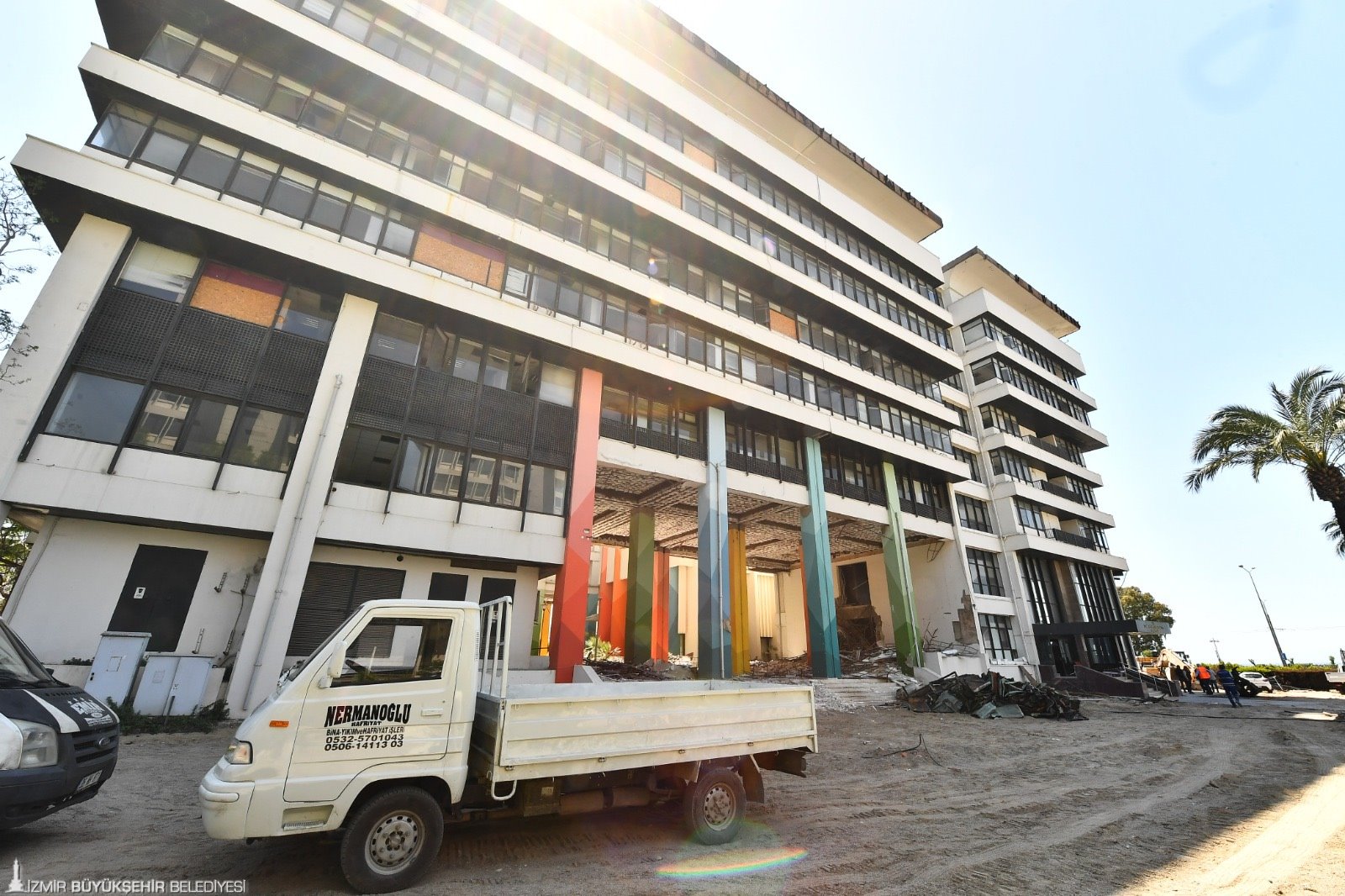 Depremde zarar gören İzmir Büyükşehir Belediyesi’nin ana hizmet binasında yıkım süreci başladı. Asbest önlemlerini alan yüklenici firmanın, çalışmaları 90 gün içerisine tamamlaması planlanıyor. Asbest söküm işleri, “Asbest Söküm Sertifikası”na sahip personel tarafından yapılıyor. Çalışmalarda İş Sağlığı ve Güvenliği, Çevre Kanunu, Tehlikeli Maddelerin Karayolu ile Taşınması yönetmeliğine harfiyen uyuluyor.