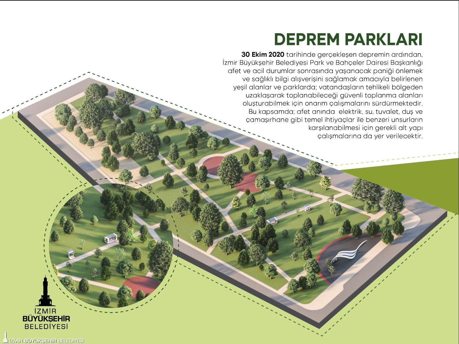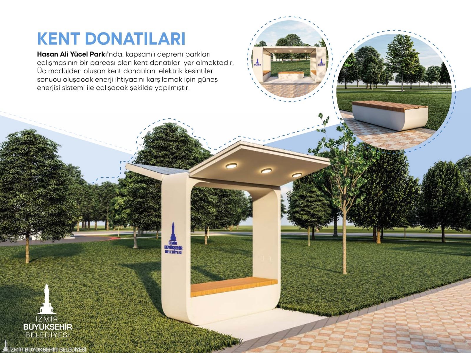 Afet ve acil durumlarda güvenli toplanma alanları oluşturabilmek için belirlenen yeşil alanlar ve parklarda onarım çalışmalarını sürdüren İzmir Büyükşehir Belediyesi, Hasan Ali Yücel Parkı’nı da bu kapsamda yeniledi ve deprem parkı haline getirdi. Afet anında elektrik, su, tuvalet, duş ve çamaşırhane gibi temel ihtiyaçların karşılanabilmesi için gerekli alt yapı çalışmalarını tamamlayan Büyükşehir Belediyesi, Hasan Ali Yücel Parkı’na da üç modülden oluşan kent donatıları yerleştirdi. Kent donatılarında elektrik kesintilerine karşı güneş enerjisi sisteminin devreye geçirilmesi sağlandı. İhtiyaç duyulan malzemelerin depolanması için oturma birimlerinin altında kilitli depolar oluşturuldu. Depolara afet sonrası çadırlar kurulana kadar barınma amaçlı kullanmak üzere brandalar yerleştirildi.