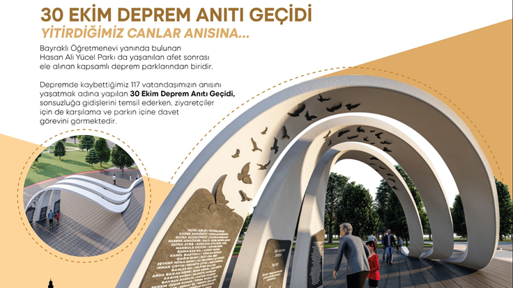 İzmir Büyükşehir Belediyesi, 30 Ekim İzmir depreminin yıl dönümünde düzenlediği anma programı kapsamında Bayraklı Öğretmenevi yanındaki Hasan Ali Yücel Parkı’nda 30 Ekim Deprem Anıtı’nı açmaya hazırlanıyor. Büyükşehir Belediyesi’nin deprem parkları projesi kapsamında yenilediği, afet ve acil durumlar için güvenli toplanma alanı olarak tasarladığı Hasan Ali Yücel Parkı, depremde vefat eden 117 kişinin anısı için yapılan Deprem Anıtı ile anlam kazanıyor.