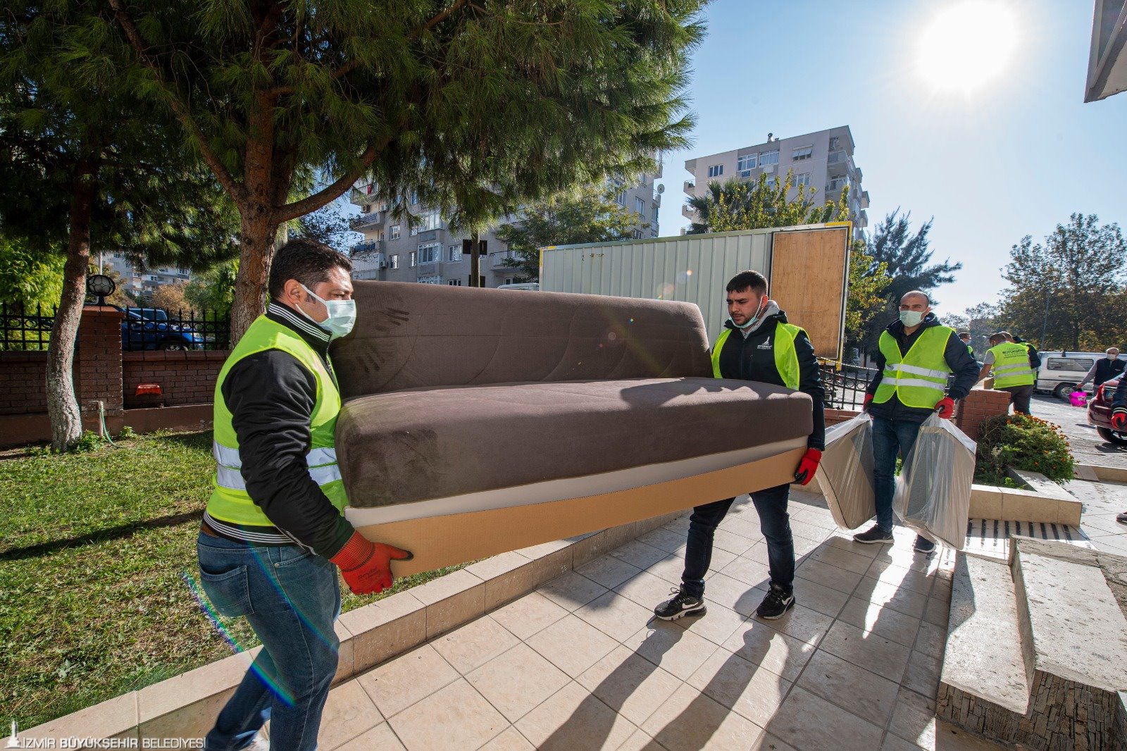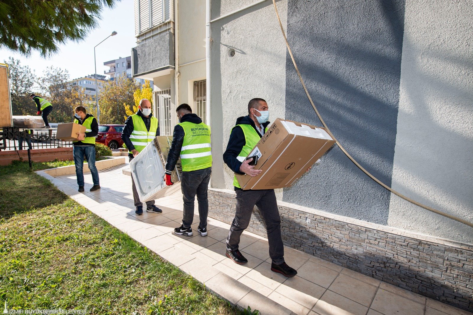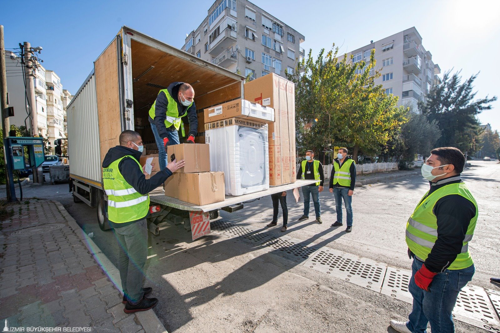 İzmir Büyükşehir Belediyesi, depremde evleri ağır ve orta derecede hasar gören afetzede ailelerin yeni evlerindeki eşya gereksinimleri karşılamak de için yoğun bir çaba harcıyor. İzmir Büyükşehir Belediyesi’ne yapılan başvuru sonrası incelemeleri tamamlanan 147 hanenin buzdolabı, çamaşır makinesi, televizyon, kanepe, setüstü ocak, yatak gibi ihtiyaçları teslim edildi. Bu ailelere gıda ve hijyen paketi verildi, giysi ihtiyaçları da giderildi. Ayrıca yine 233 haneye gıda ve hijyen paketi verilerek giysi desteği sağlandı.